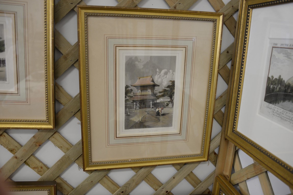 Set of four colored lithographic views from Perry’s Expedition of an American Squadron to the China Seas and Japan, three af after William Heine and one after E. Brown Jr. lithograph by Sarony including Temple at Hakotadi, Visit to Shui, Chief Temple Hakodadi, and Conference Room Hakodadi, sight size 7 3/4 x 10 1/2 to 10 1/4 x 8. Provenance: Property from Credit Suisse’s Americana Collection