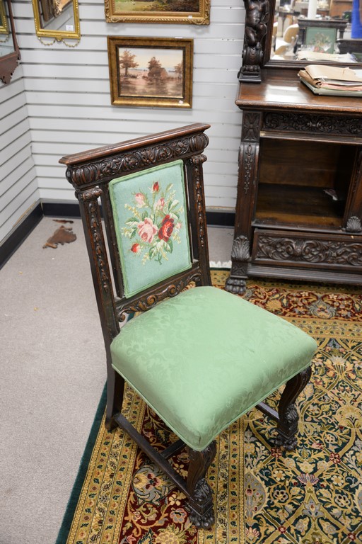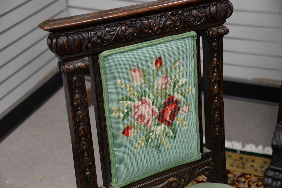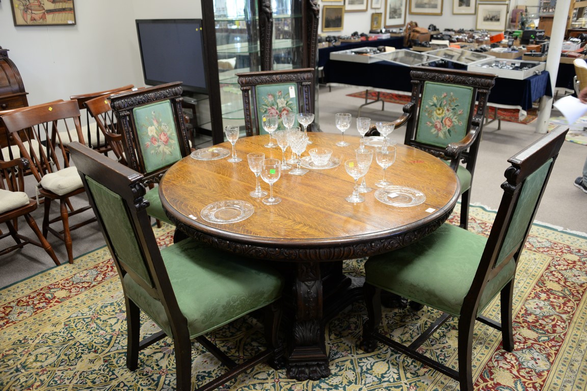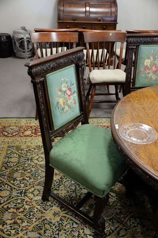 Seven piece oak dining set to include round oak table on carved pedestal base with claw feet with four 11 inch leaves and six matching chairs with needlepoint seats and backs. ht. 28in., dia. 54in., top open: 54 x 98
