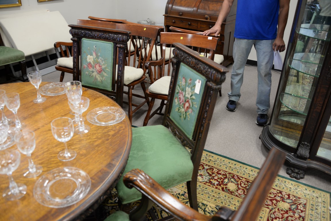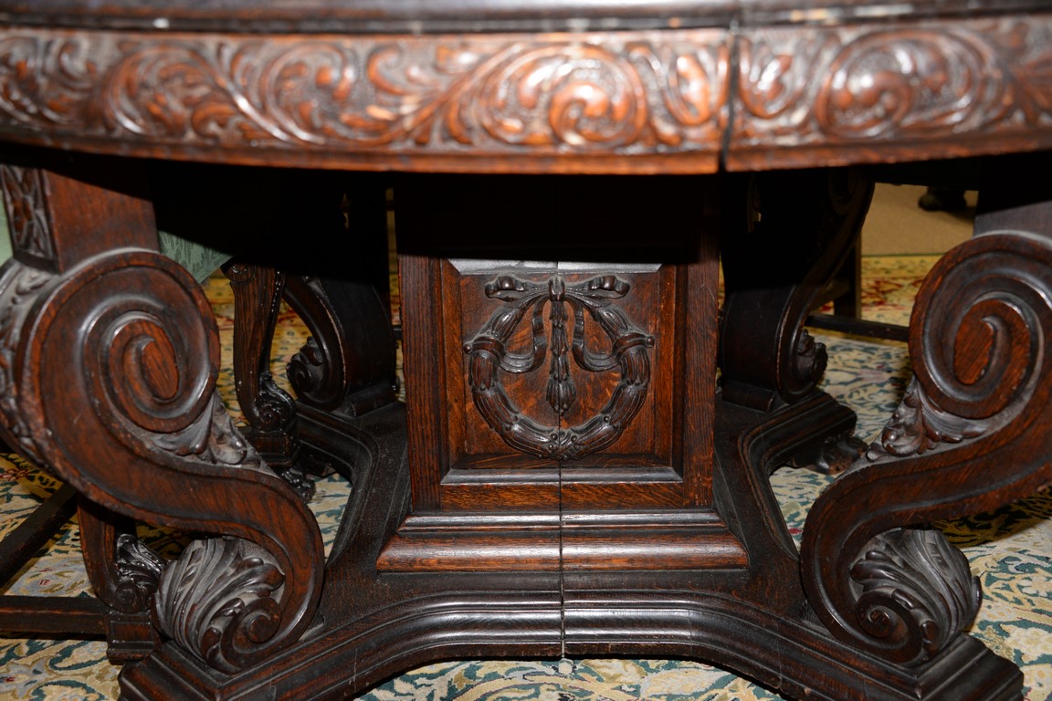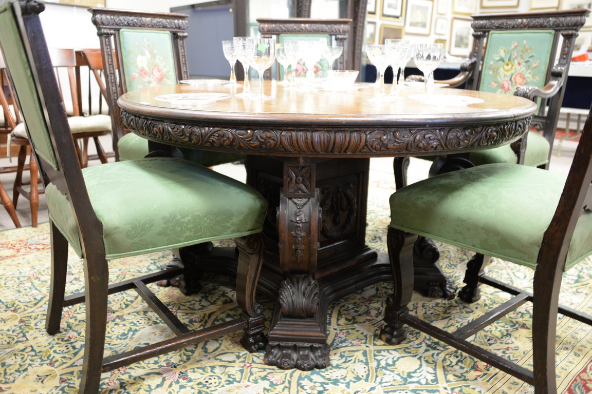 Lot 227: Seven piece oak dining set to include round oak table on carved pedestal base with claw feet with four 11 inch leaves and six matchi…