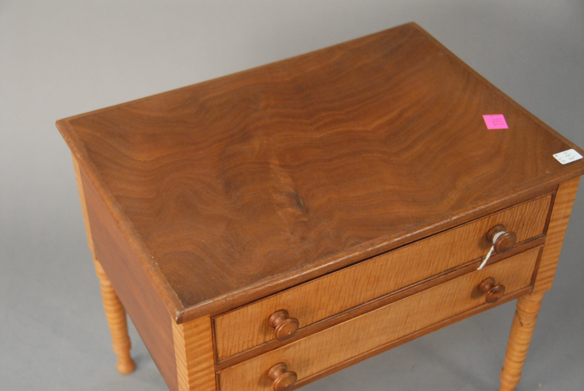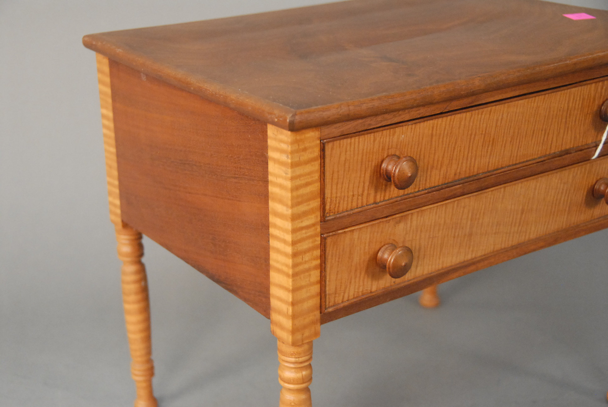 Sheraton diminutive stand, mahogany with tiger maple. ht. 12 in. wd. 14 in. dp. 10 in.