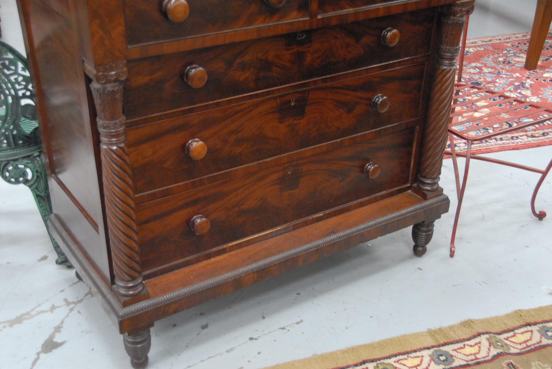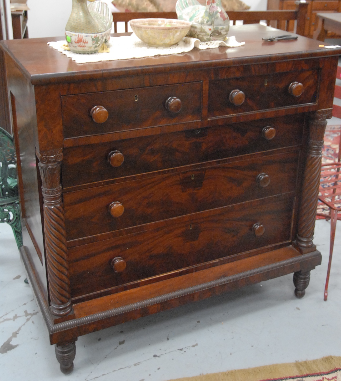 Sheraton mahogany chest with turned columns and feet, circa 1830.