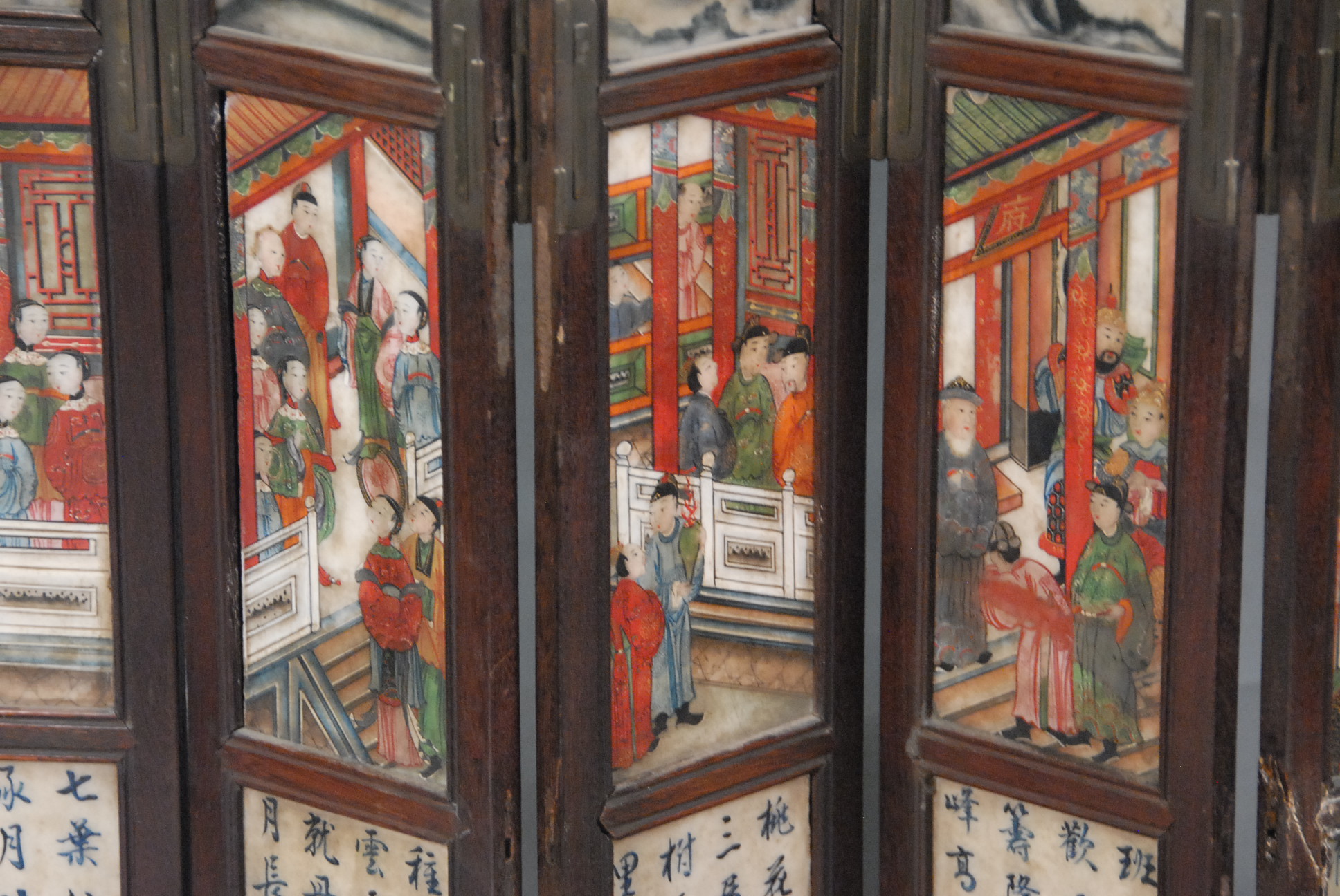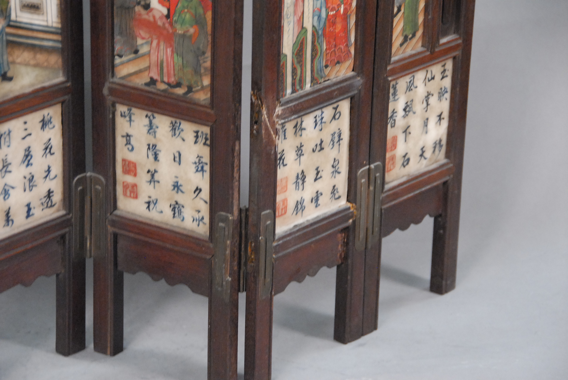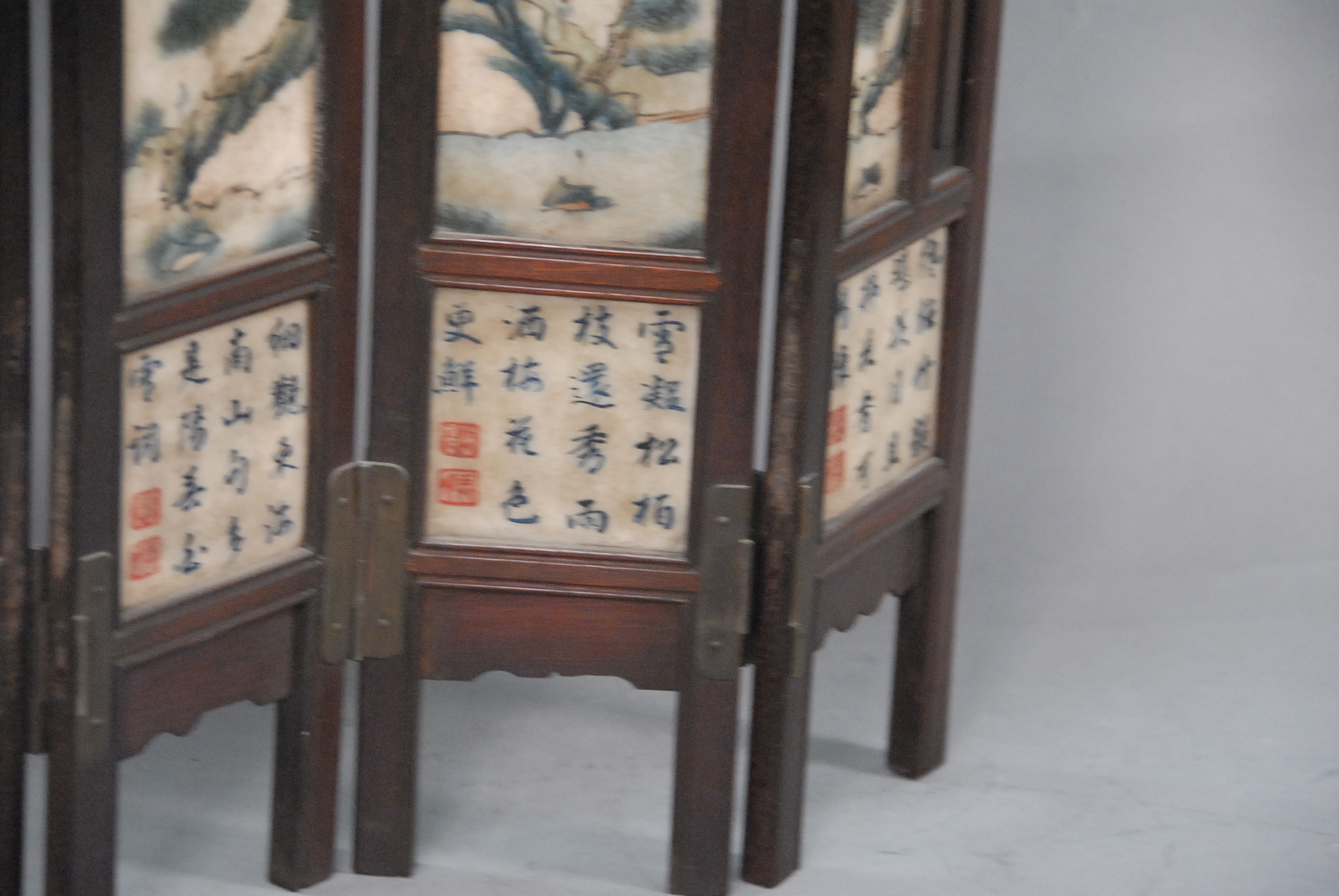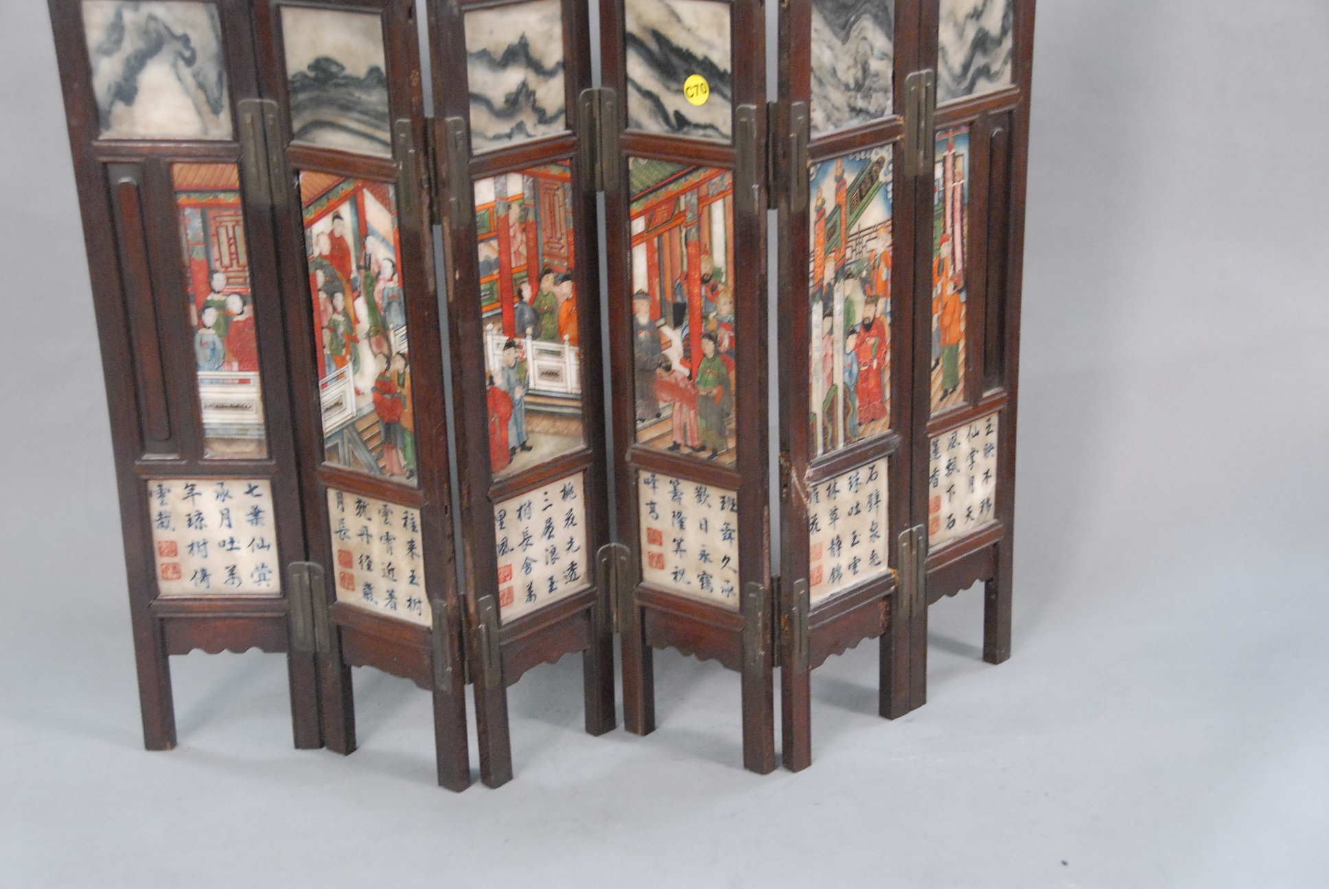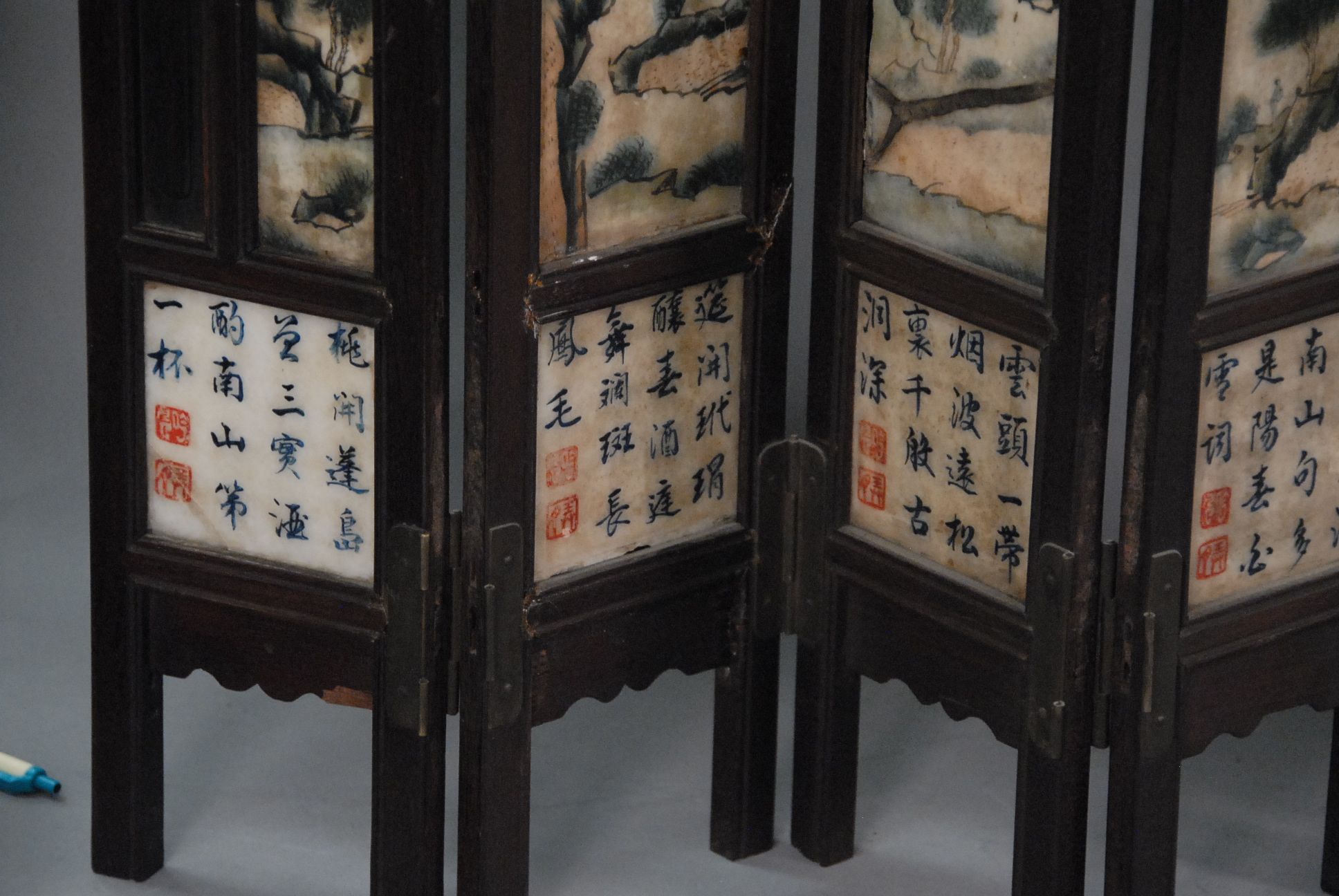 Six panel Chinese table stand with natural and painted stone panels of courtiers and calligraphy, Qing.