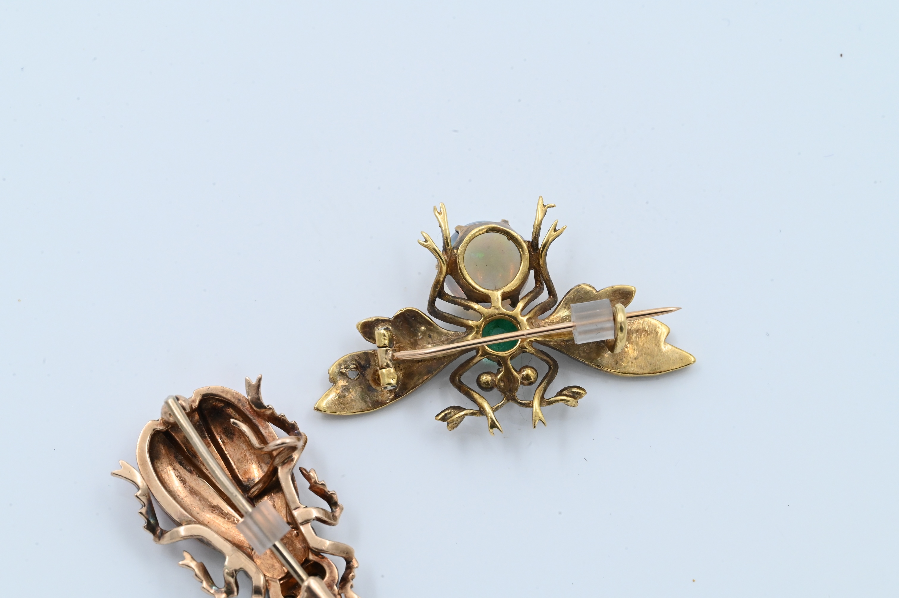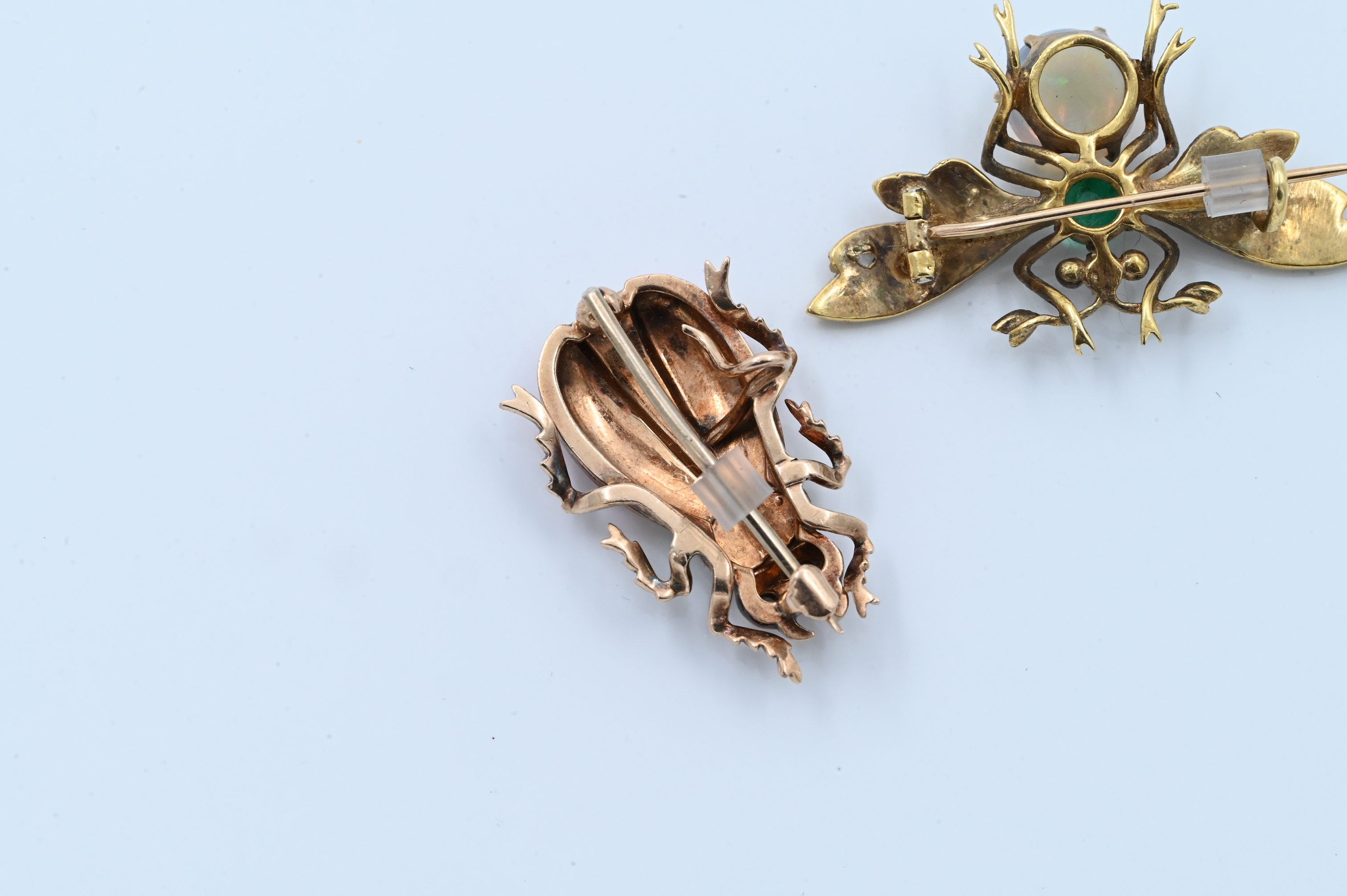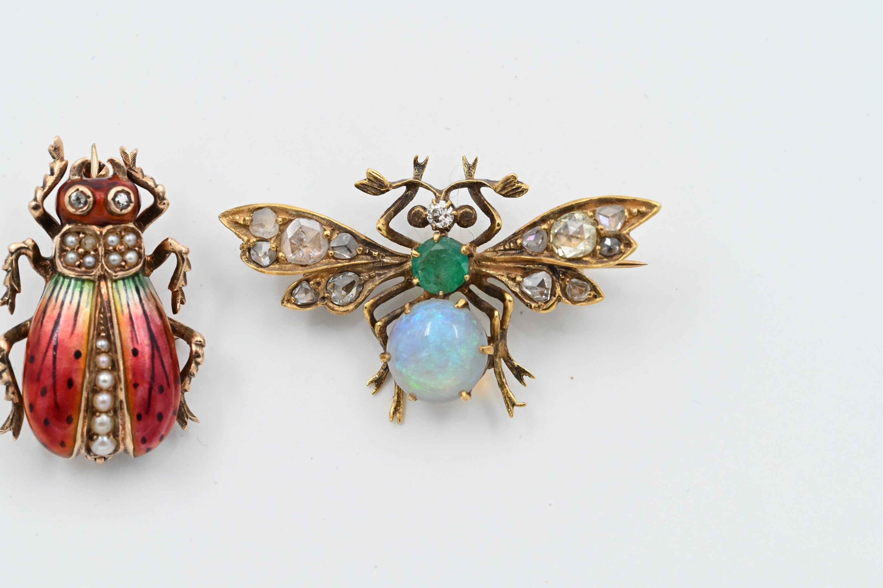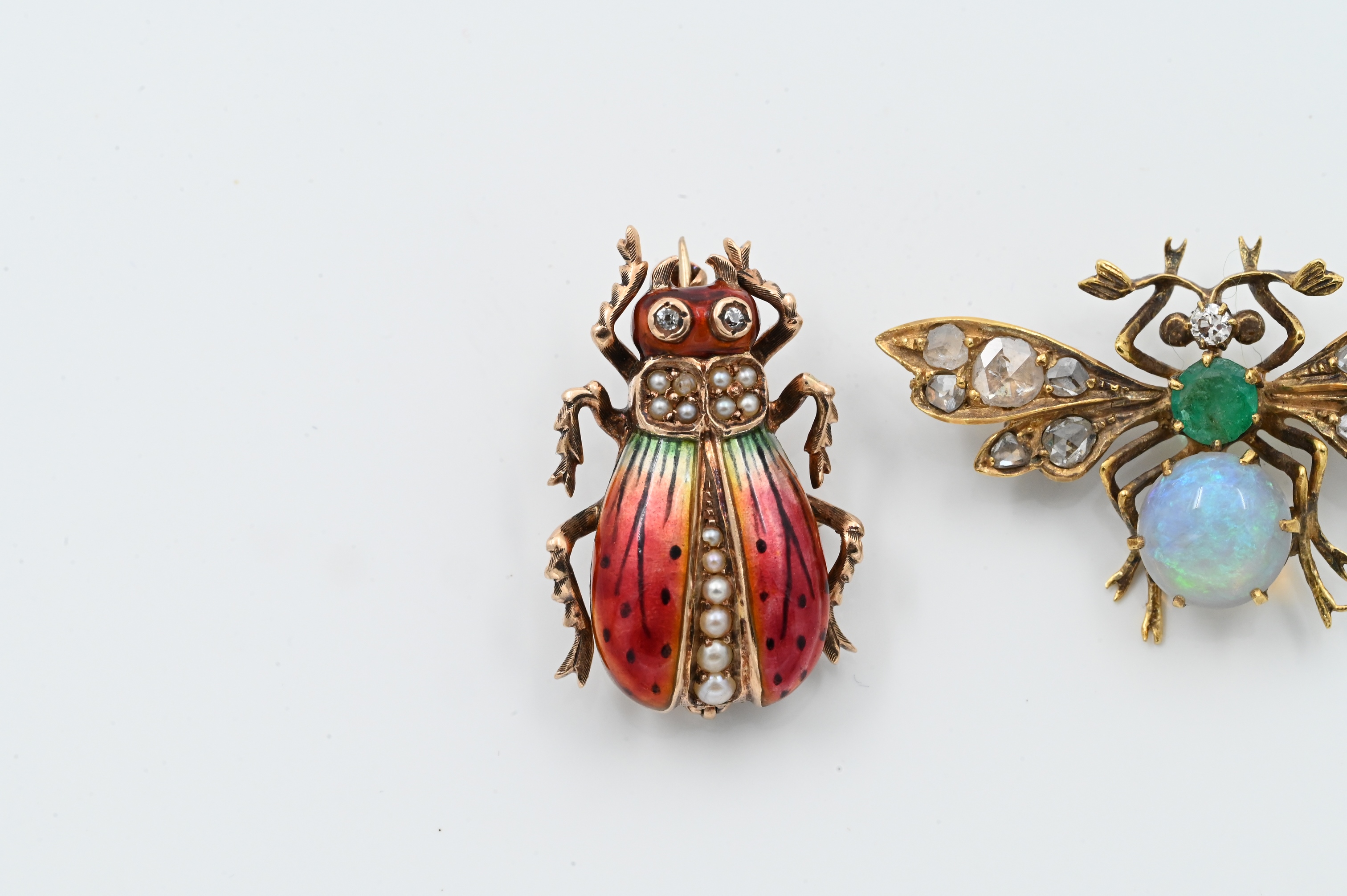 one having opal and emerald body, wings set with rose cut diamonds, the other a yellow gold enameled beetle with seed pearls and small diamond eyes