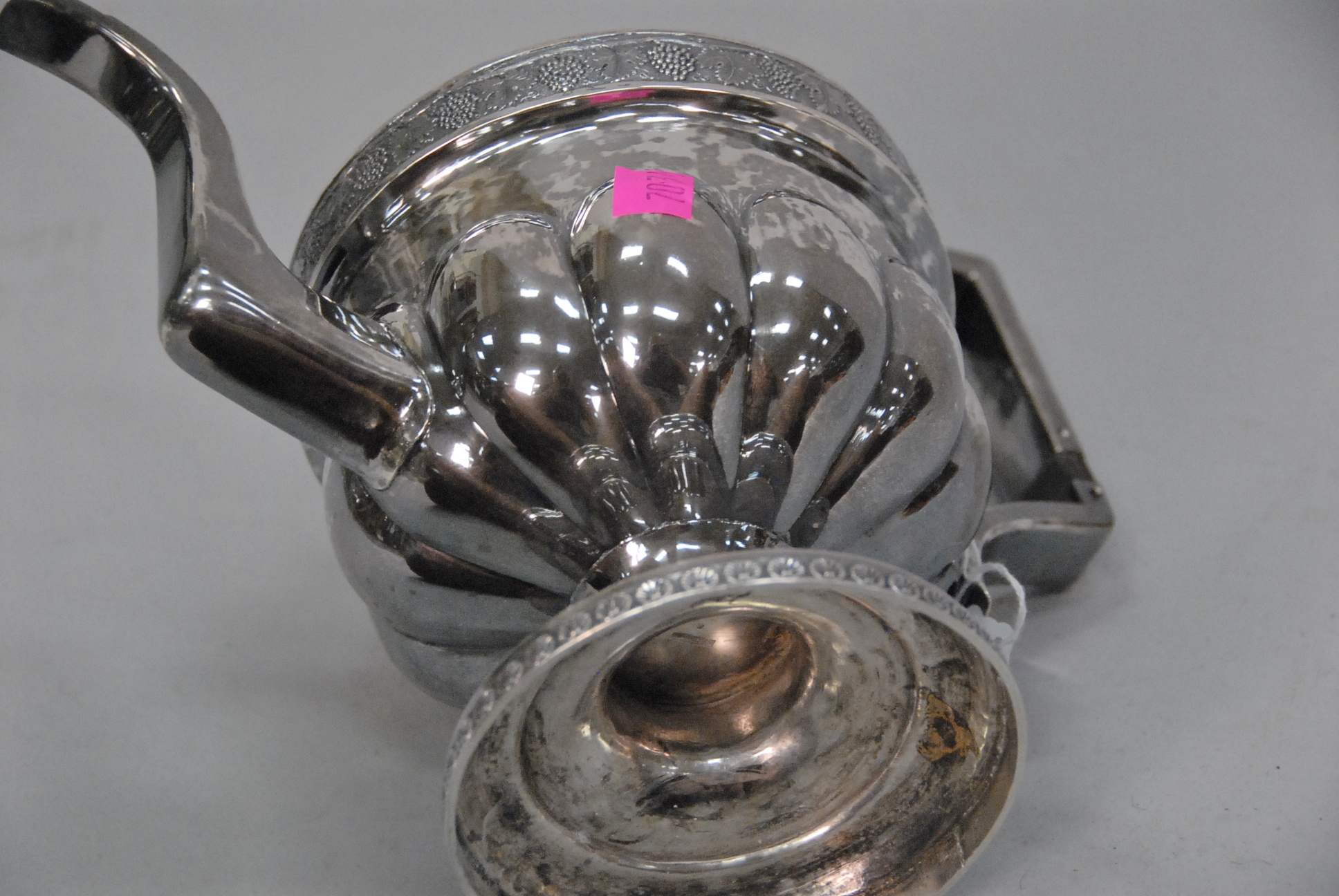 Lot 227: W. Thompson American coin silver three piece tea set to include teapot, covered sugar bowl and creamer, all melon shaped with chased bunches of grapes 56.7 t oz., ht. 6in. – 9 1/2in.
