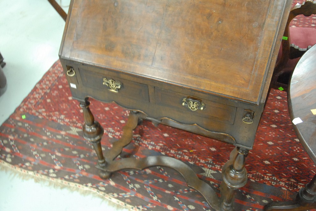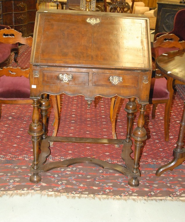Lot 227: William and Mary style burlwood drop front desk with drawer on turned legs and flat stretcher base.