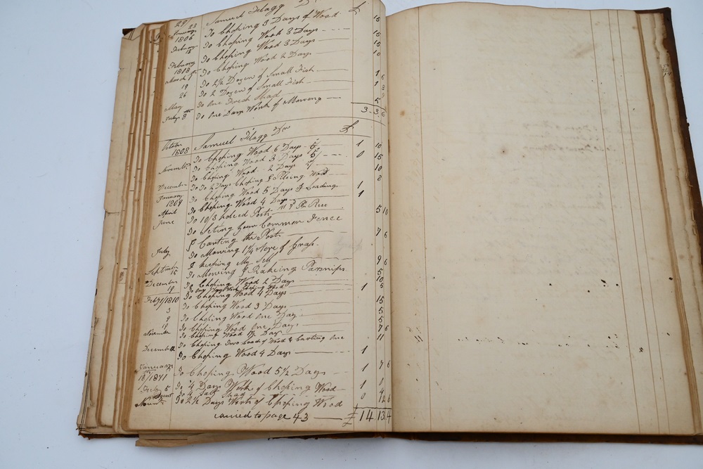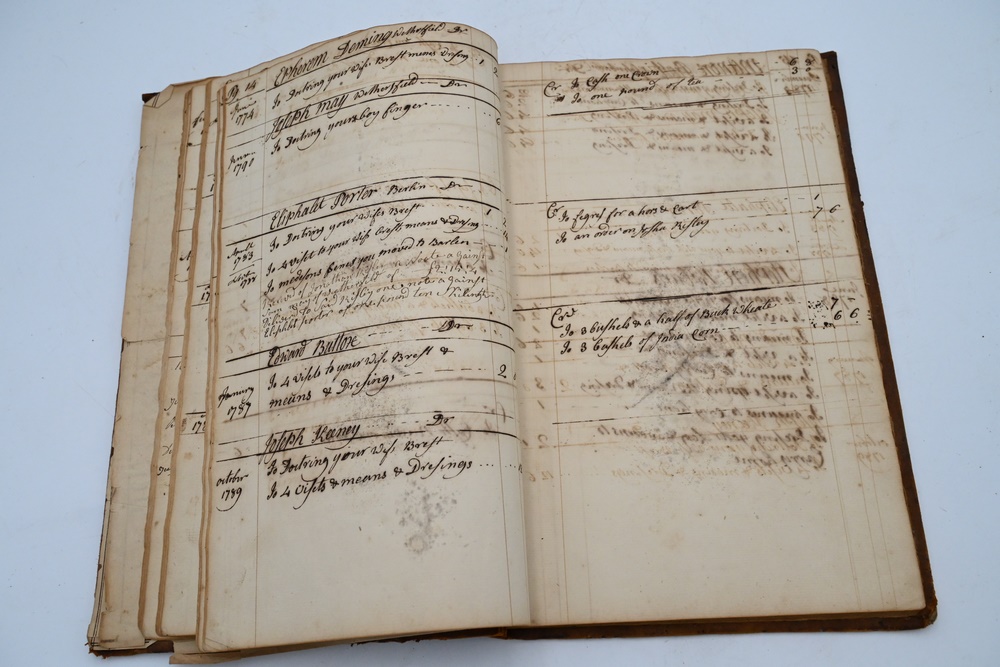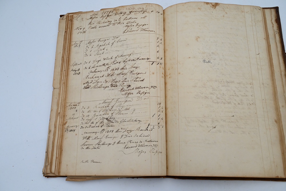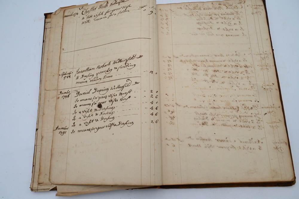 Lot 227A: Account Ledger 18th – 19th century local Wethersfield, Hartford, Farmington, Wells, Roberts, Deming, Boardman, Bissell, entry names Provenance: Fifty Year Personal Collection of Clocks and American Antiques from Thomas Bailey, Manchester, Connecticut.