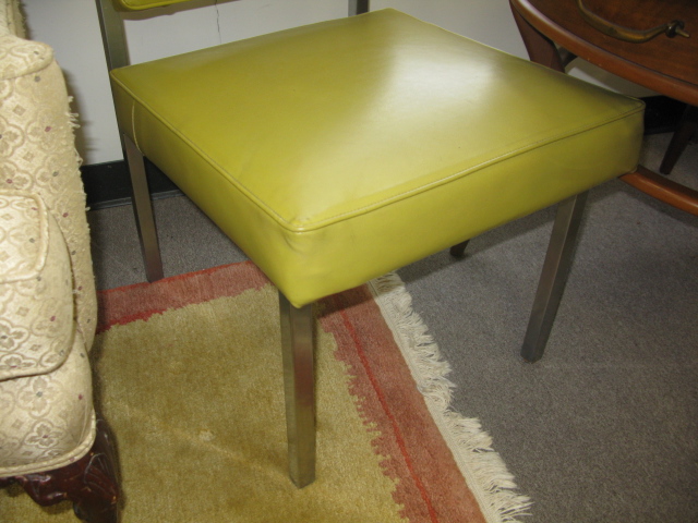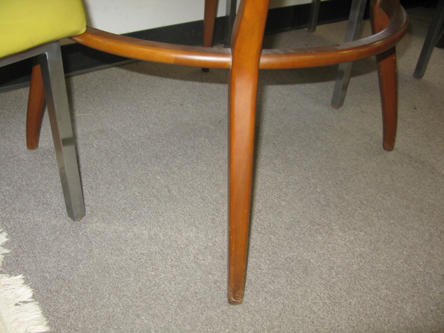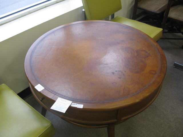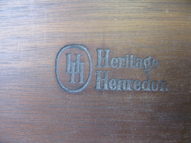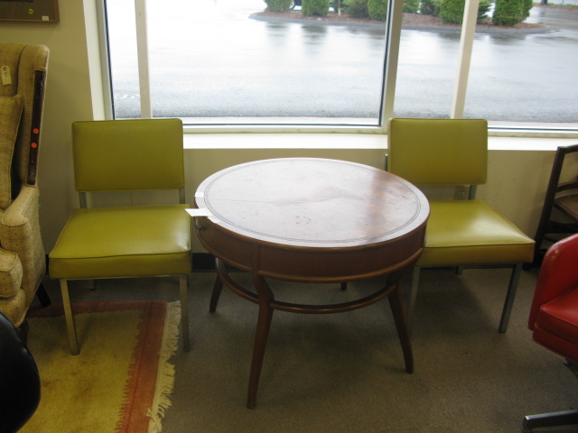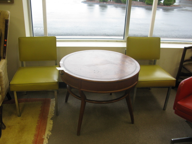 Three piece lot to include Heritage Henredon leather top cherry table and two chairs with chrome bases