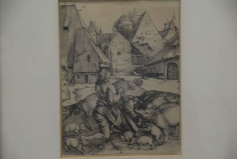 Albrecht Durer engraving THE PRODIGAL SON initialed lower center AD and Paris stamp on reverse along with a framed print from a book 10 x 7 3/4.