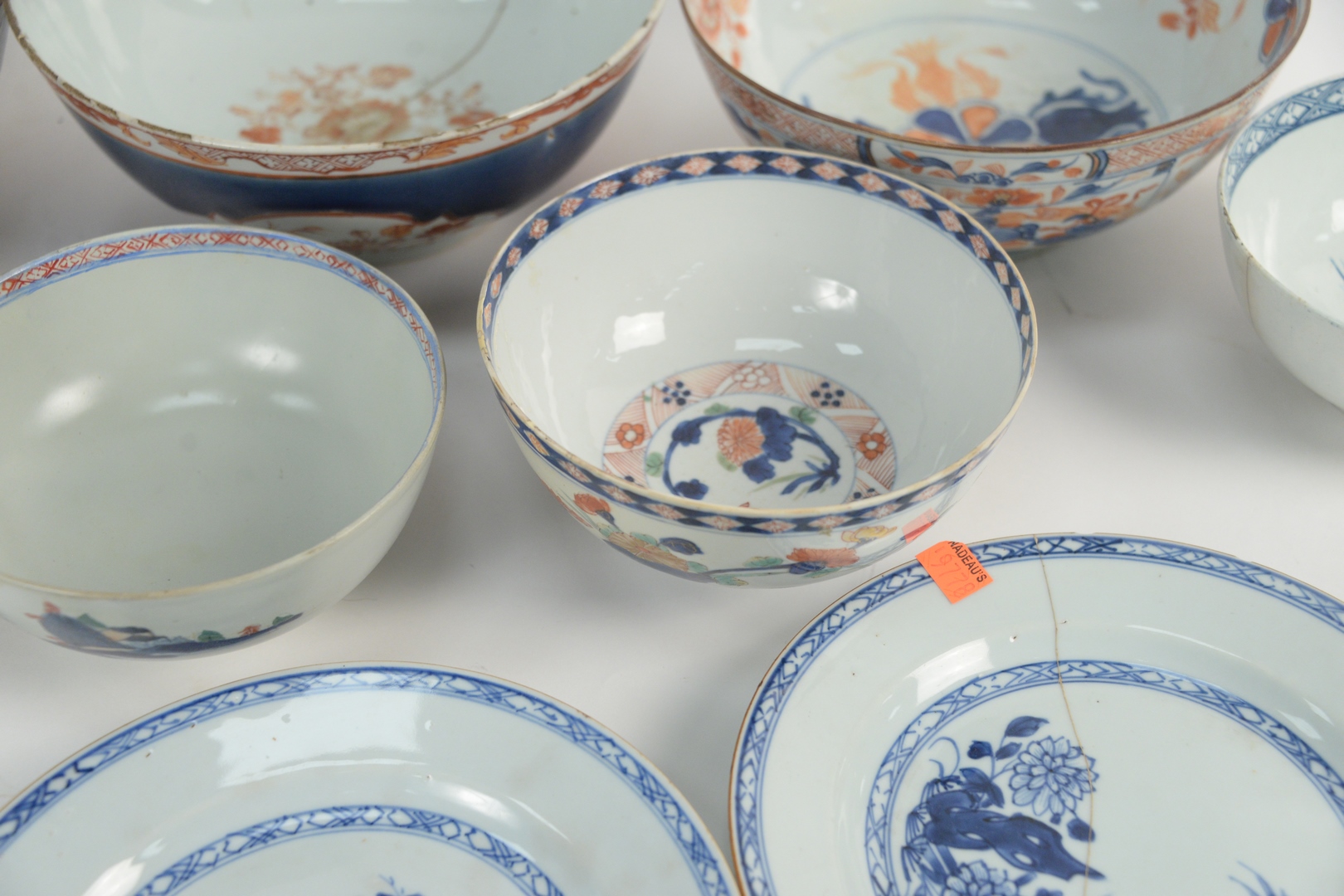 Eleven Piece Lot of Chinese Export to include various bowls and plates with repairs, largest height 4 inches, diameter 9 1/2 inches. Provenance: From a Newport, Rhode Island historic home, in the same family since 1761.