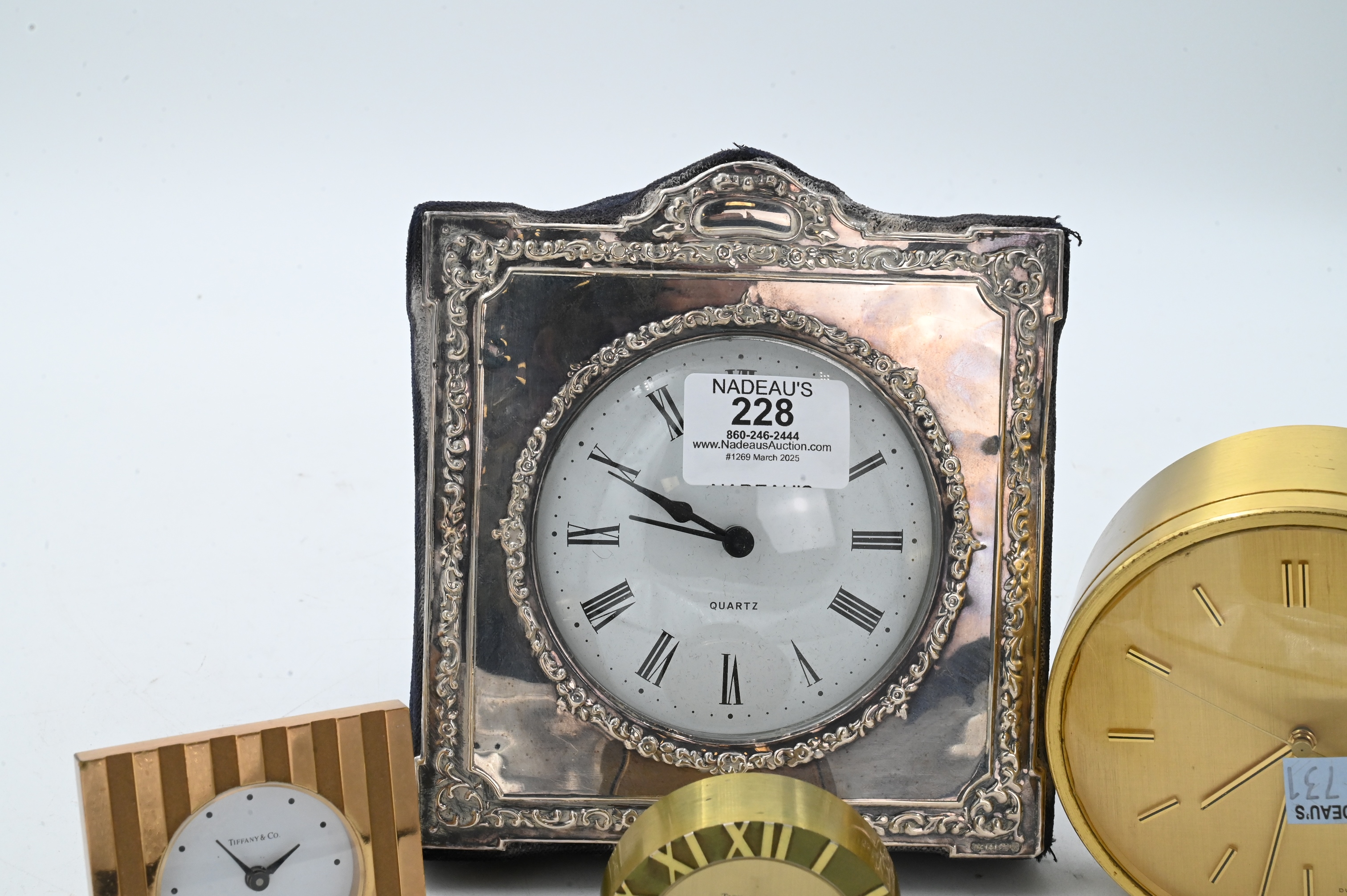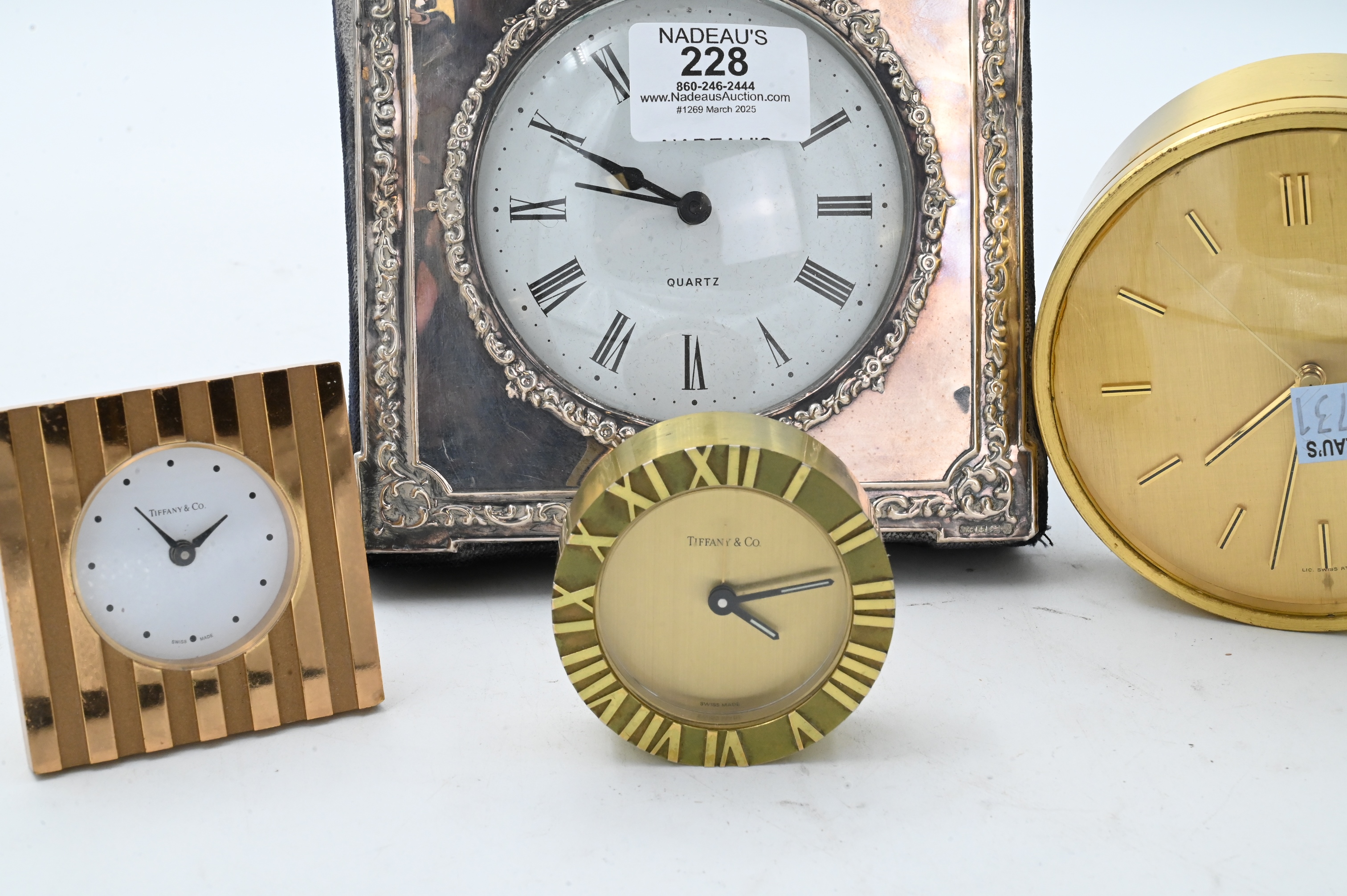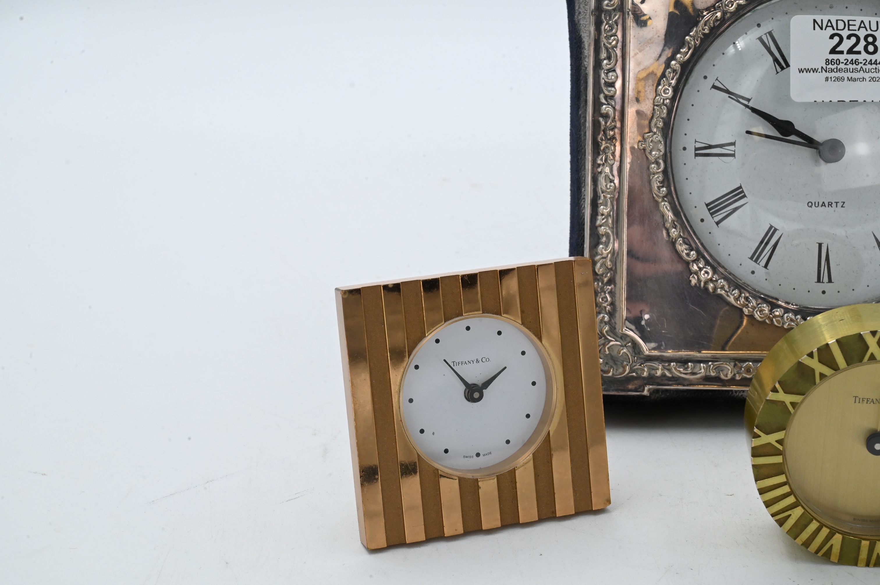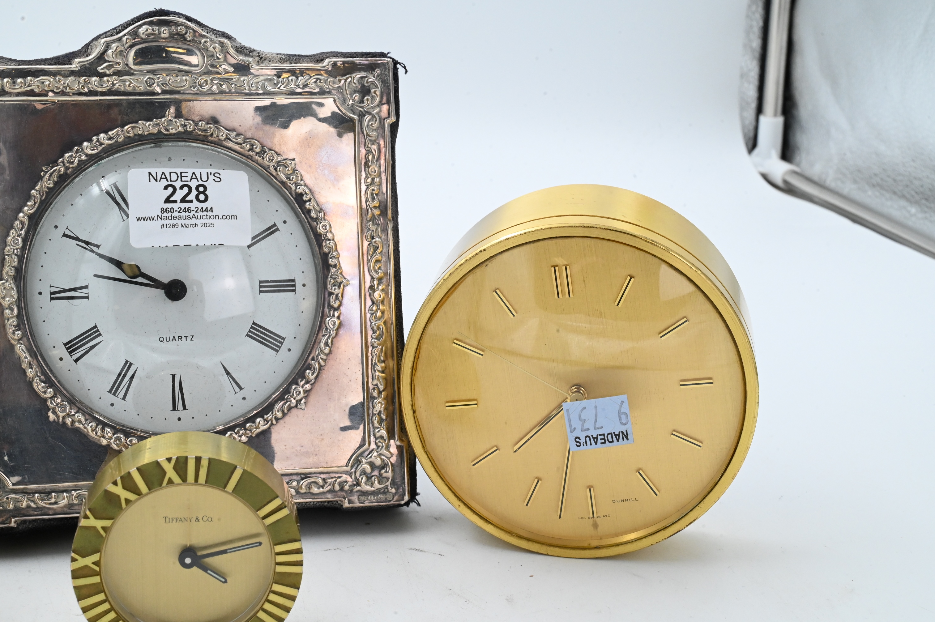 to include Tiffany “Atlas” travel clock, square Tiffany Atlas desk clock, brass Dunhill clock, along with silver repousse clock hallmarks lower right
