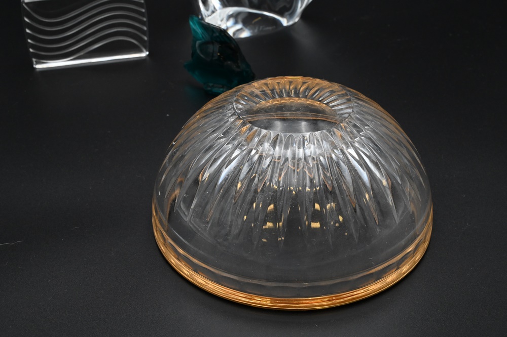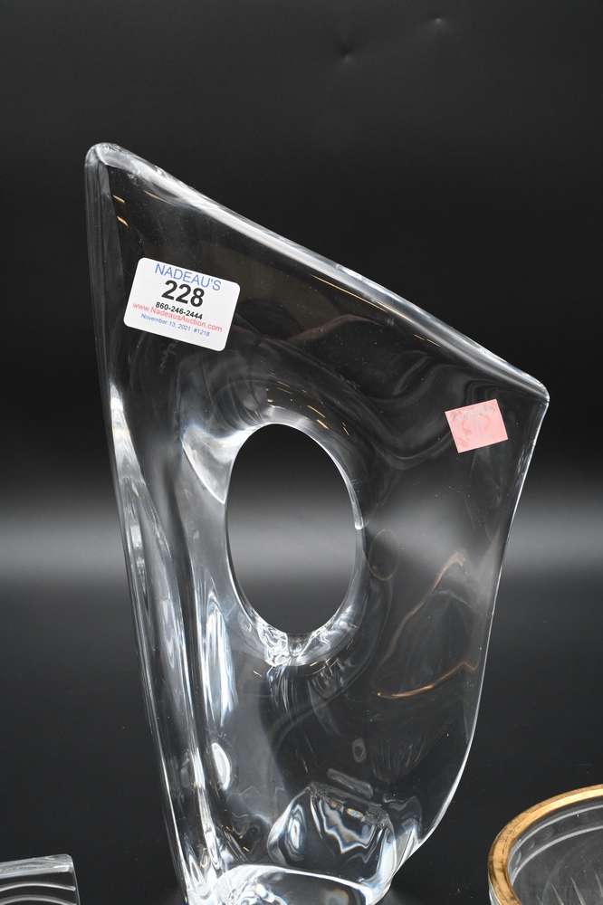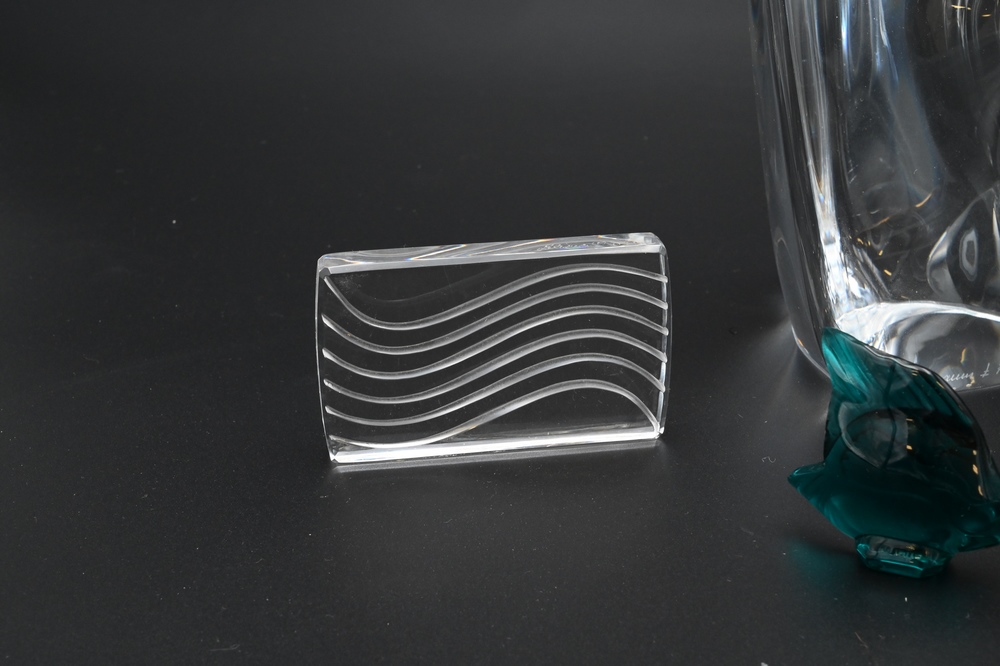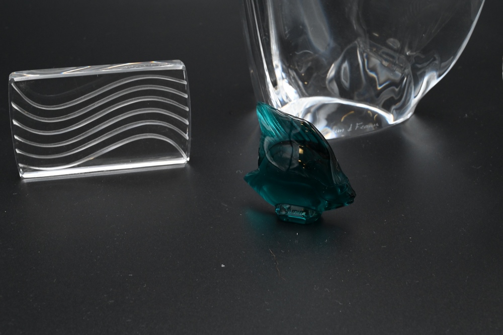 Lot 228: Four Piece Group of Glass, to include a Daum Nancy Monumental freeform vase, height 11 3/4 inches; Lalique blue fish; Lalique paperweight; along with a Waterford bowl.