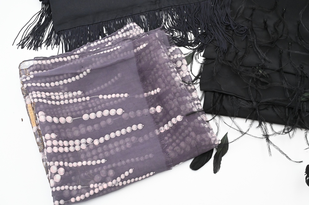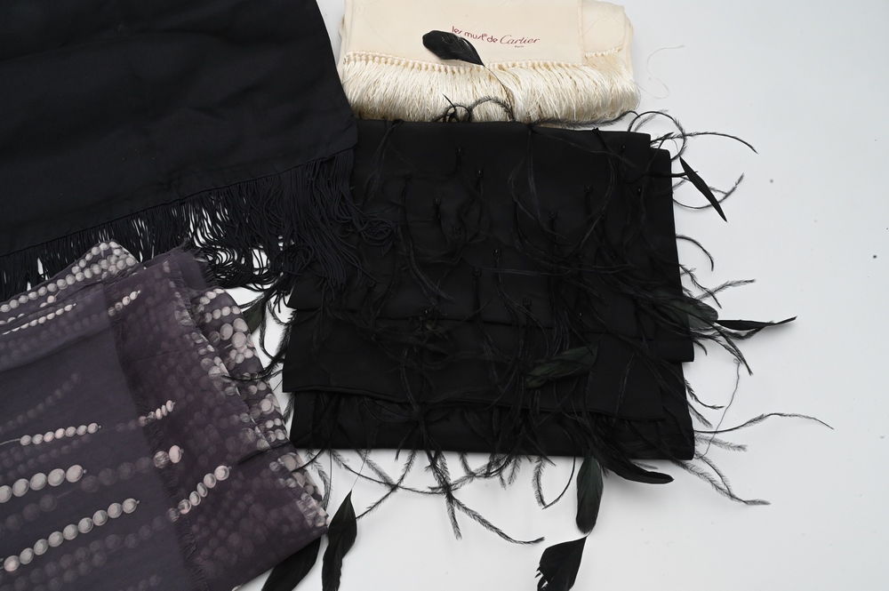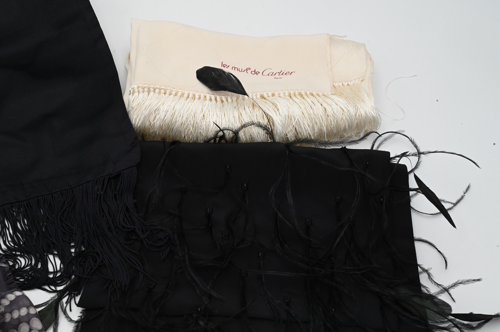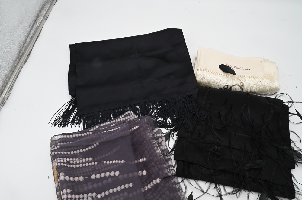 Lot 228: Four Silk Scarves, to include Bottega Veneta, peacock feather, Giorgio Armani, along with Les Must de Cartier.