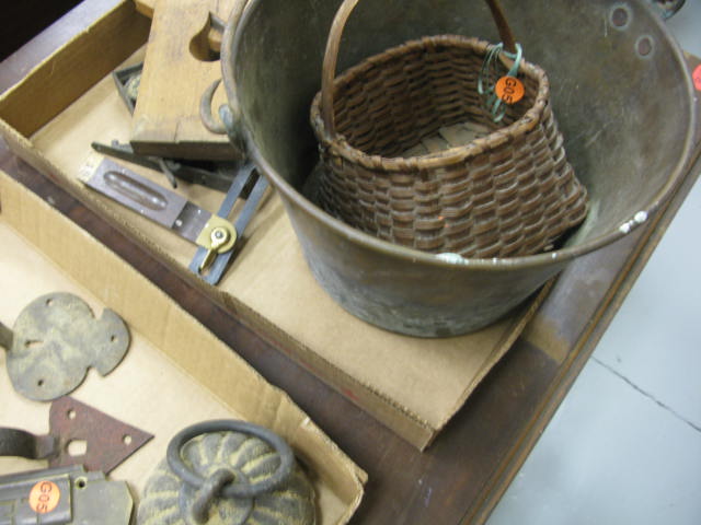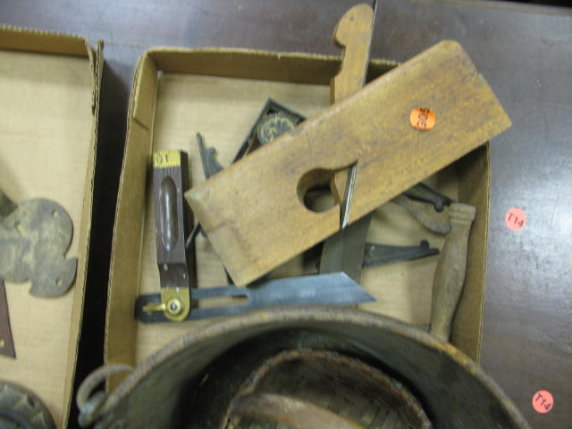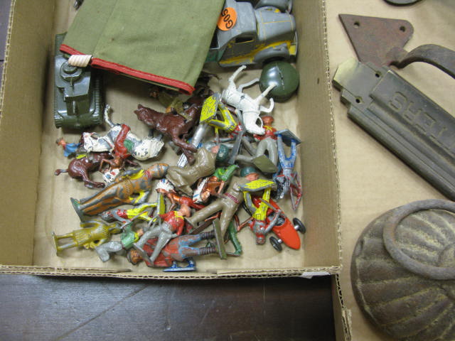 Group lot of three boxes, curios, lead soldiers, brass buckets, plane, cowboy and soldier figures, two metal trucks, metal tank, metal door handles, etc