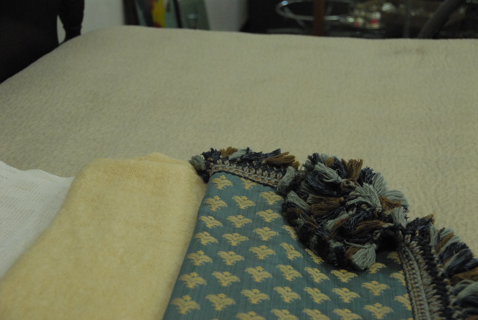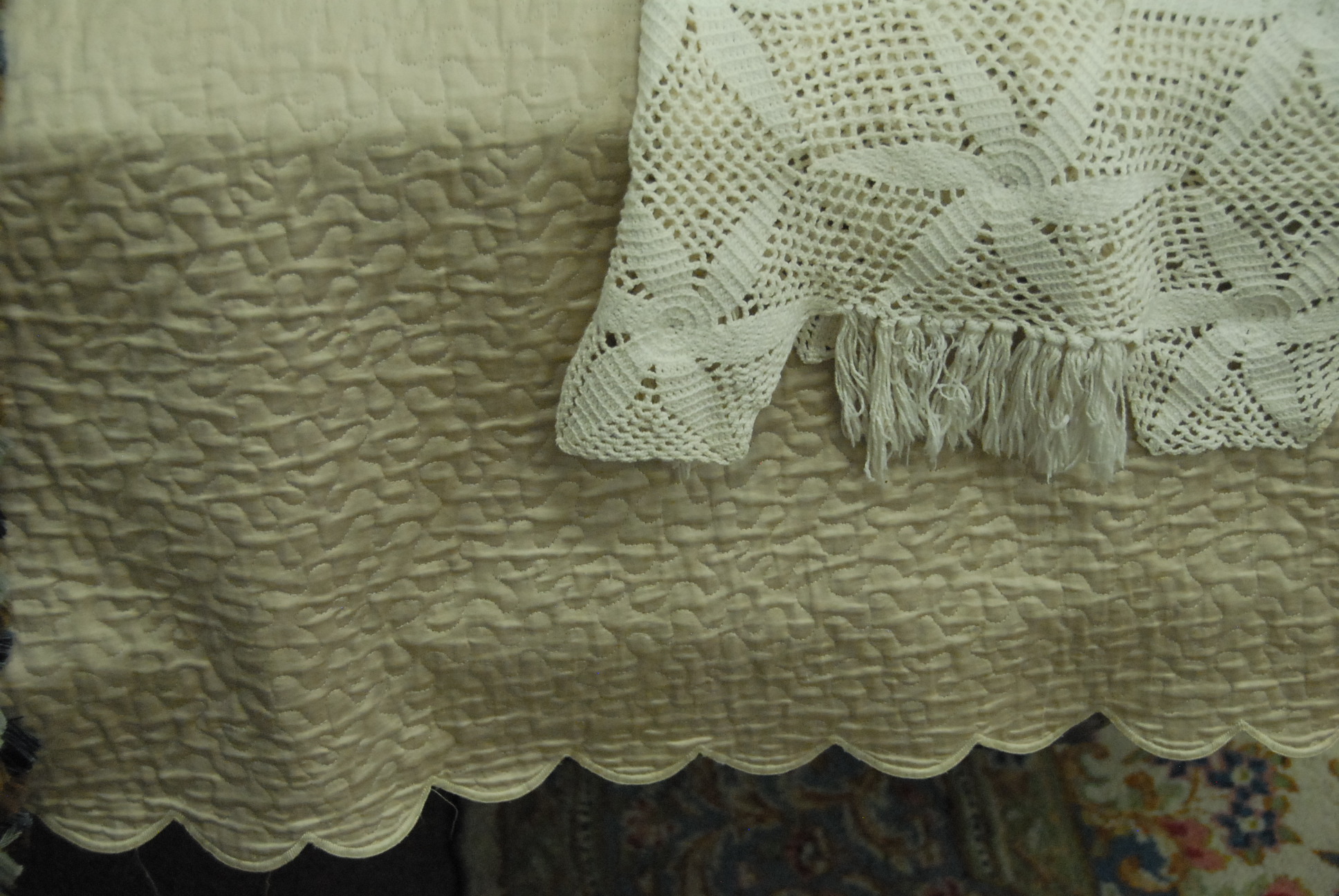 Group of five blankets to include Glen Cree mohair throw cover, Faribo throw cover, silk throw cover with fringes, king size Home Treasures comforter, and another bed cover.