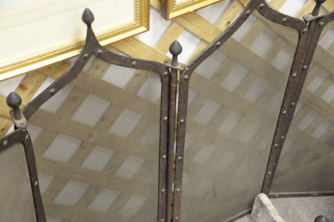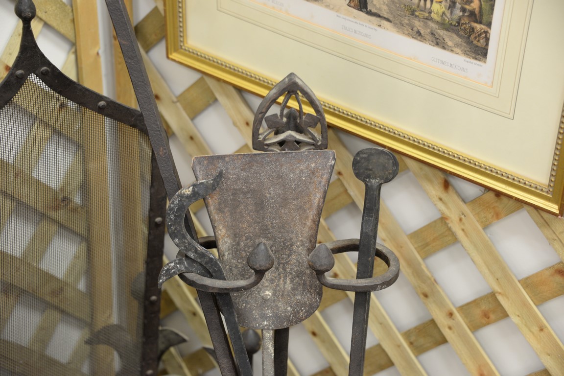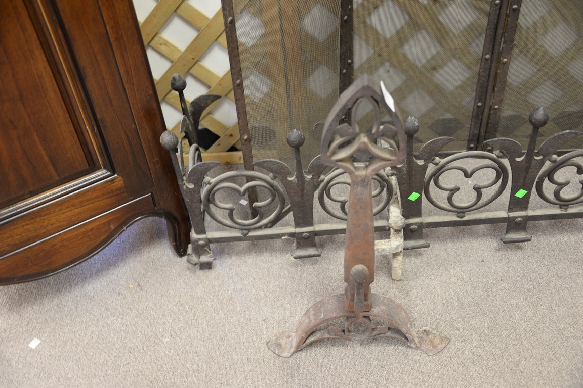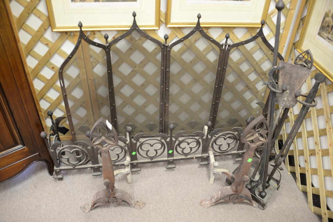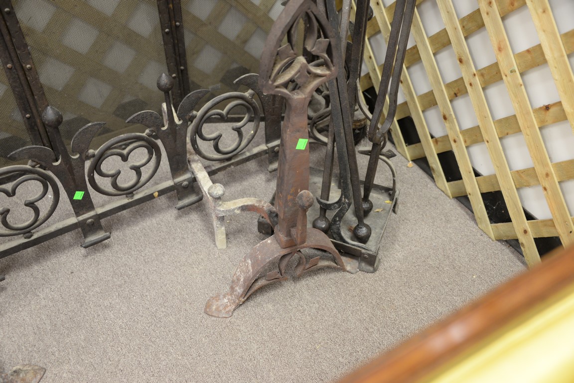 Lot 228: Iron gothic style andirons, tools, and screen. log ht. 25in., screen: ht. 35 1/2in., wd. 51in.