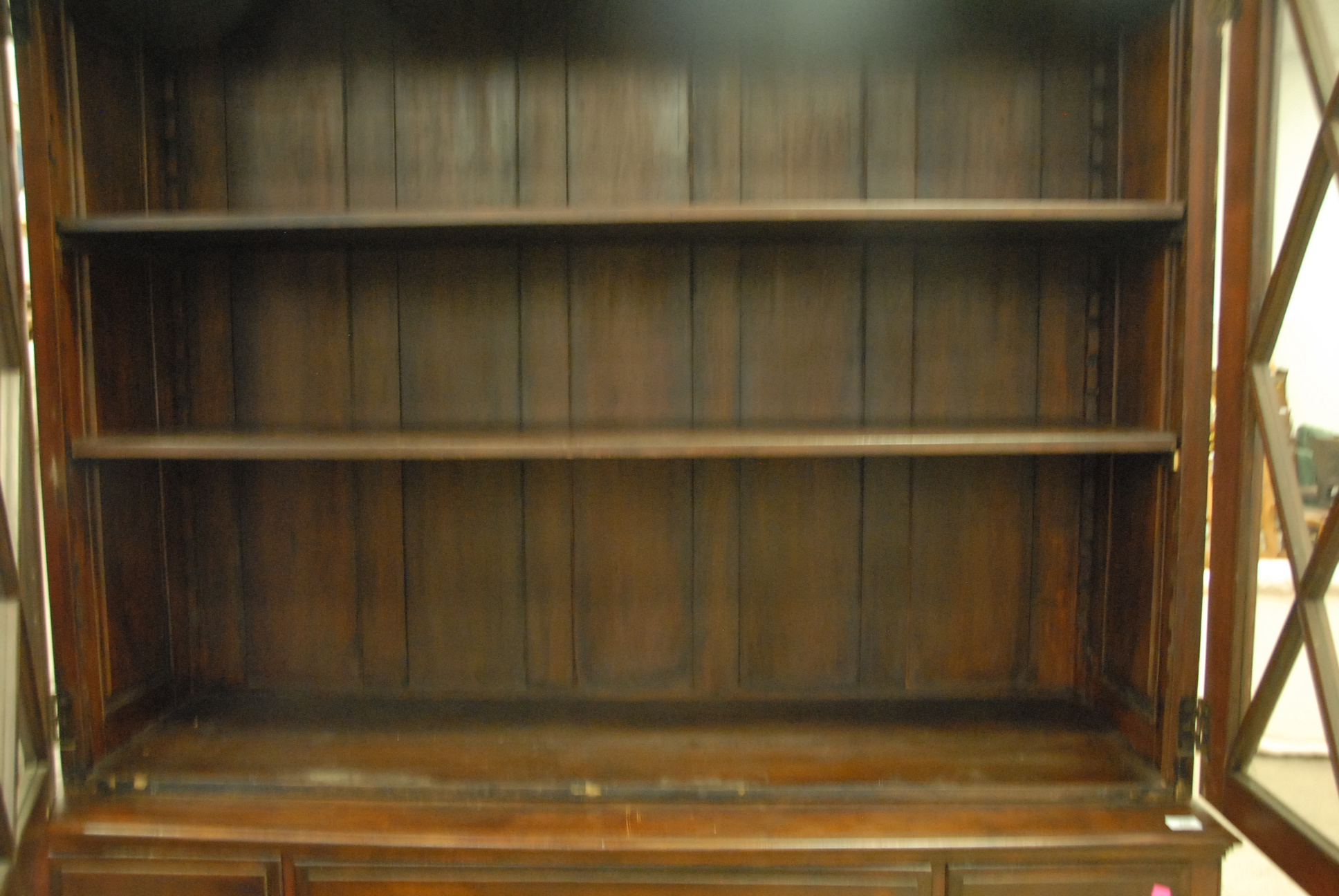 Lot 228: Large mahogany cabinet having two glass doors on top over six drawer base, ht. 87in. wd. 66in.