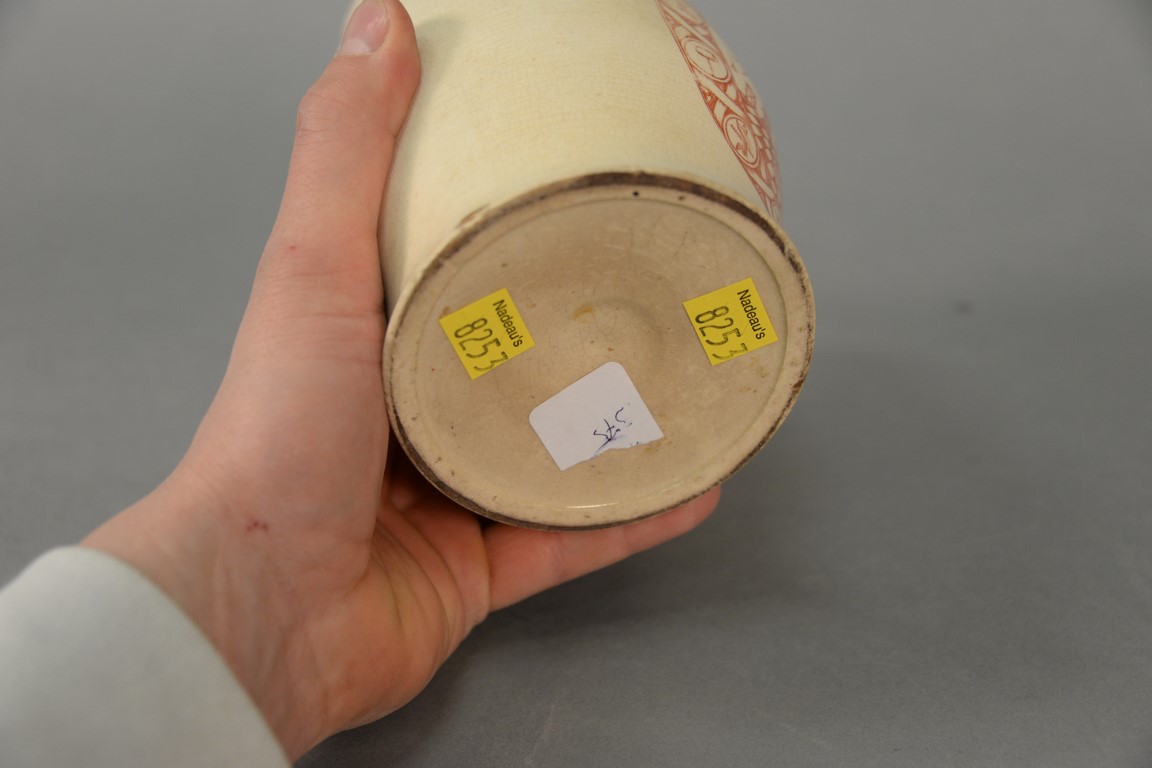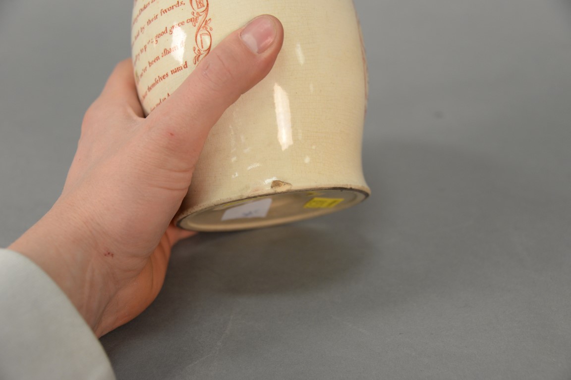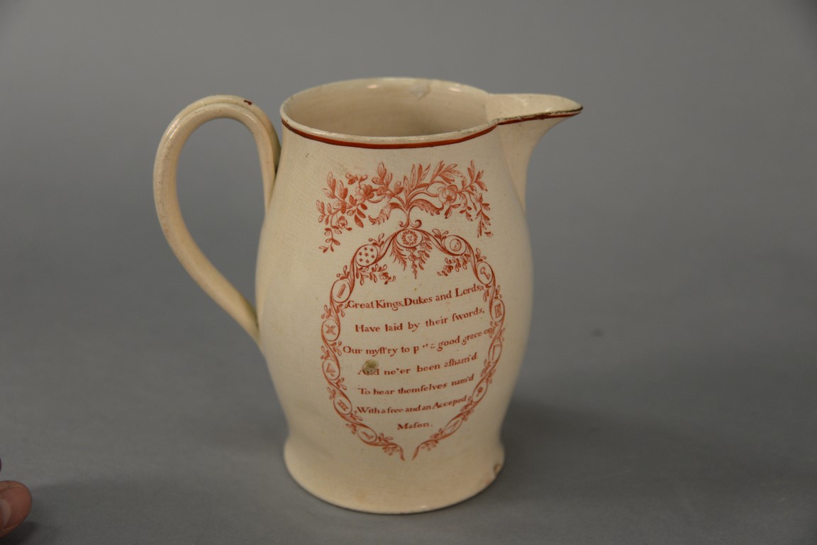 Lot 228: Masonic Liverpool pitcher, painted in red Free Mason symbols on one side and a poem on the opposing side, 19th century. minor chip…