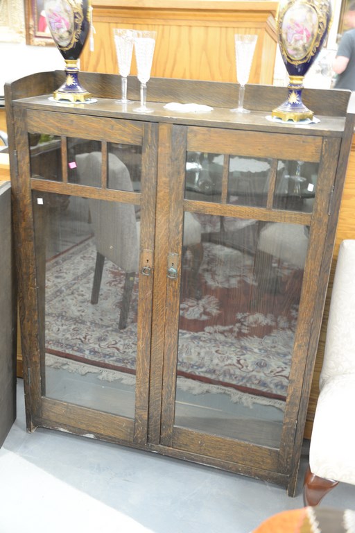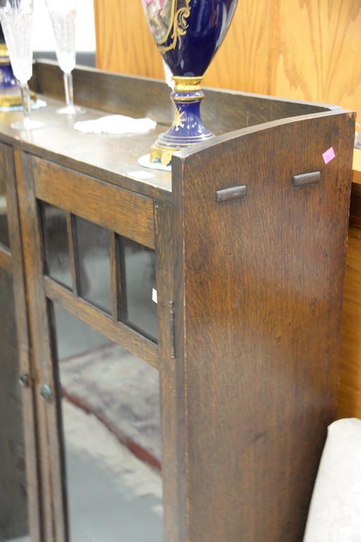 Mission oak style bookcase with two glass doors opening to four shelves. ht. 55 1/2 in. wd. 43 1/2 in. dp. 12 in.