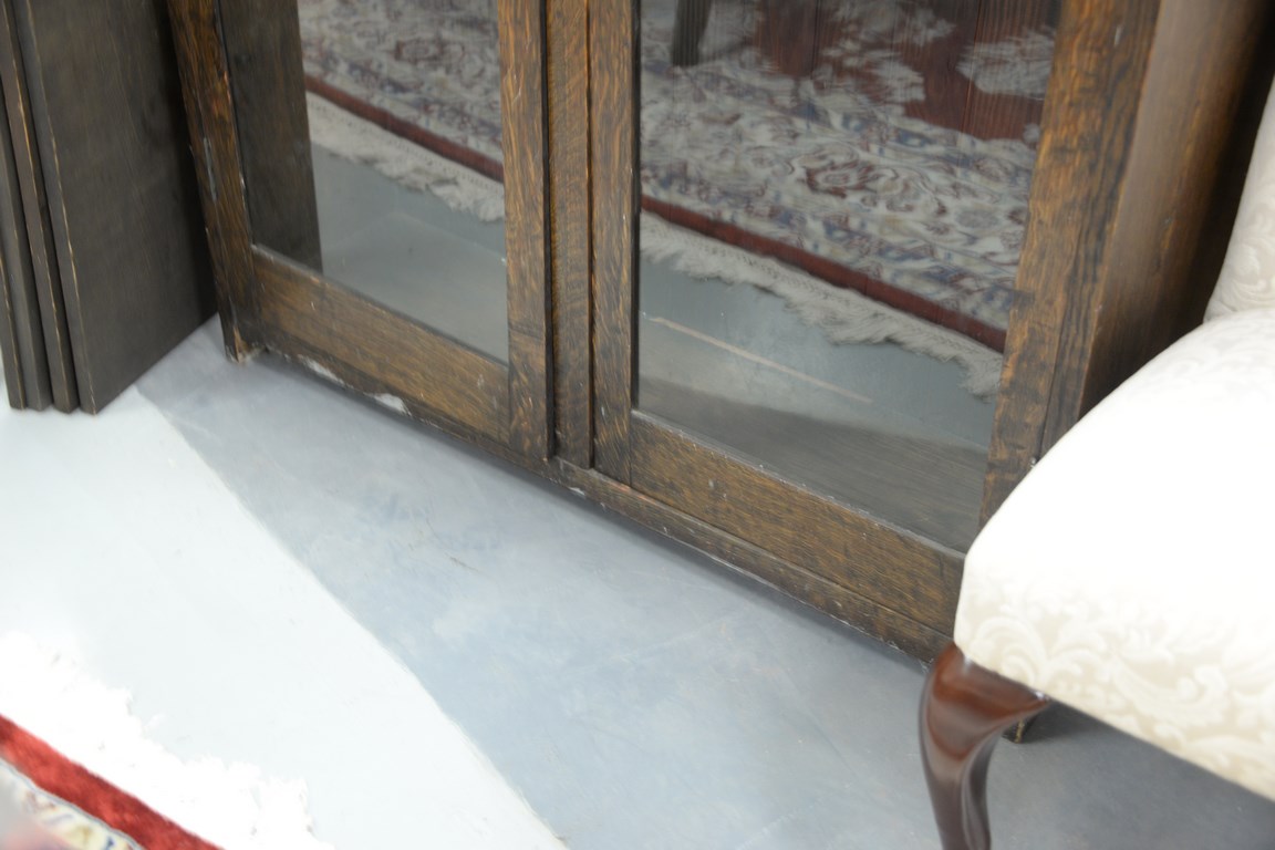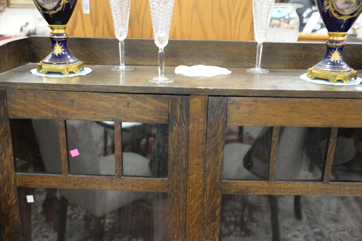 Lot 228: Mission oak style bookcase with two glass doors opening to four shelves. ht. 55 1/2 in. wd. 43 1/2 in. dp. 12 in.