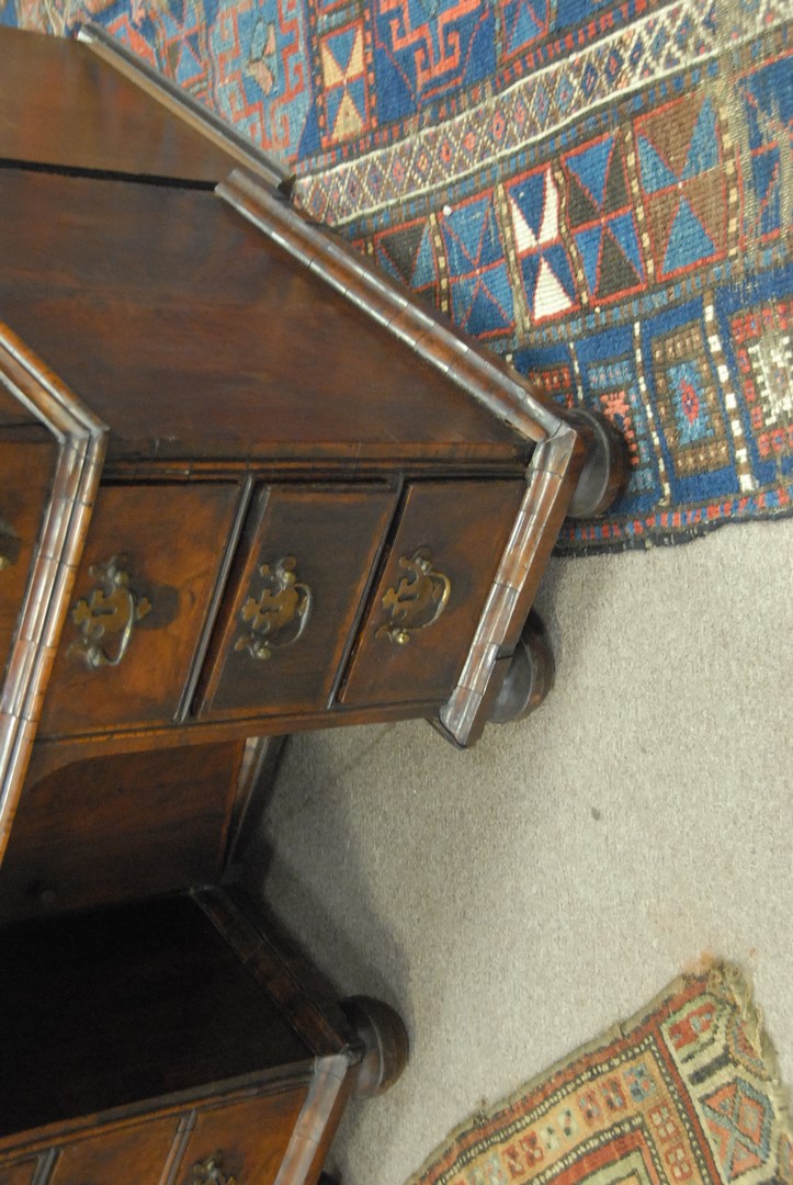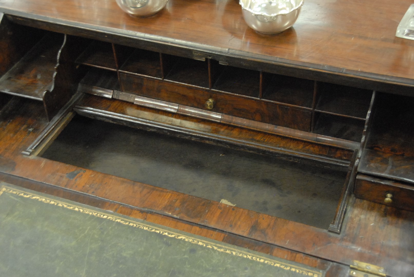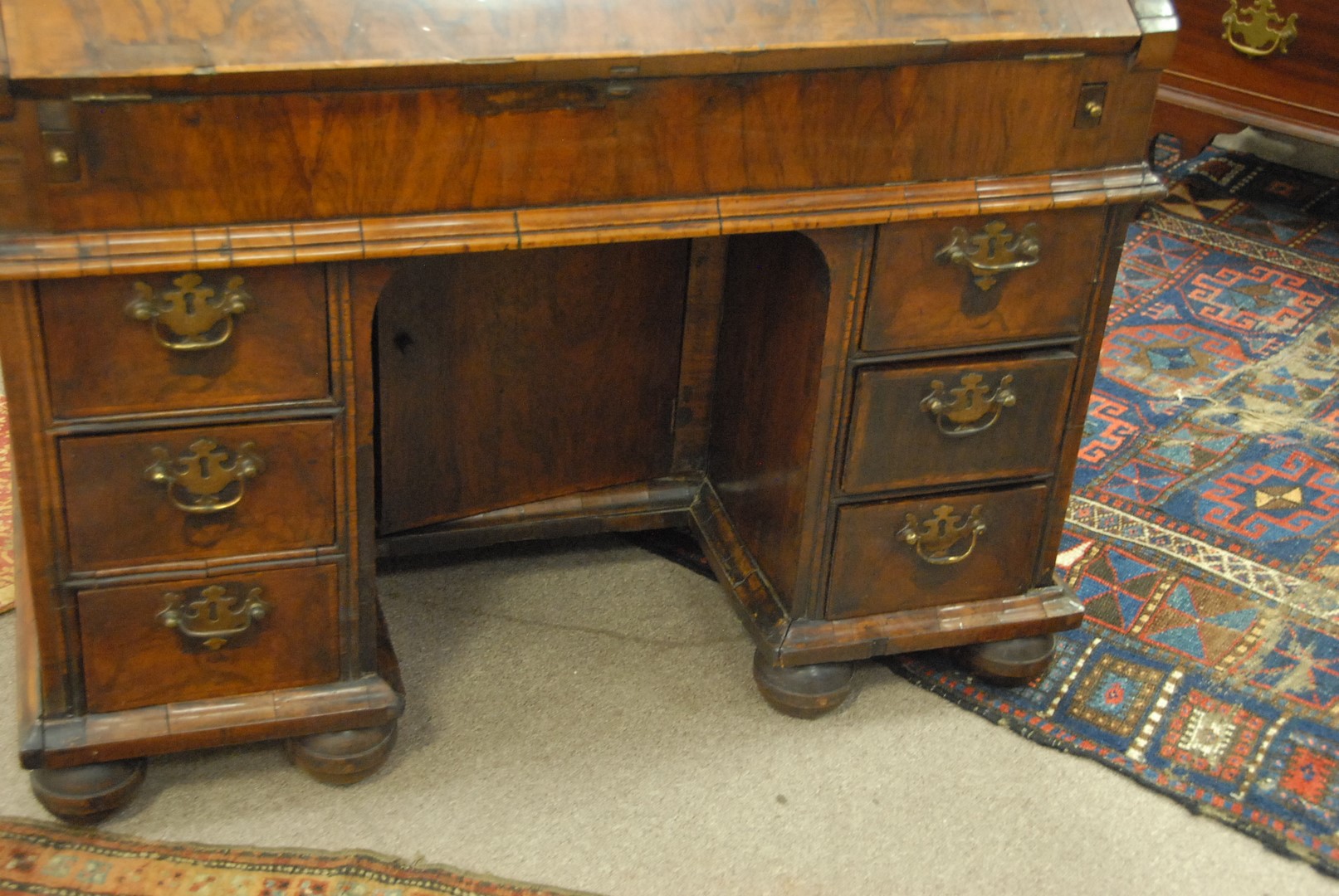 Queen Anne burlwood kneehole desk having slant lid, interior with well, double bank of drawers, and center door all on ball feet, early 18th century. ht. 32 1/2 dia. 35 1/2