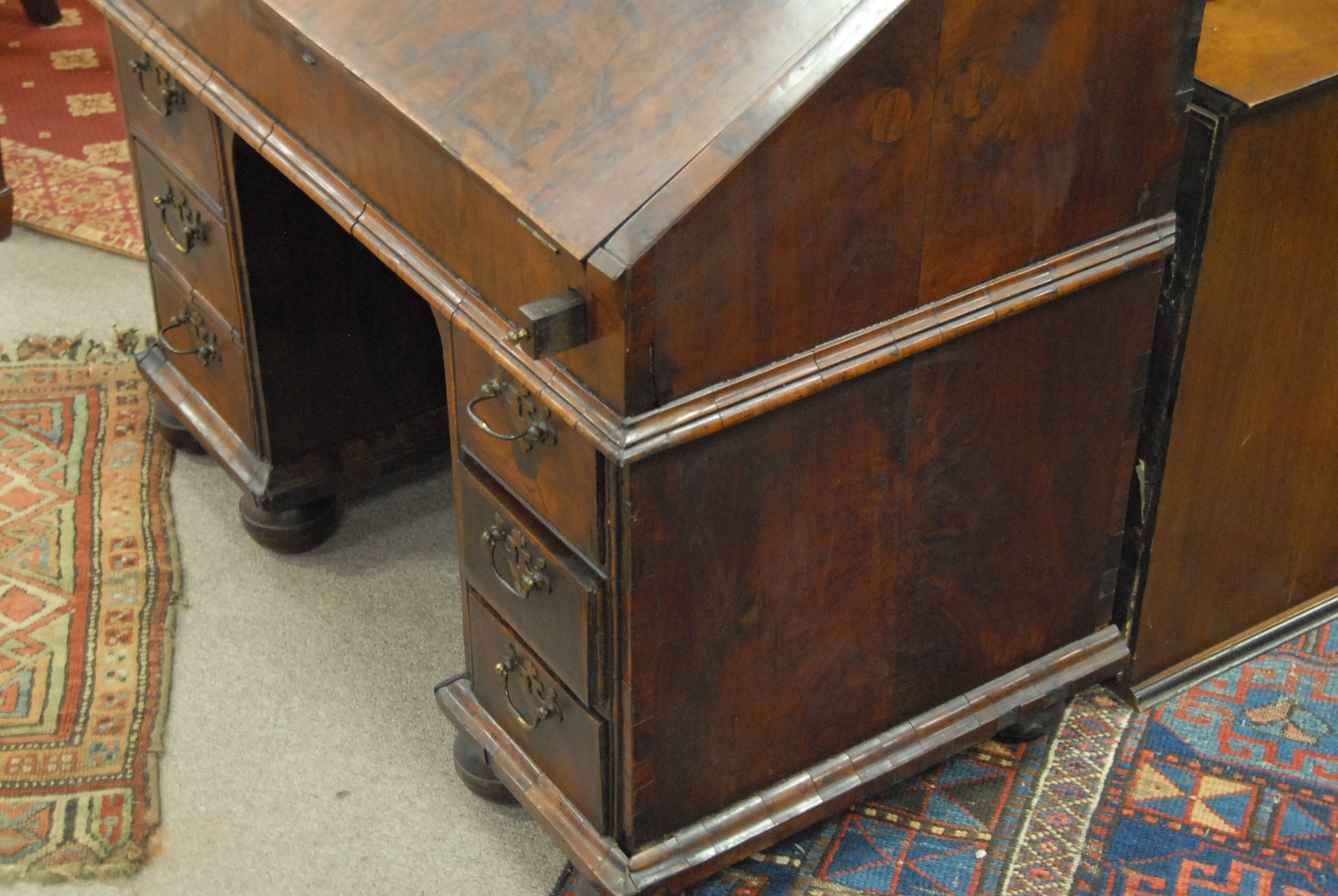 Lot 228: Queen Anne burlwood kneehole desk having slant lid, interior with well, double bank of drawers, and center door all on ball feet, ea…