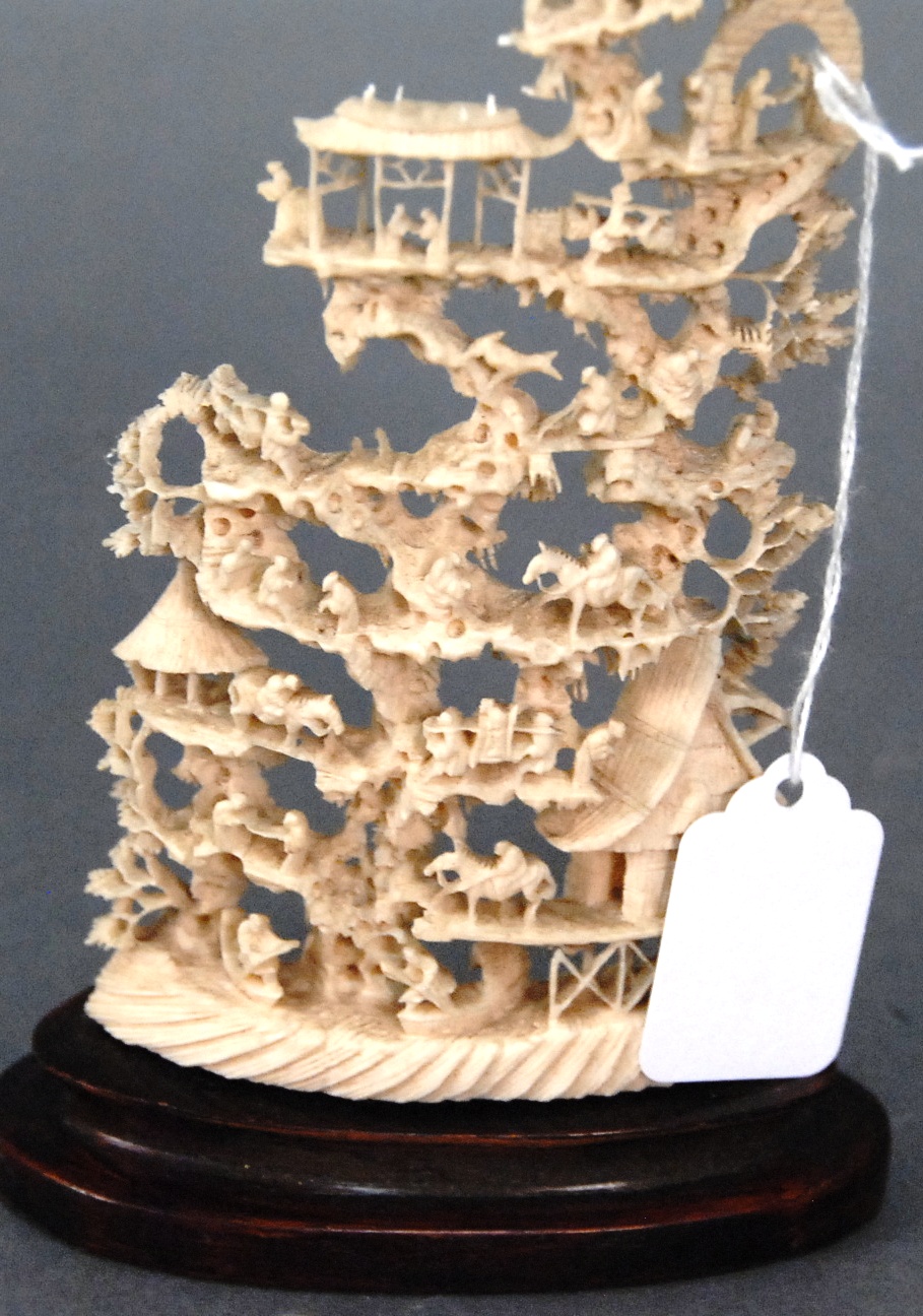 Lot 228: Reticulated carved ivory sculpture of large tree with house and figures in it, ht. of ivory 6 1/2in.