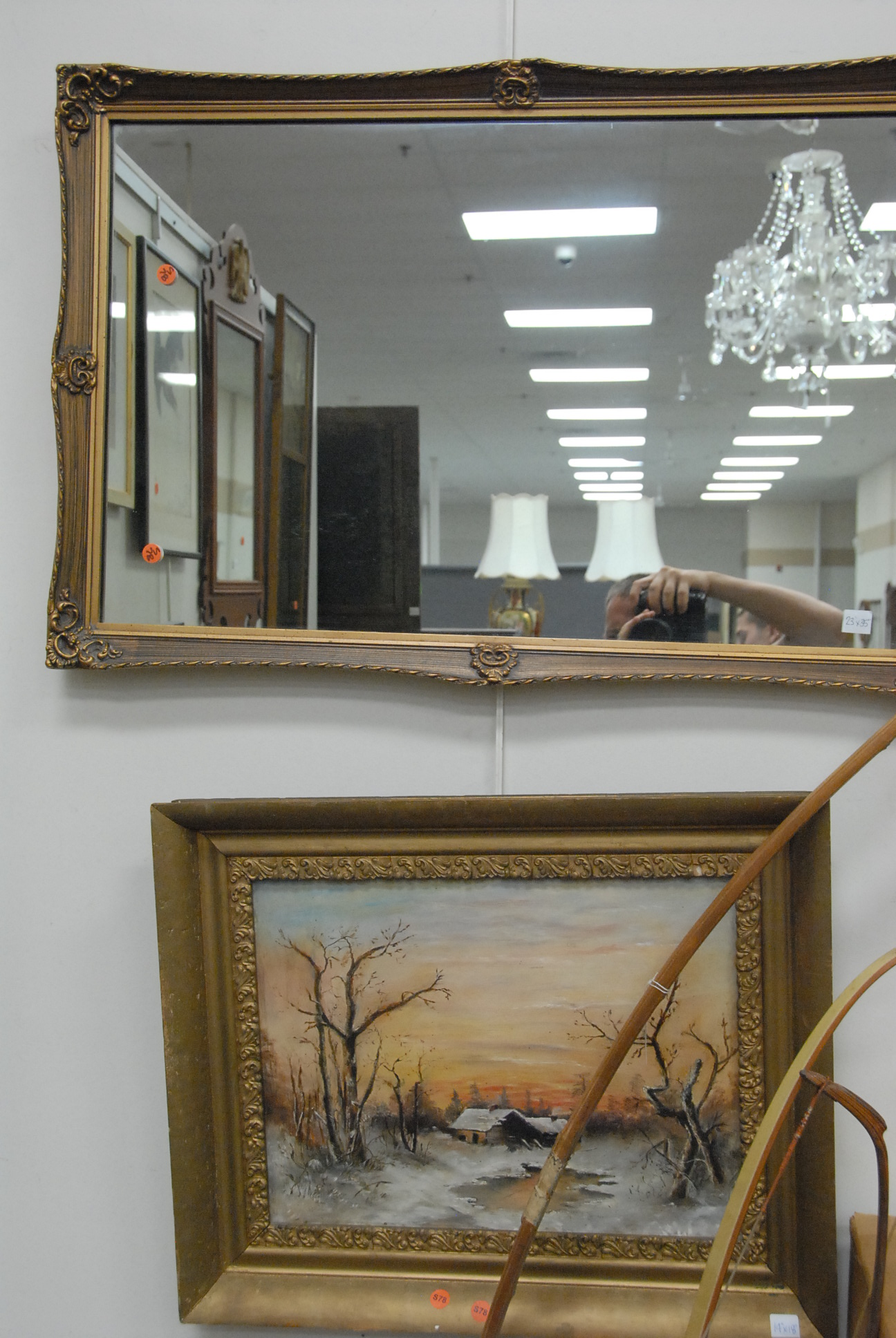 Seven piece lot to include a mirror clock by Waltham, Chippendale style mirror, gold frame mirror, two Oriental style prints, oil painting of a winter scene, and a print of a mountain.