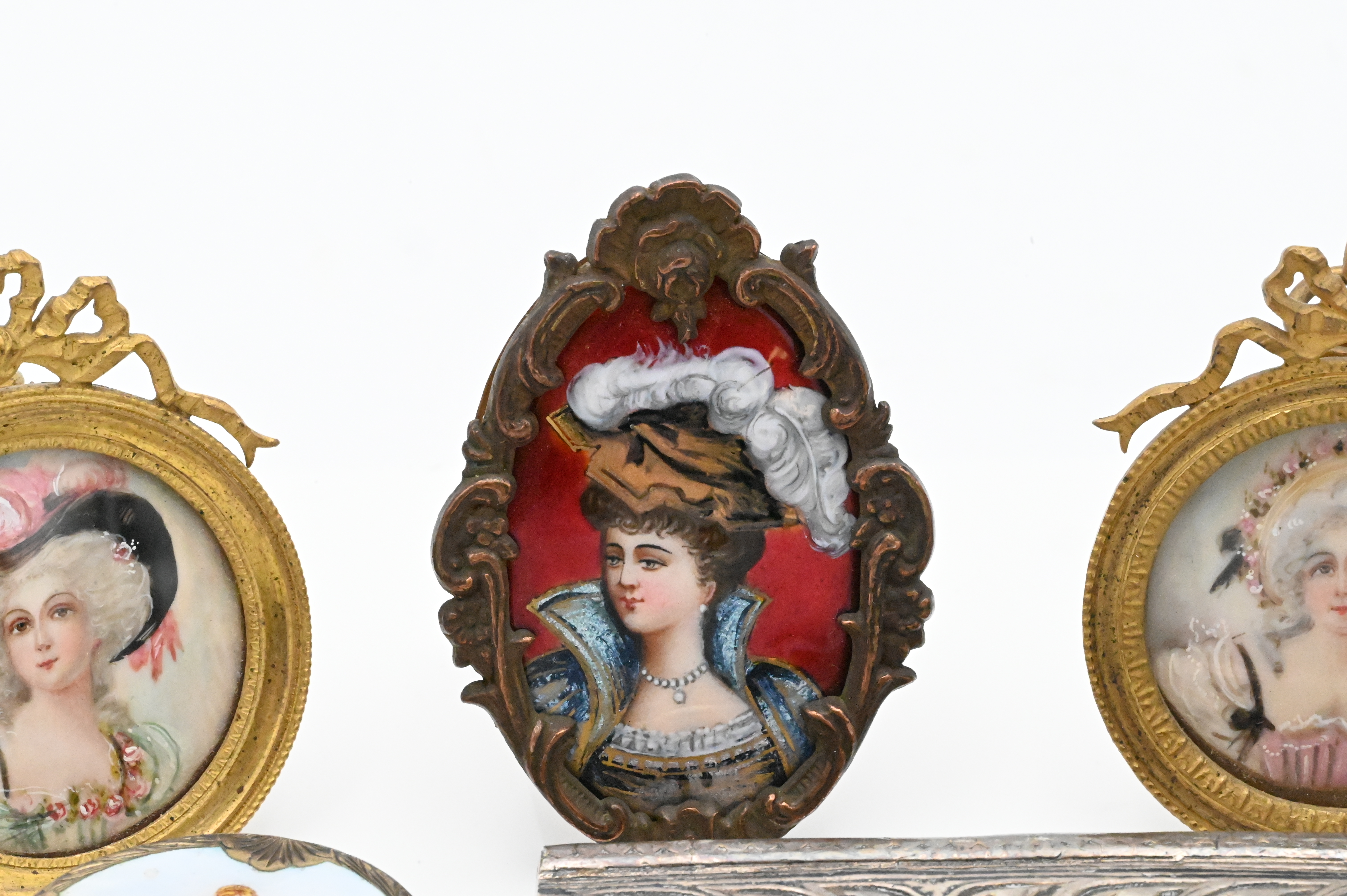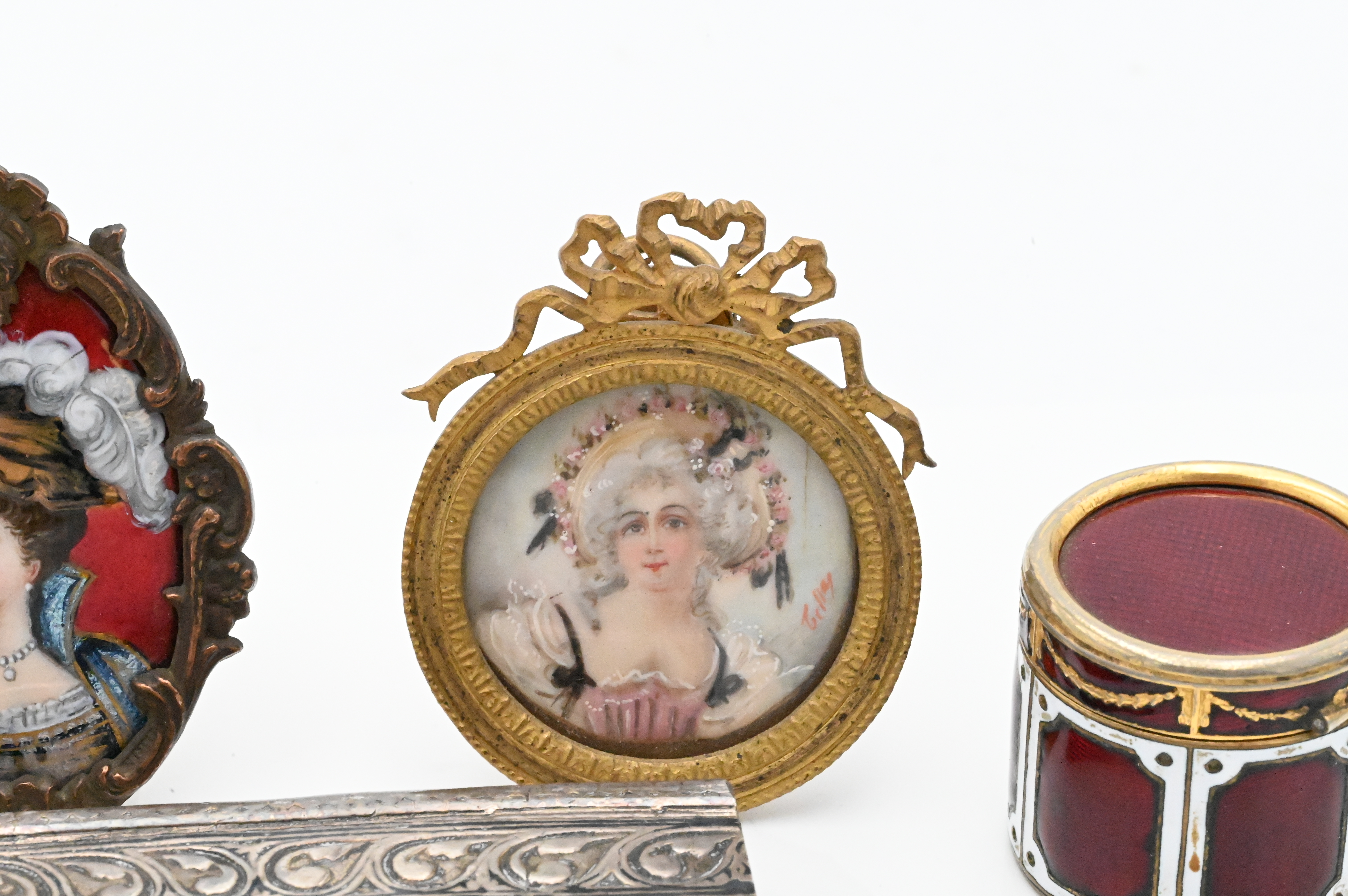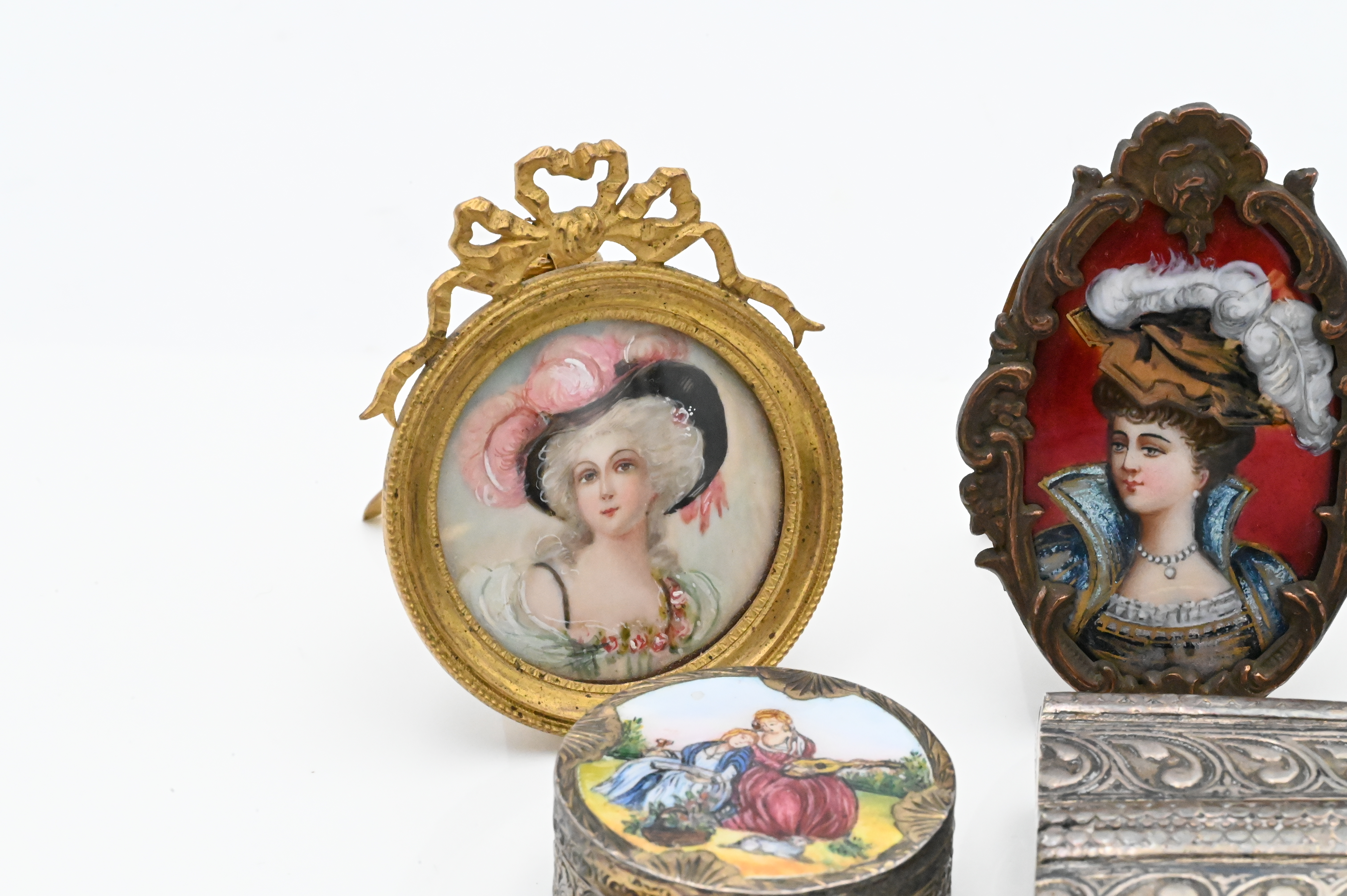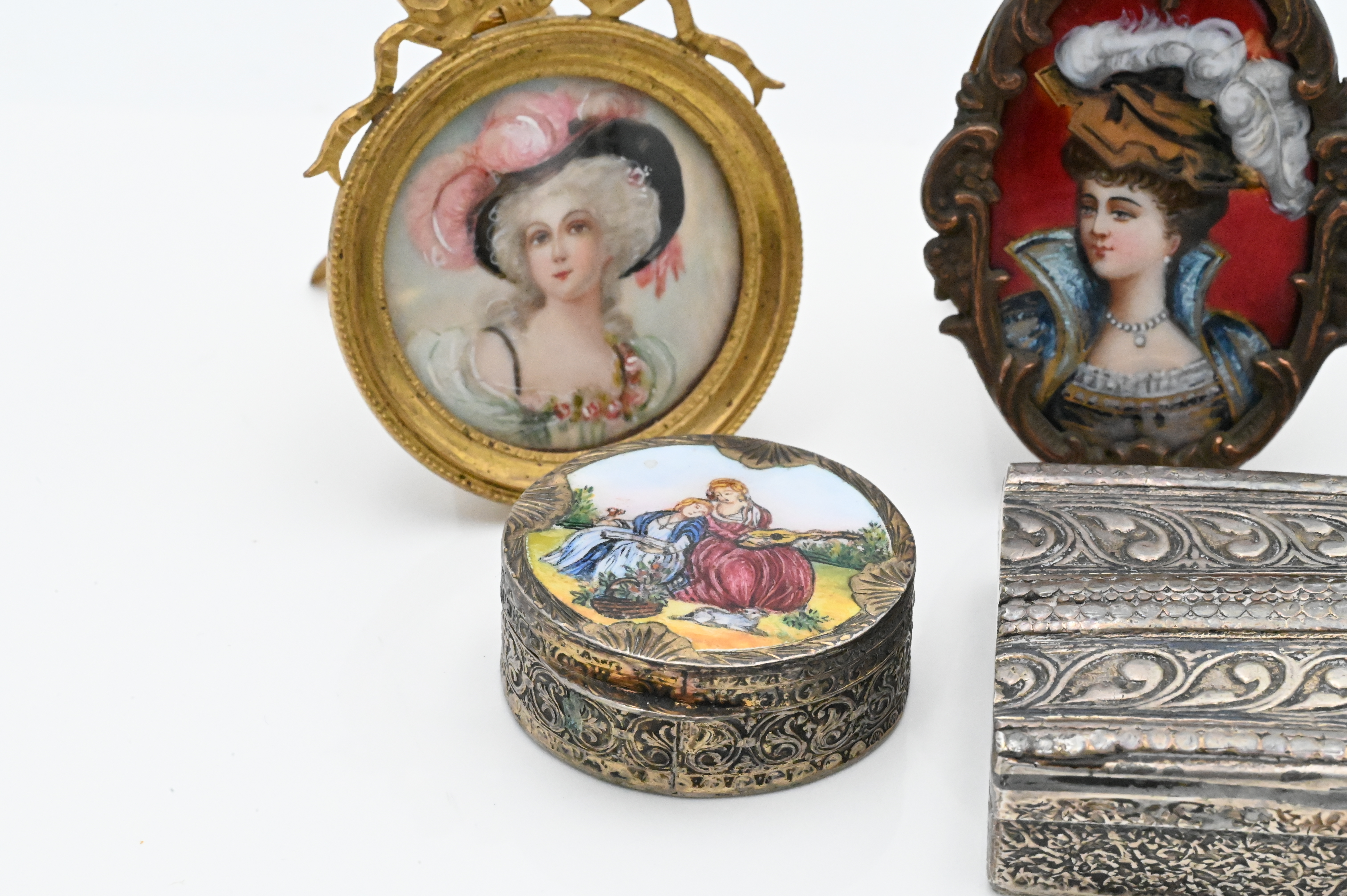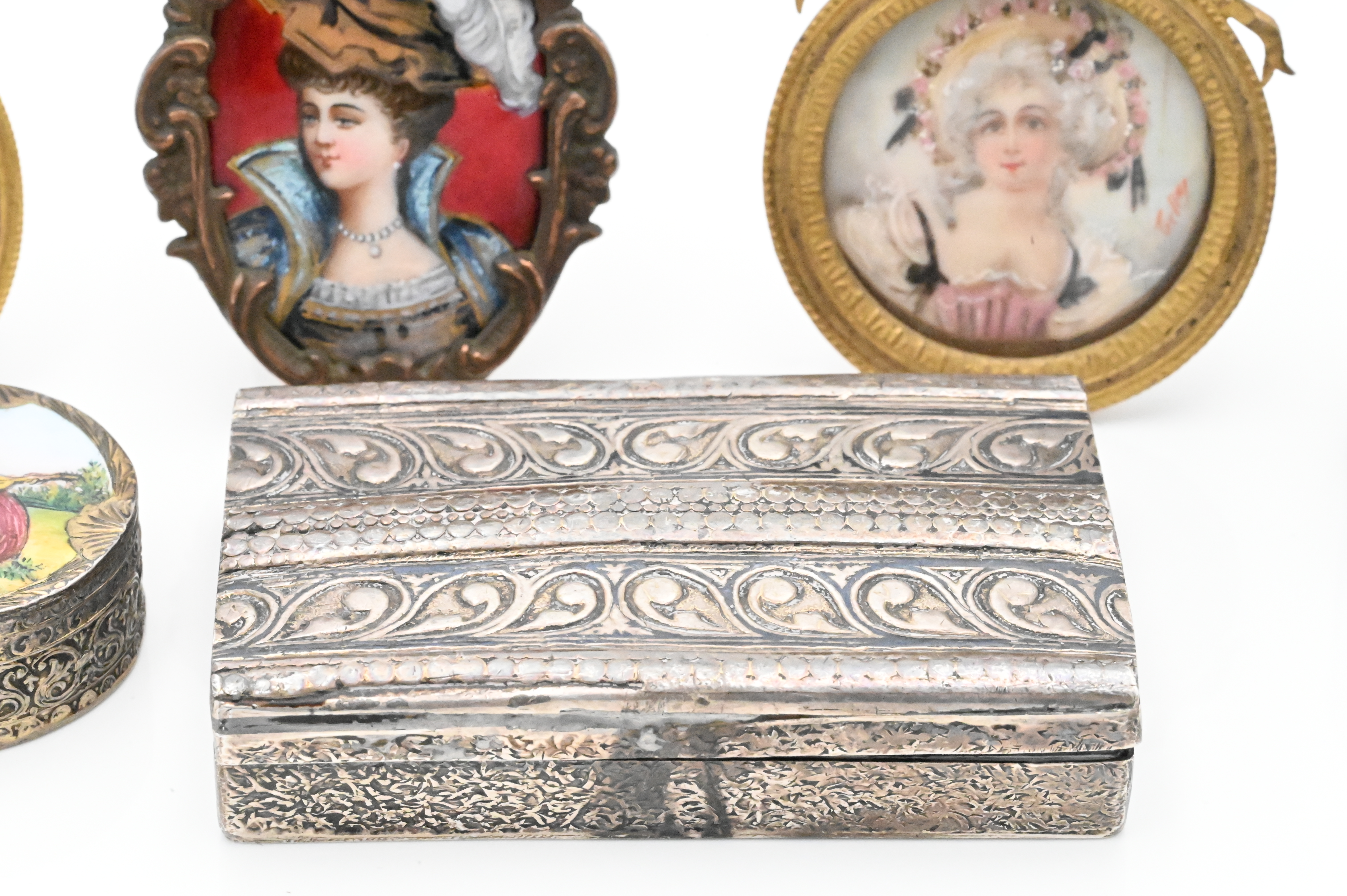 Six Piece Lot, to include silver box, two enameled trinket boxes, an enameled cameo, along with a pair of Victorian painted cameos.