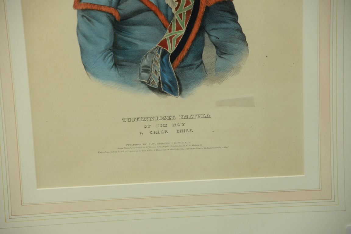 Lot 228: Thomas McKenney and James Hall hand colored lithograph Tustennuggea Emathla or Jim Boy a Creek Chief, published by F.W. Greenough …
