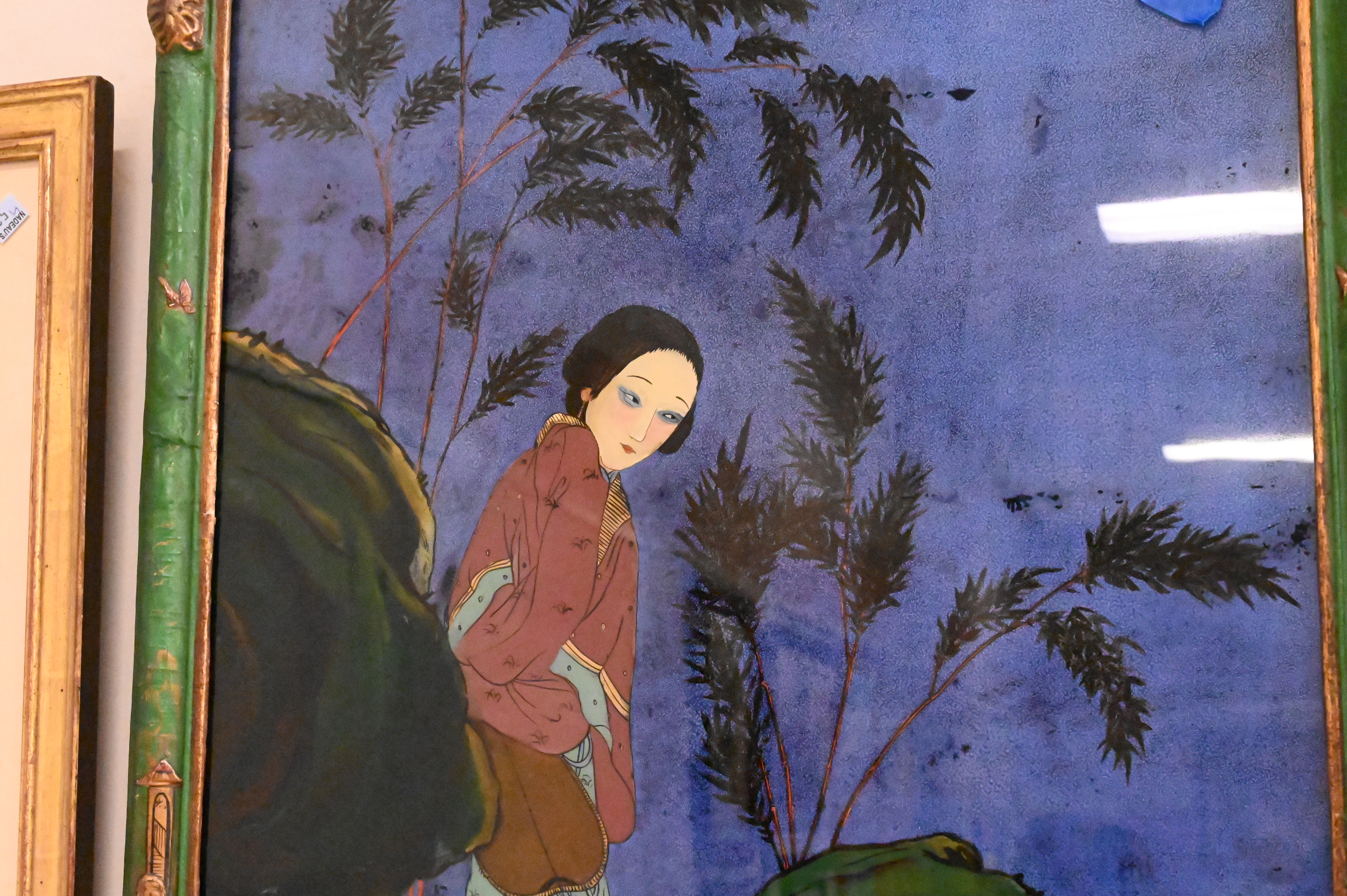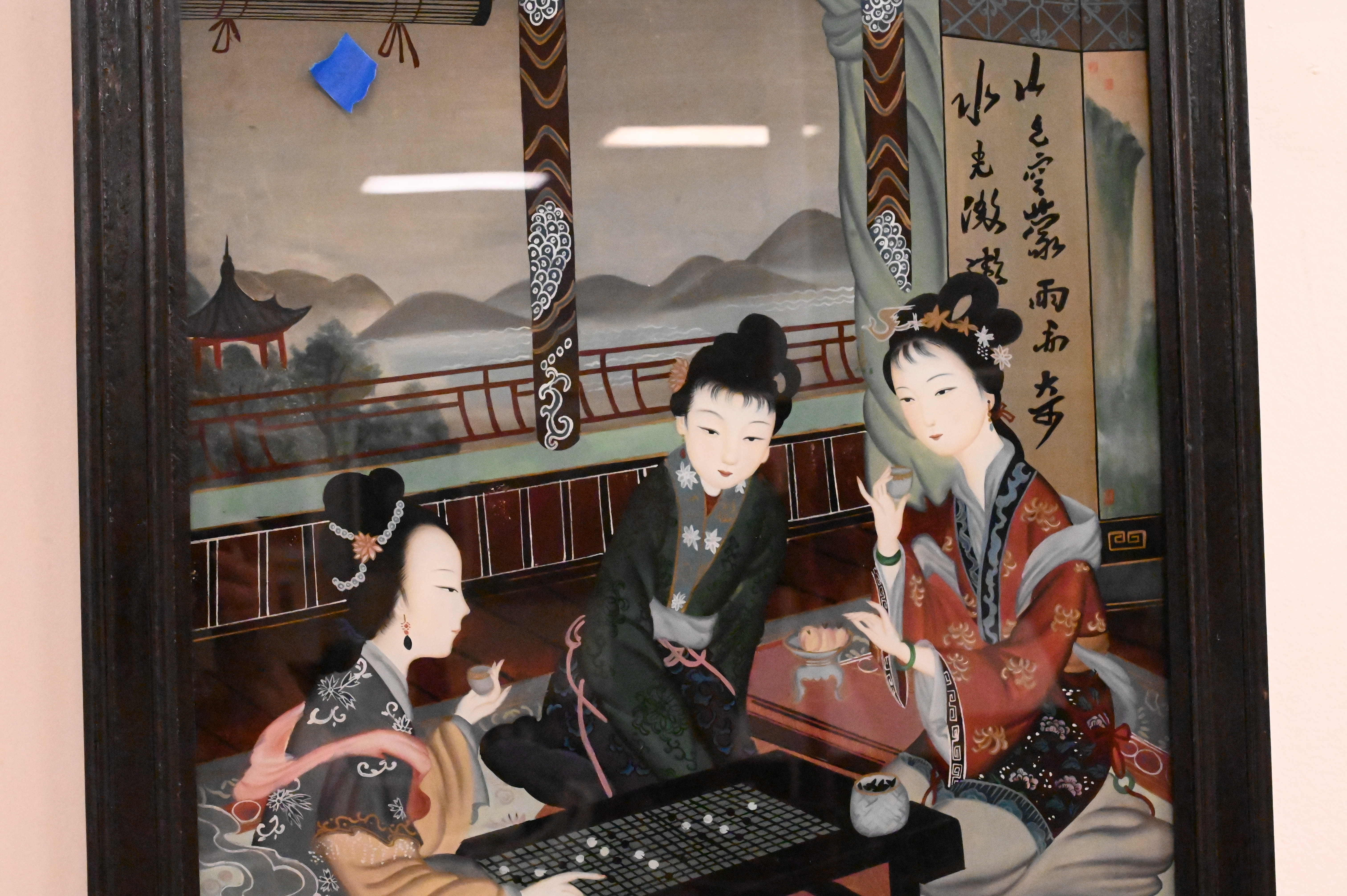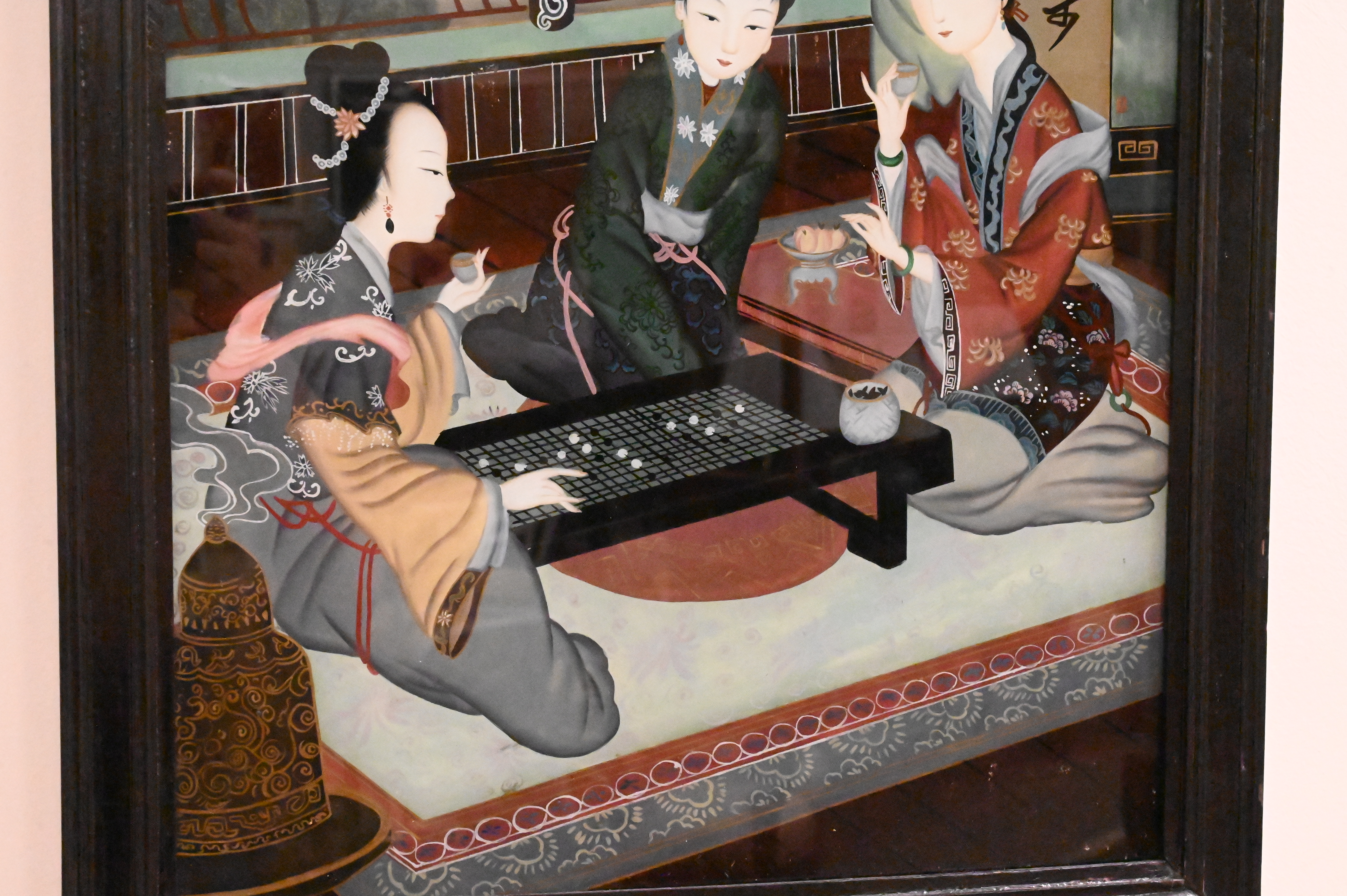 two female courtesans playing instruments, Geisha in a landscape housed in green and gold painted wood frame, three female courtesans playing a board game