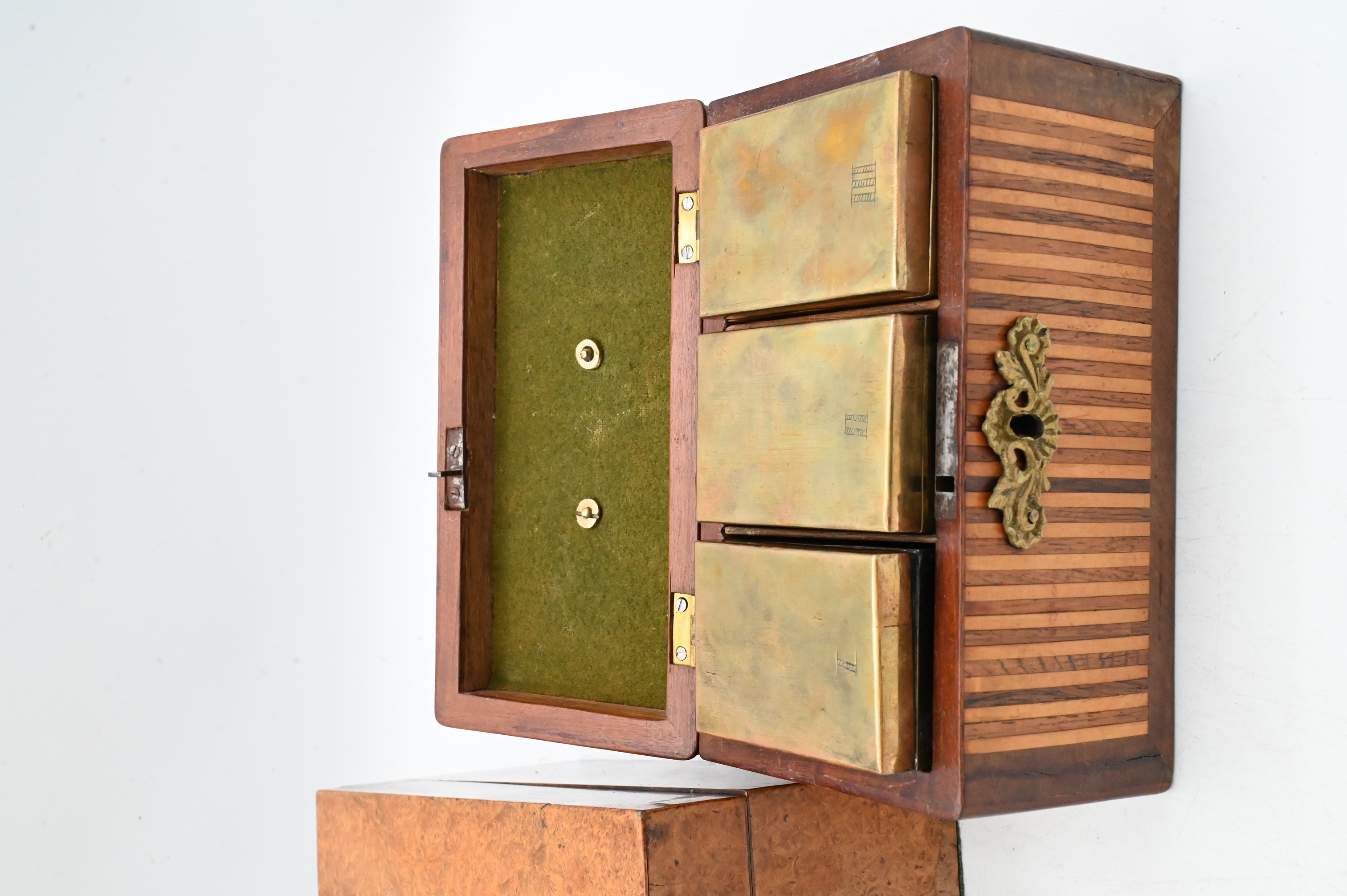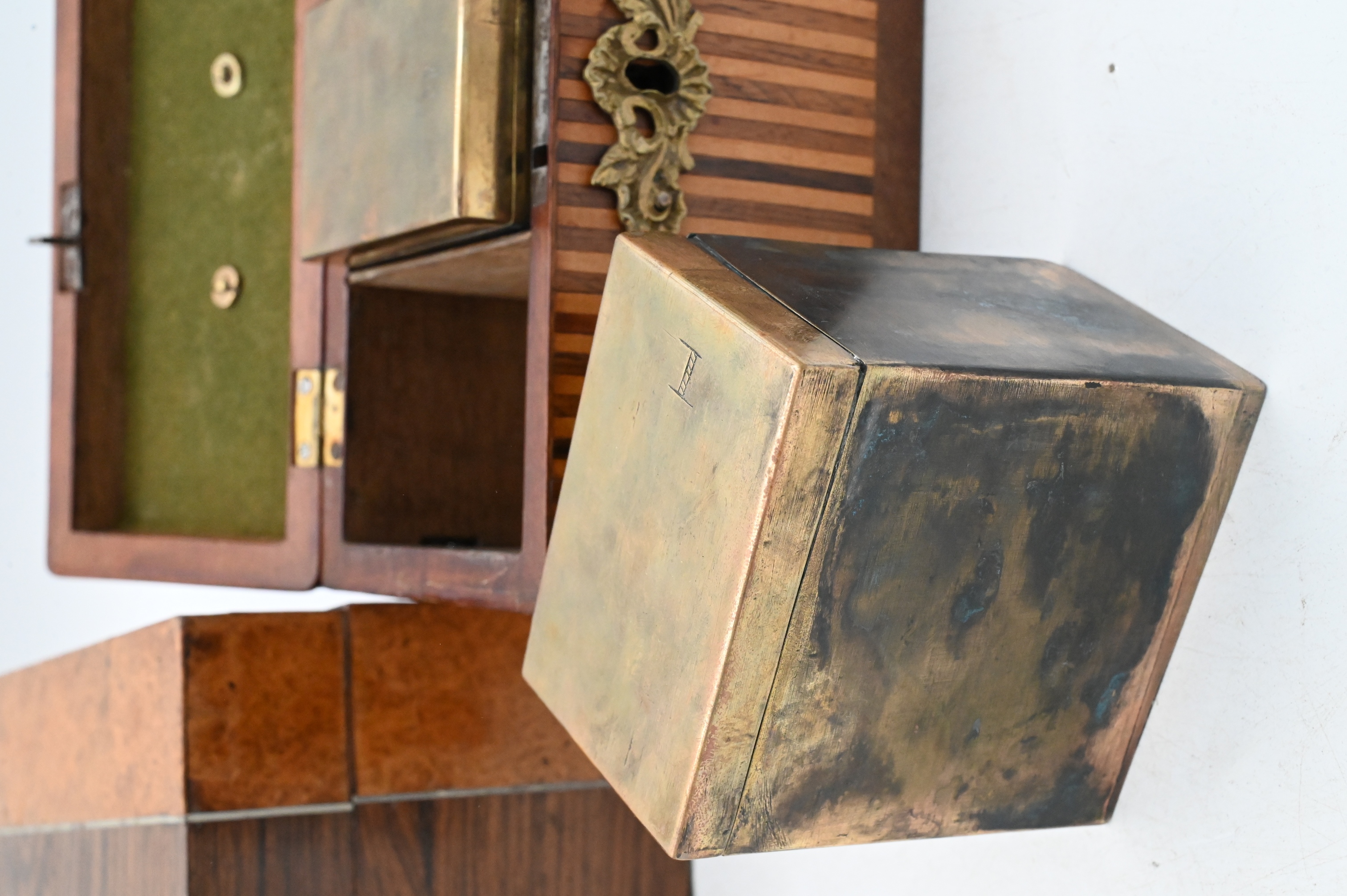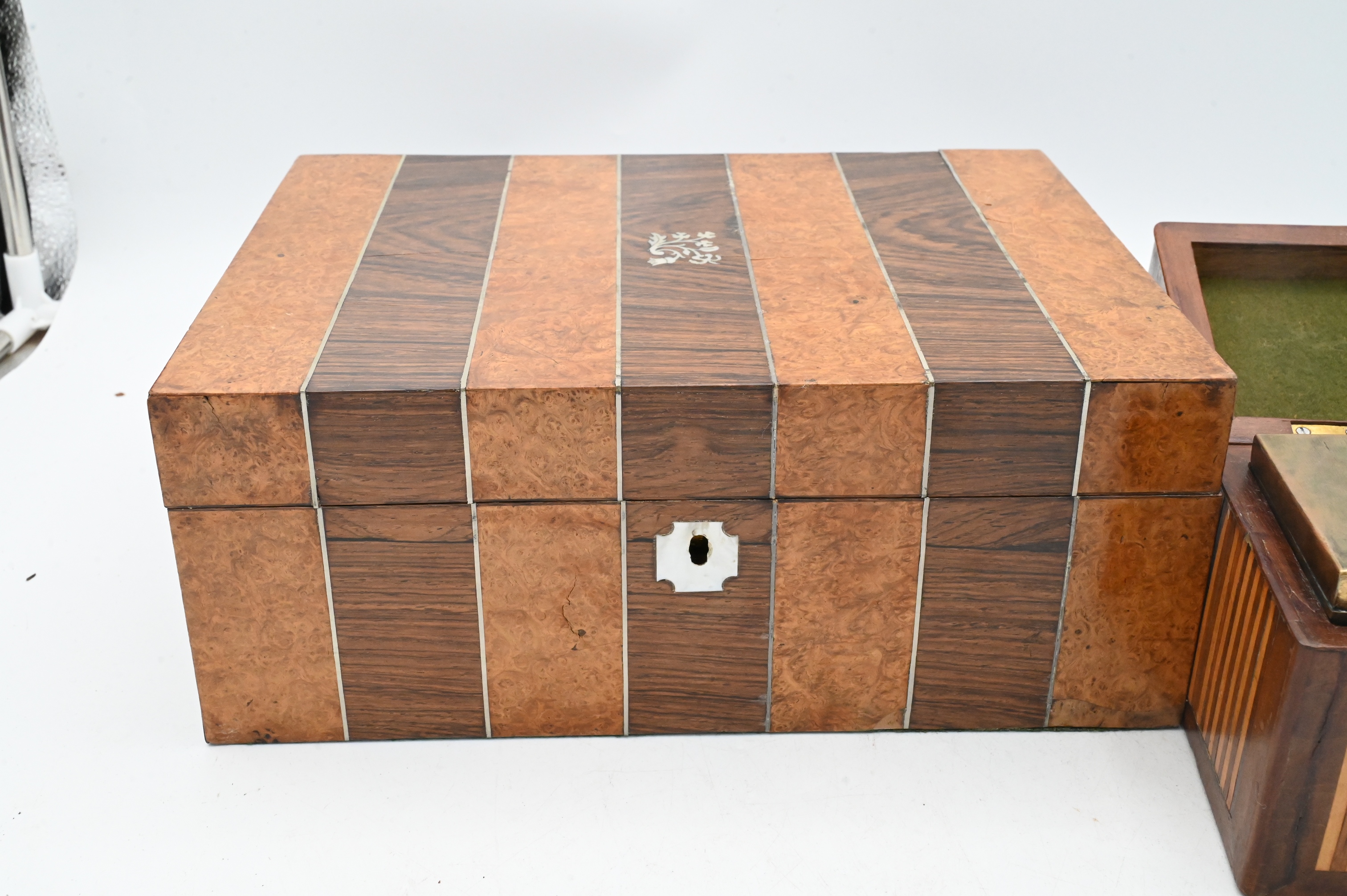 19th Century, a striped parquetry box with alternating light and dark wood veneers, fitted with brass handle and escutcheon opening two three brass tea cannisters; together with a larger rectangular writing or storage box veneered in contrasting burlwood and rosewood bands, with fine string inlay and a mother-of-pearl escutcheon and inlaid crest to the lid.
