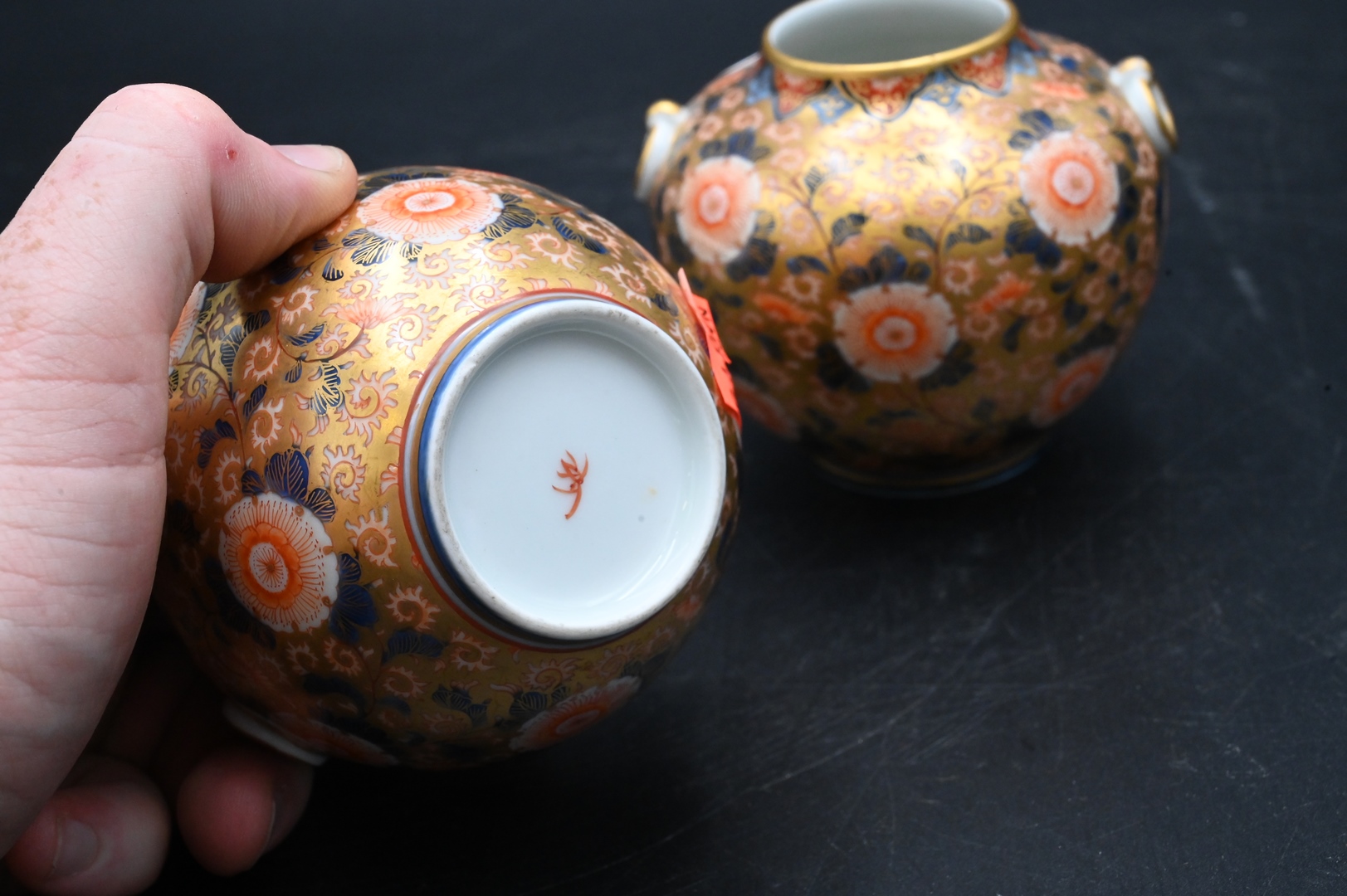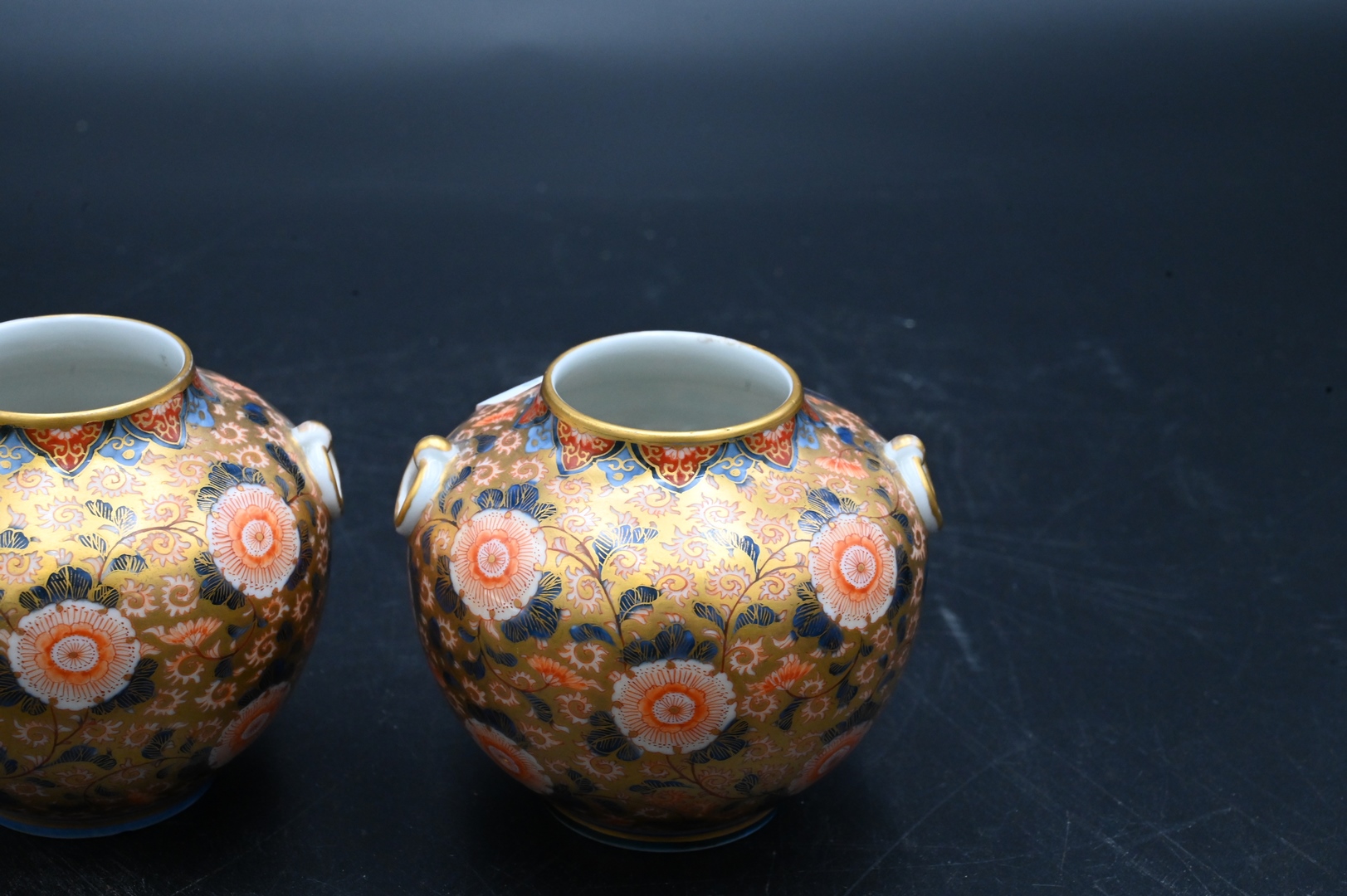 A Pair of Globular Form Japanese Satsuma Vases, with handles, having gold highlights, heights 3 1/2 inches, diameter 1 1/2 inches.