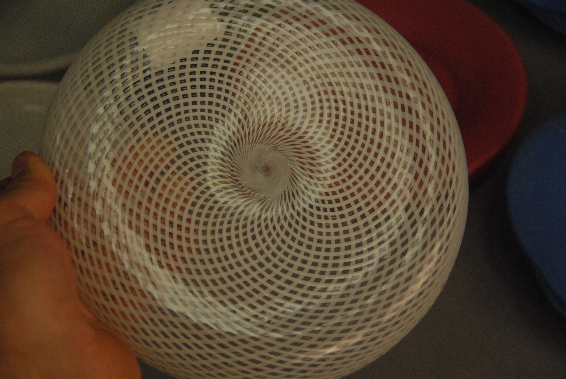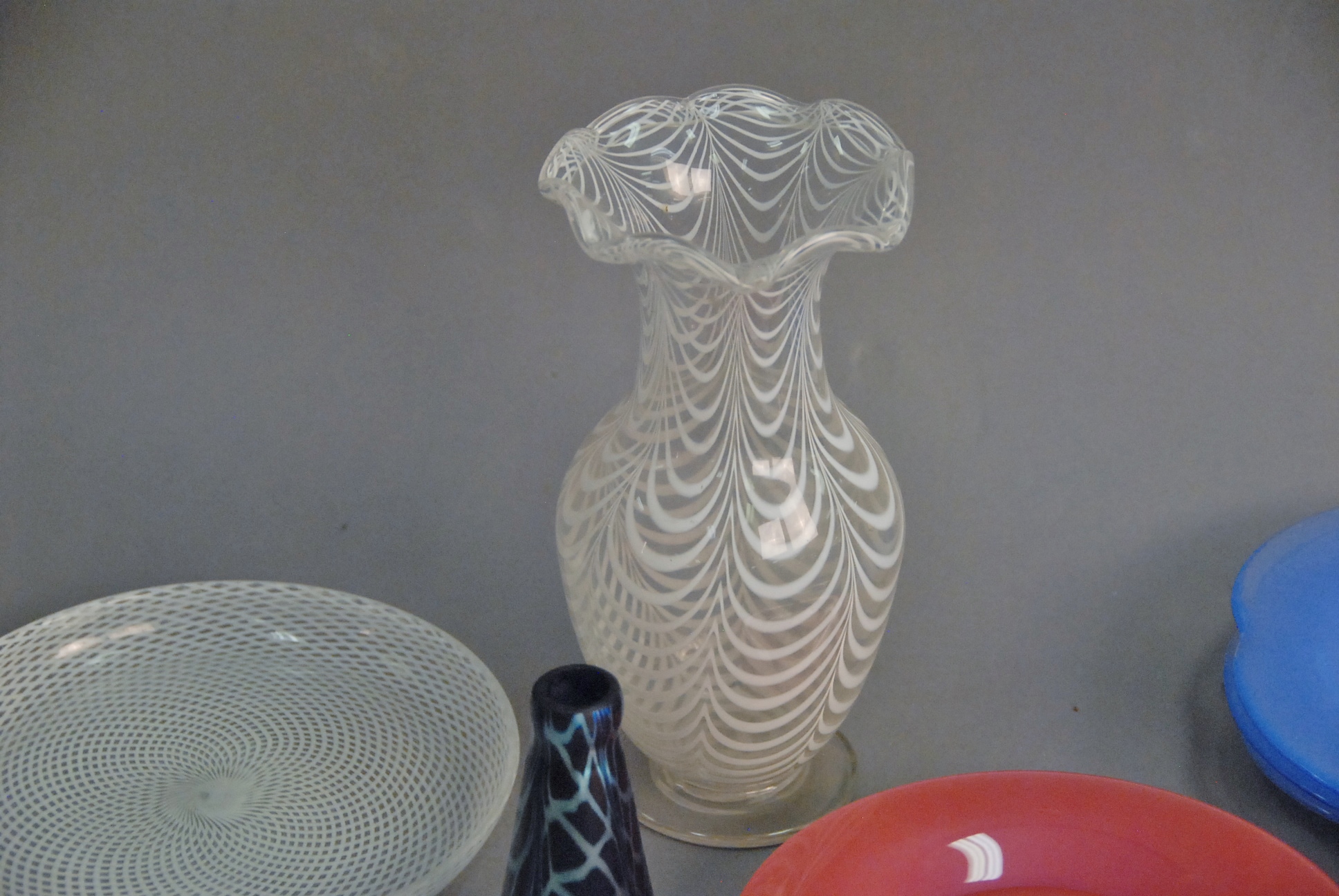 Art glass group to include four pink France art glass plates, set of three white swirl glass plates, hand blown vase, set of six blue plates, and Lundberg Studios art glass shade.