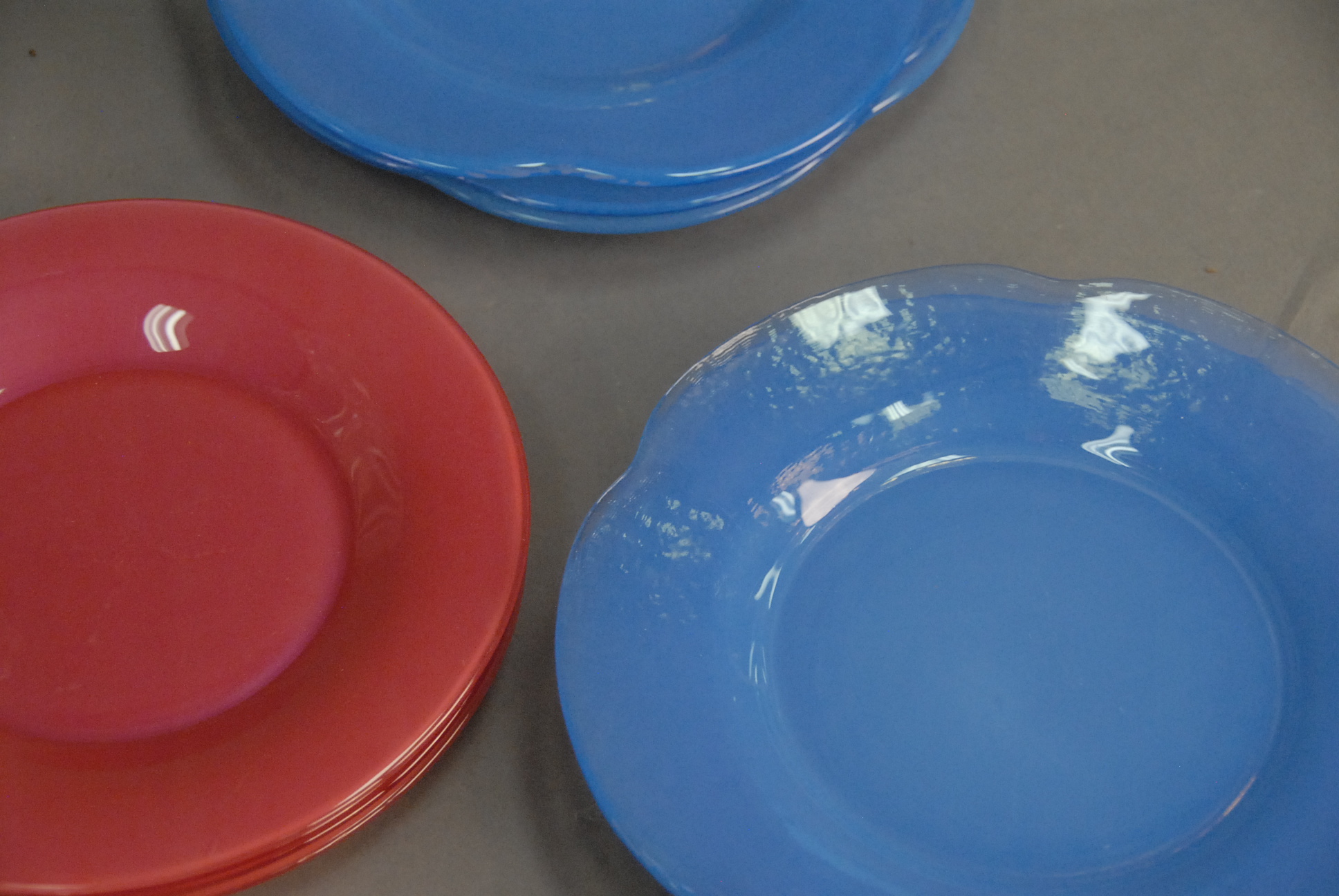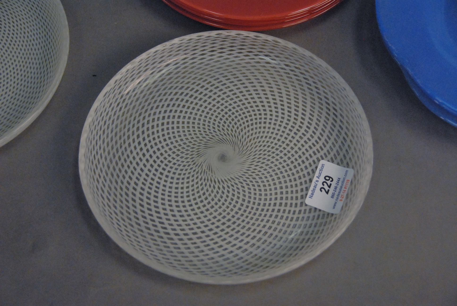 Lot 229: Art glass group to include four pink France art glass plates, set of three white swirl glass plates, hand blown vase, set of six blu…