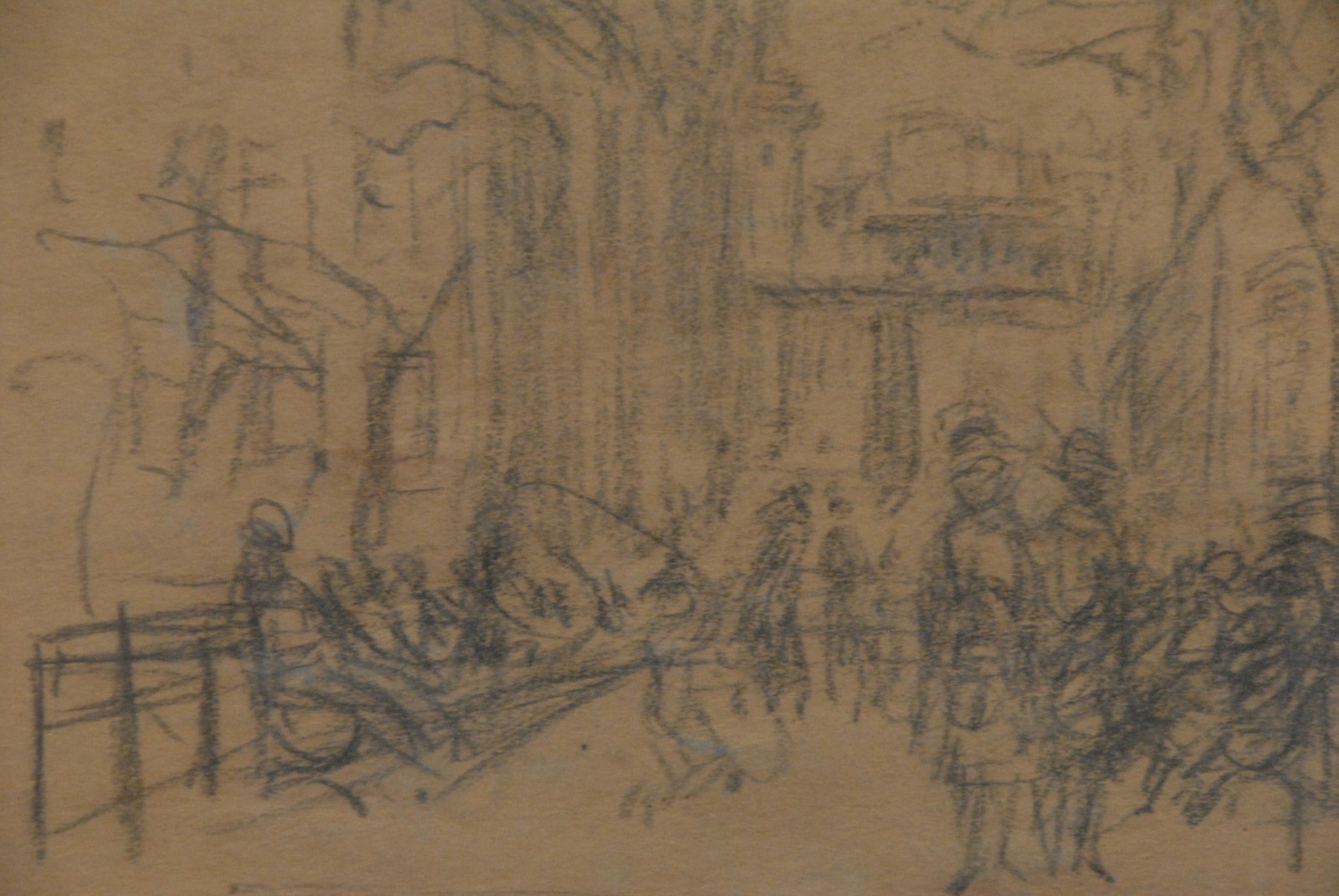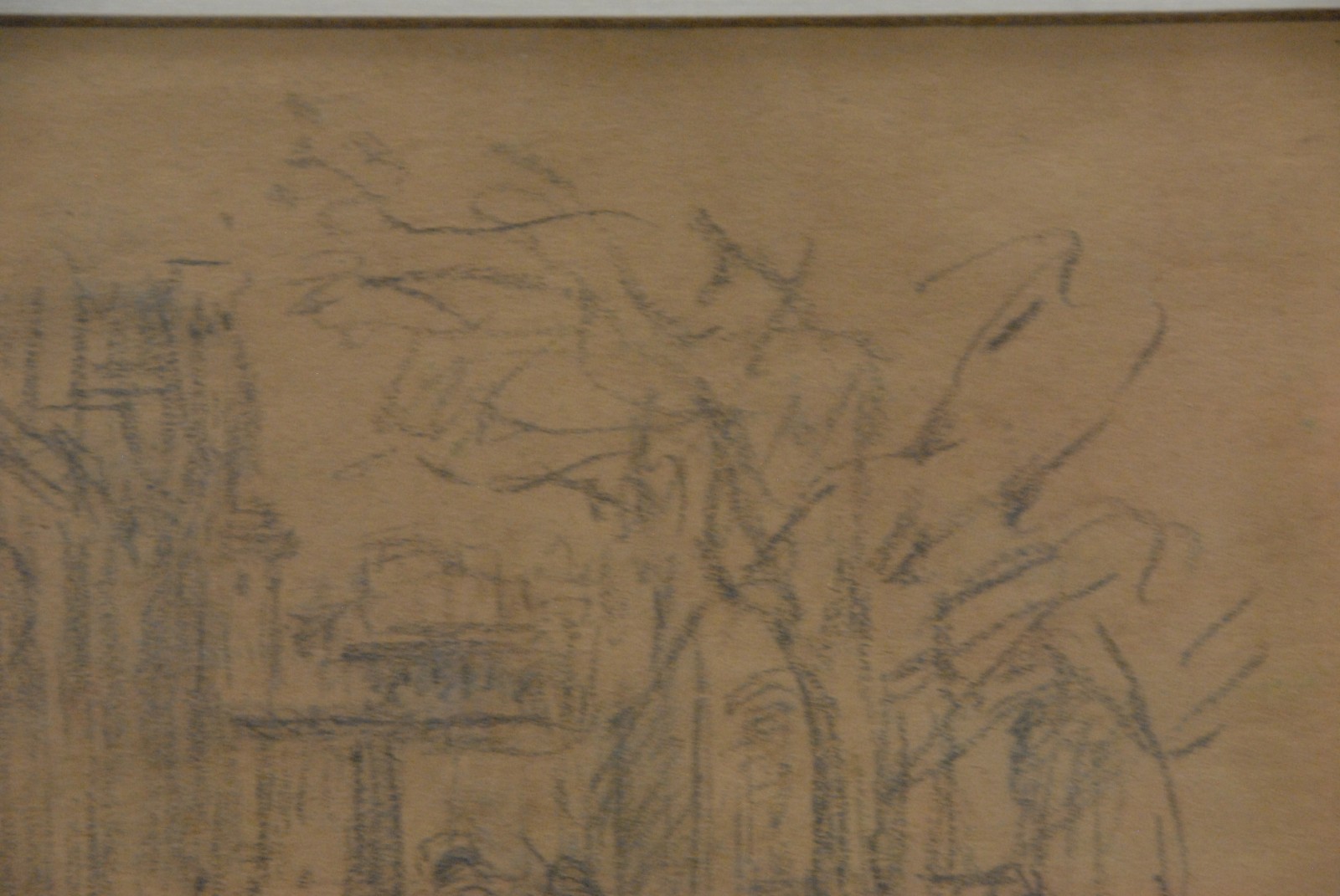 Attributed William James Glackens 1870 – 1938 NEW YORKS EAST SIDE drawing sketch unsigned on back Kraushaar Galleries labels, Americans Masters Galleries label New York.