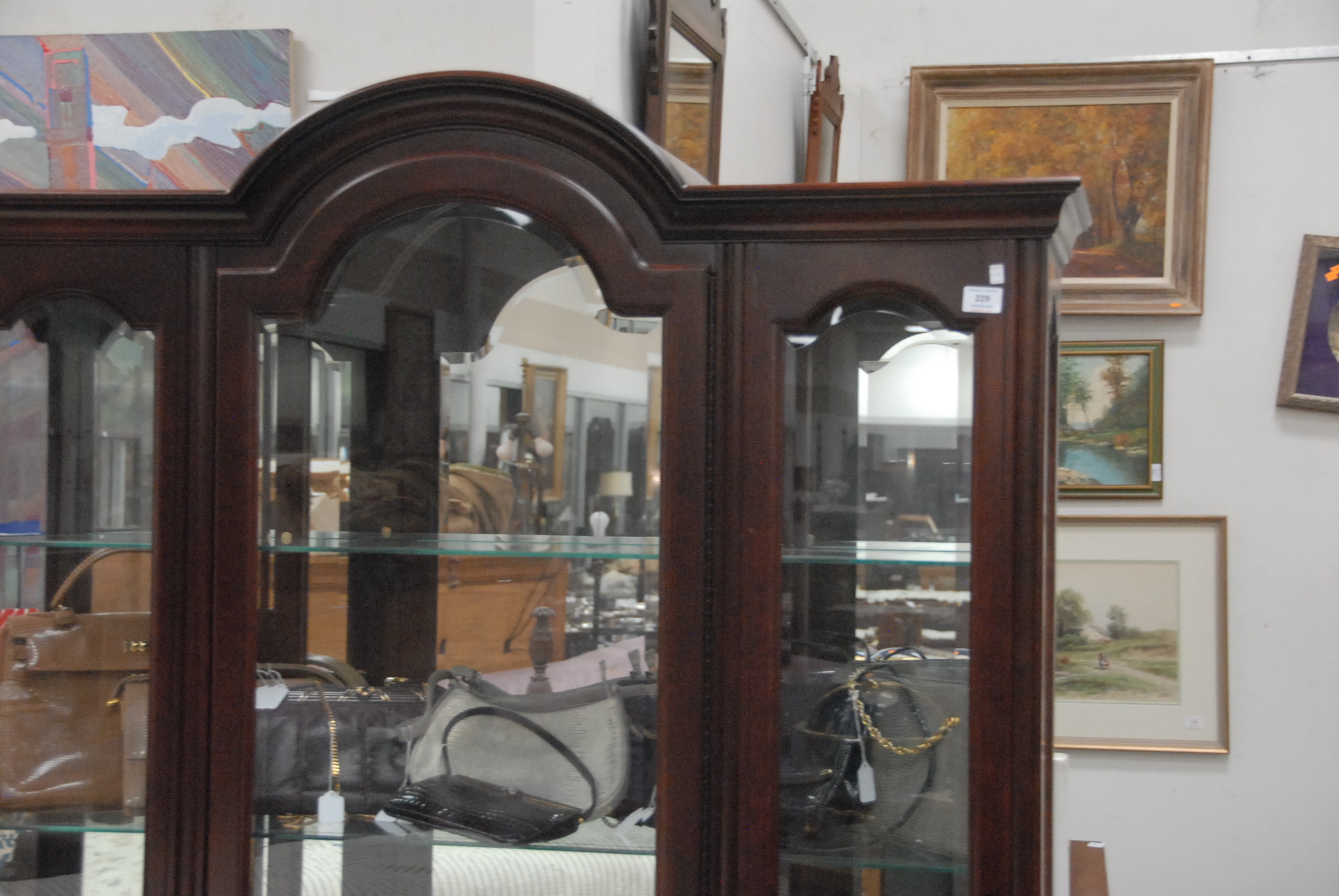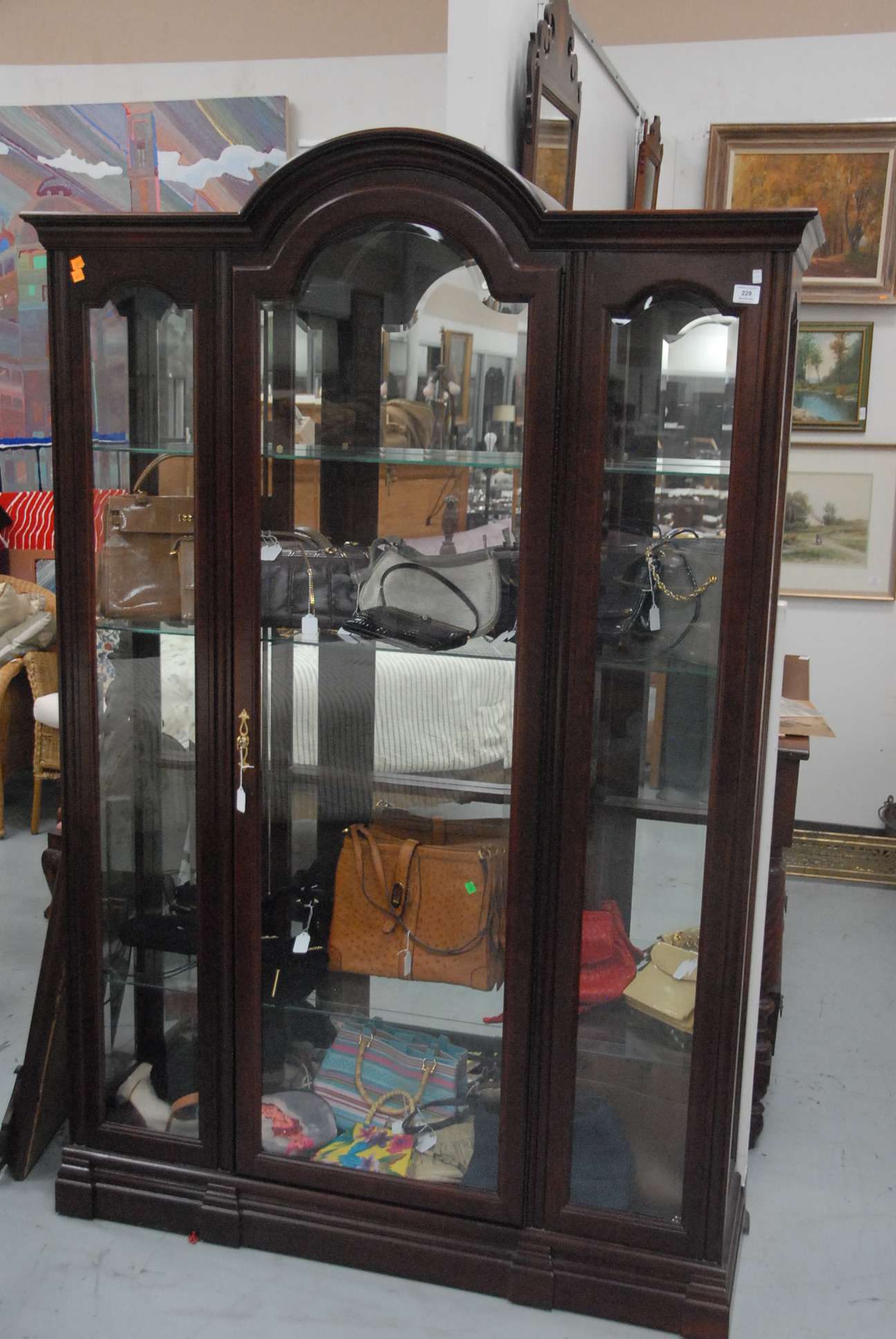 Contemporary curio cabinet with glass shelves and beveled glass, ht. 78 in. wd. 44 in.