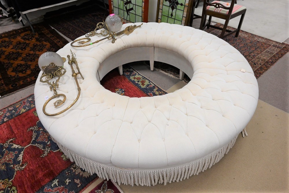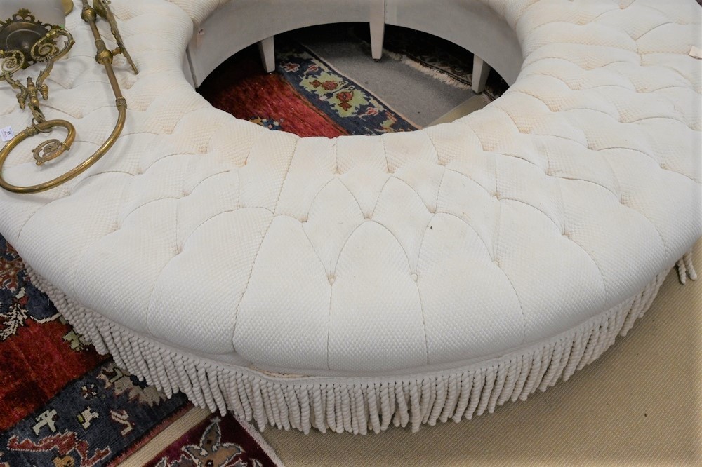 Lot 229: Custom Round Upholstered Bench, made to go around a post or around a table, having tufted top, in two pieces, height 18 1/2 inches, outer diameter 78, interior diameter 37 inches.