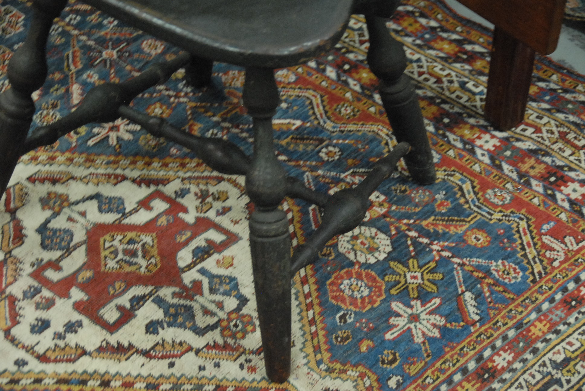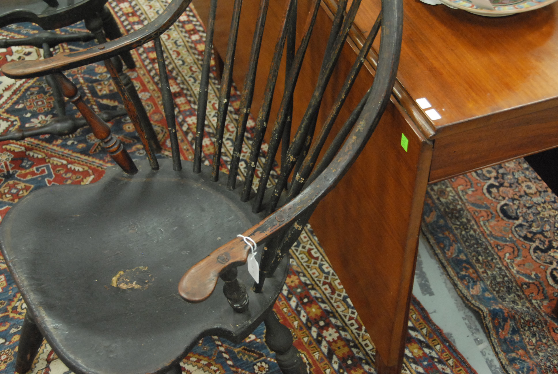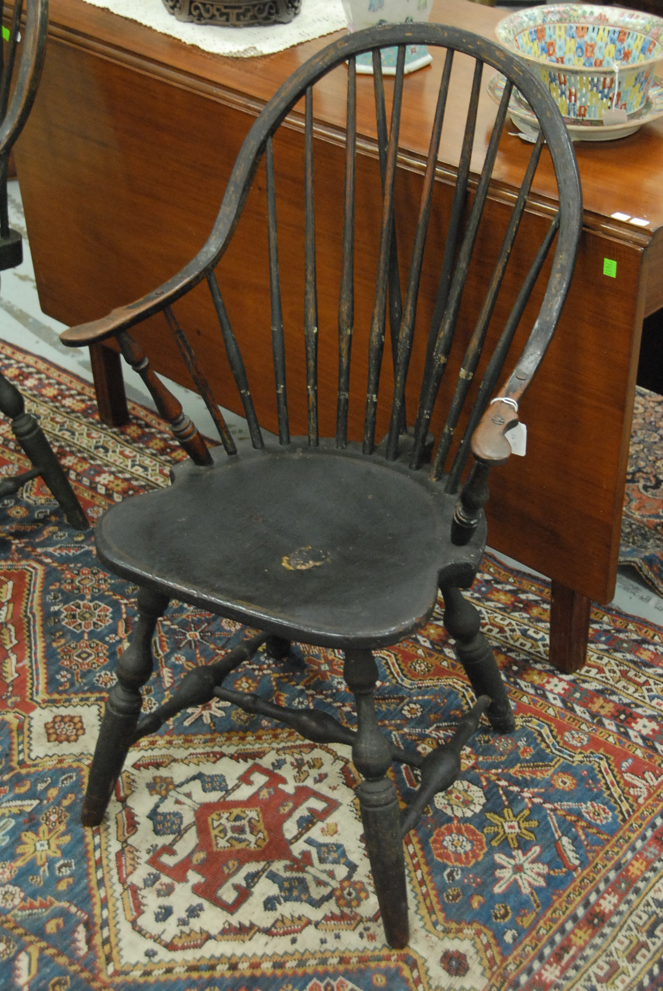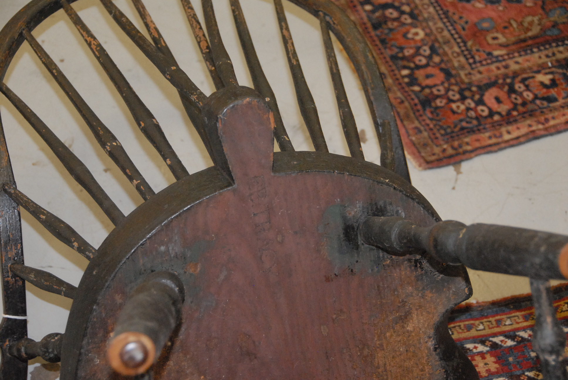 Lot 229: E. B. Tracy continuous arm Windsor chair having brace back with bold turned arm supports, legs, and stretchers, in old black paint and stenciling, signed on bottom E. B. Tracy. seat ht. 16 3/4 in. Provenance: Property from the Estate of