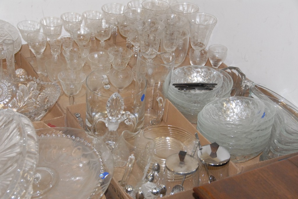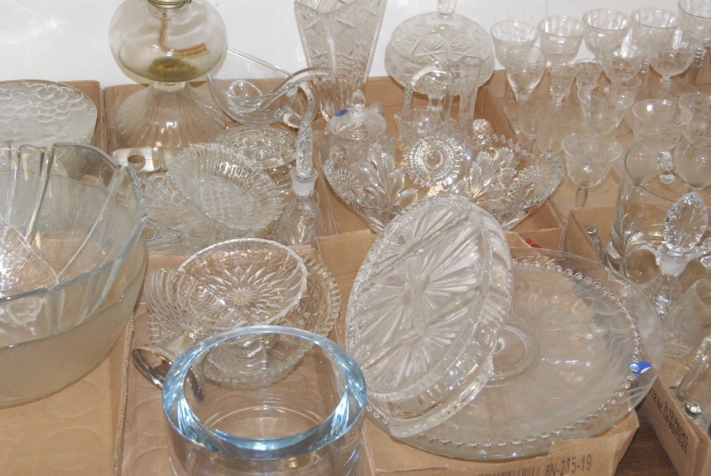 Fifteen boxes of crystal, clear glass, pressed glass, bowls, stems, plates, and miscellaneous.