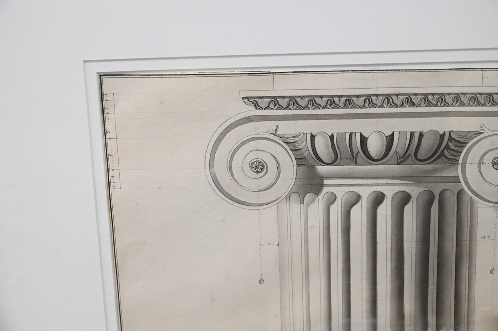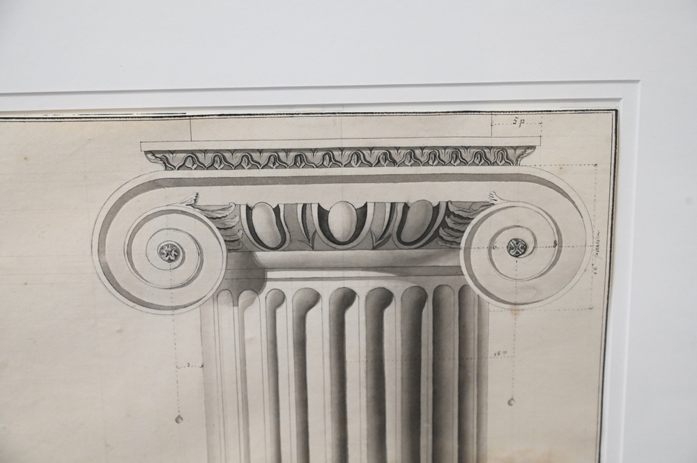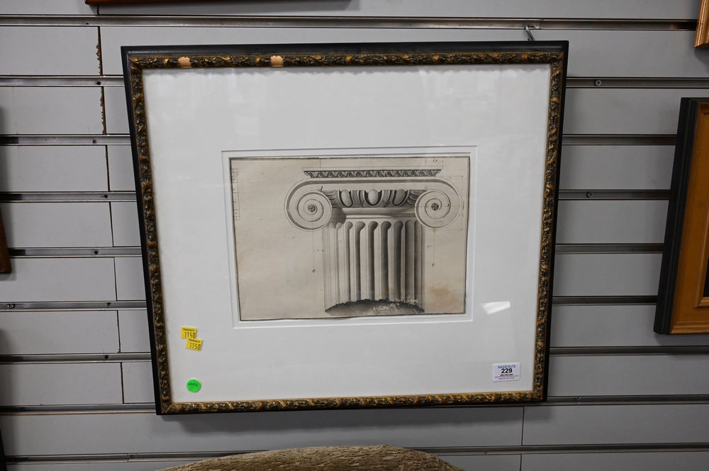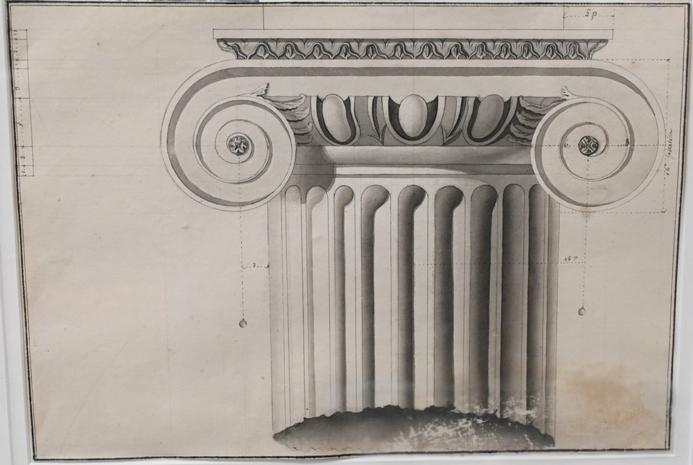 Lot 229: French School, 18th century or later, iconic capital and portion of fluted shaft, pen and ink with grey wash, 9 1/4″ x 12″.