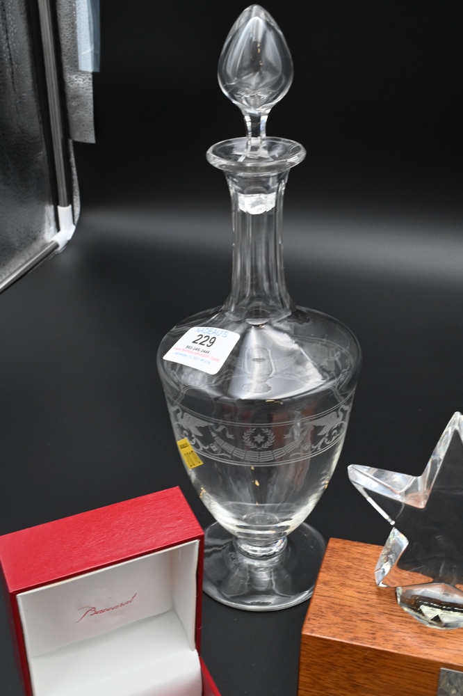 Lot 229: Group of Five Baccarat Pieces, to include a pair of stars on wood base; bell in original box; cat; along with two decanters; all marked Baccarat; tallest 12 1/2 inches.