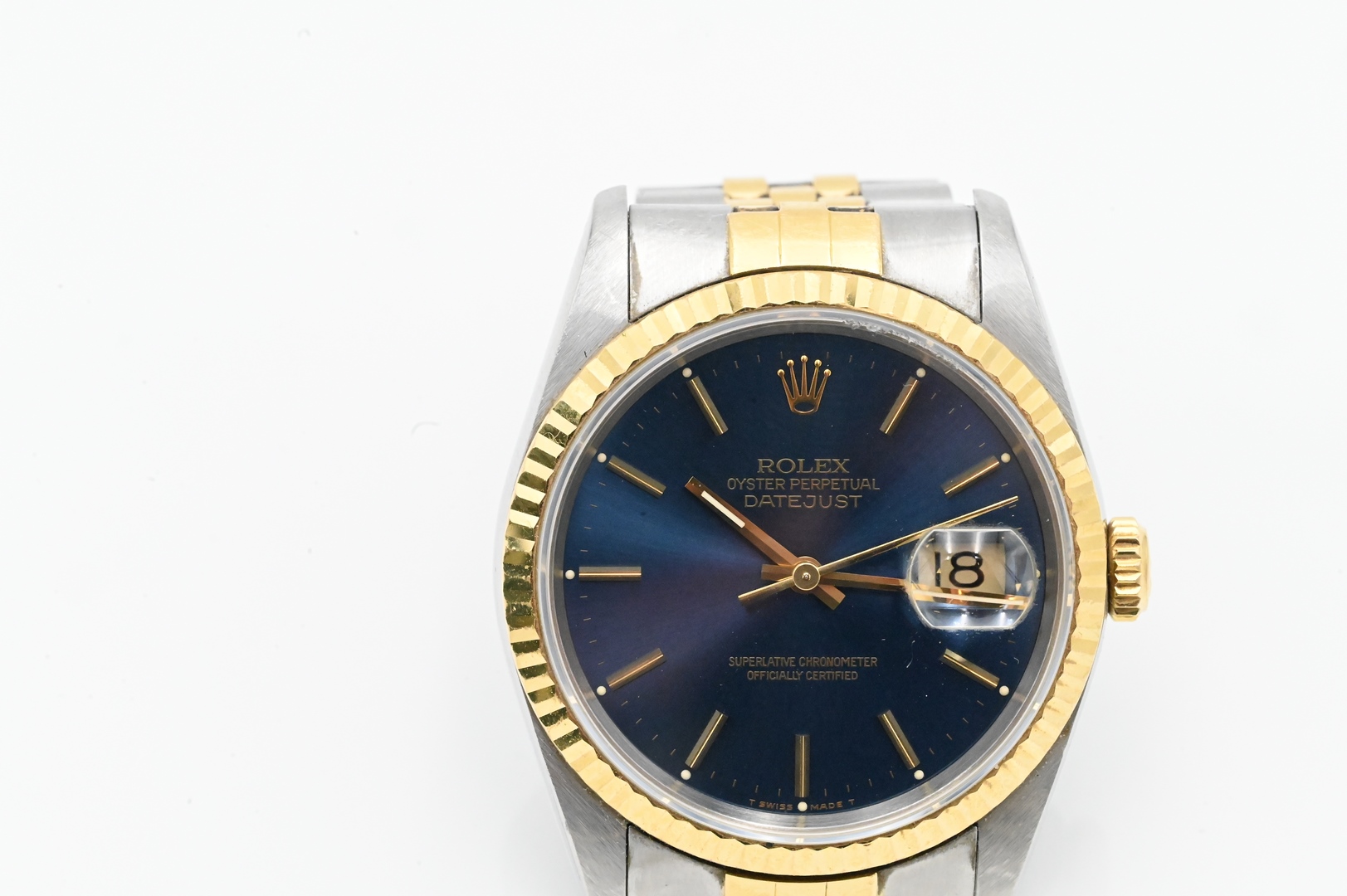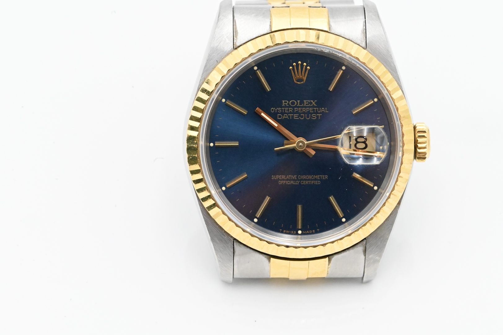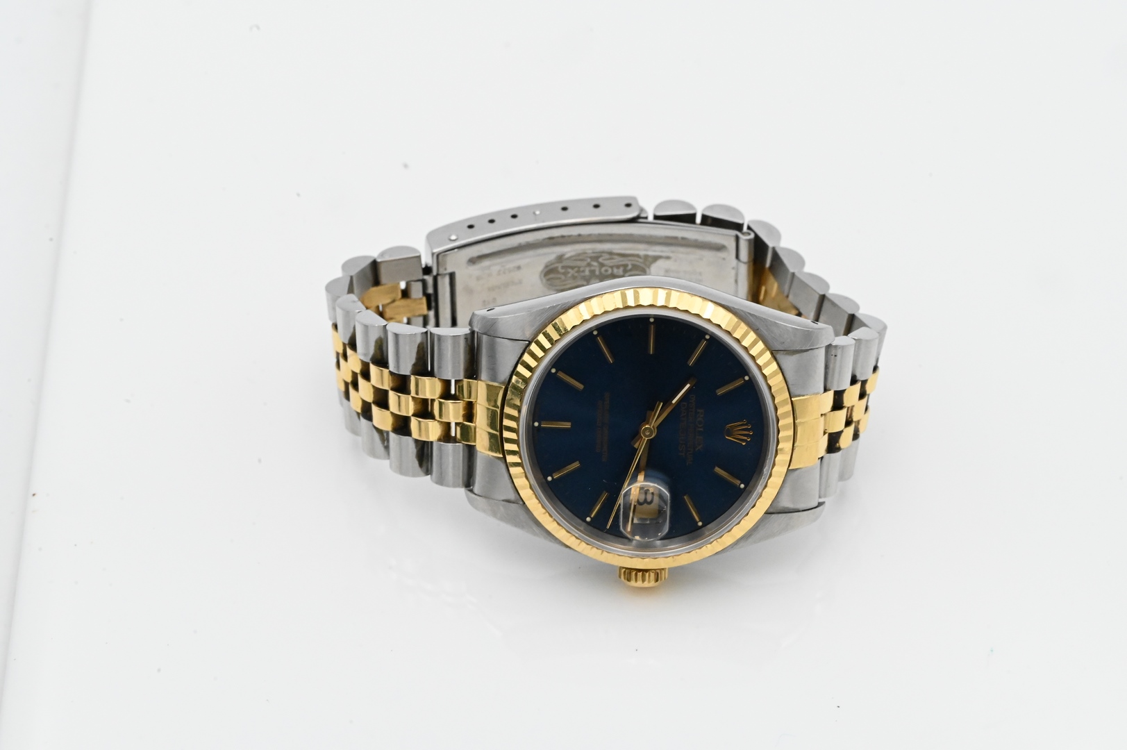 Rolex Datejust Gold and Stainless Men’s Wristwatch having blue dial, model # 16233, serial # E593527 35.6 millimeters