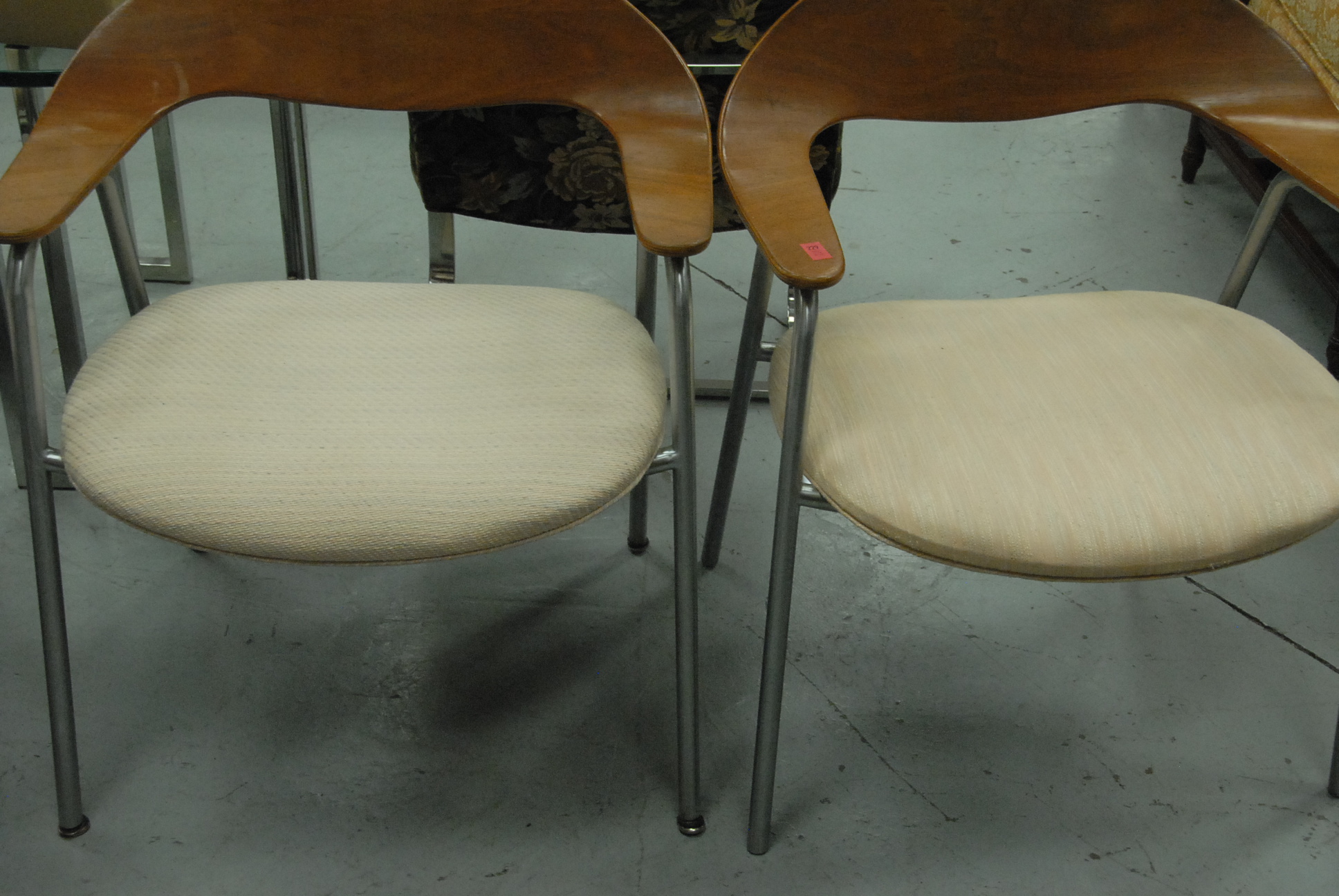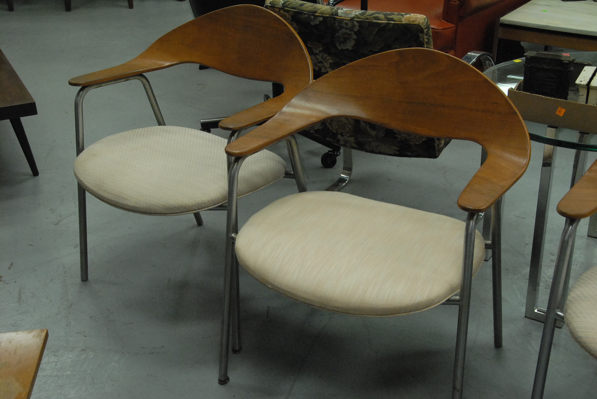 Lot 229: Set of four satin chrome and laminated walnut armchairs signed Marble Furniture Co. circa 1960.