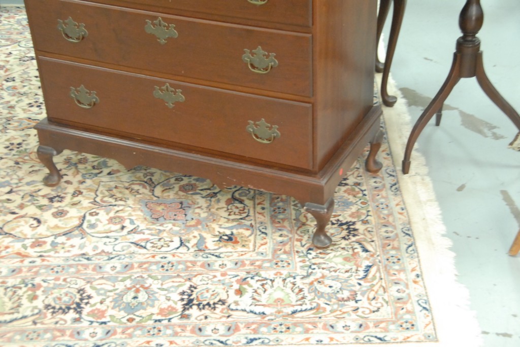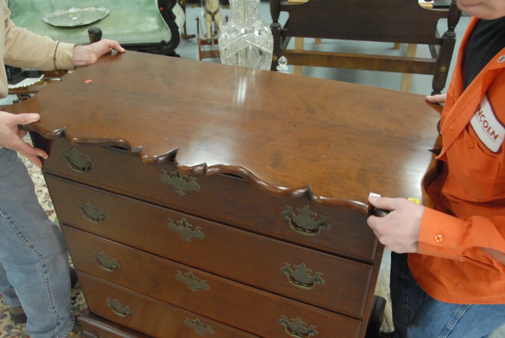 Lot 229: Shaped top four drawer cherry chest on base made into two parts, attributed to Whitmore, Middletown, Connecticut, ht. 31, wd. 36.