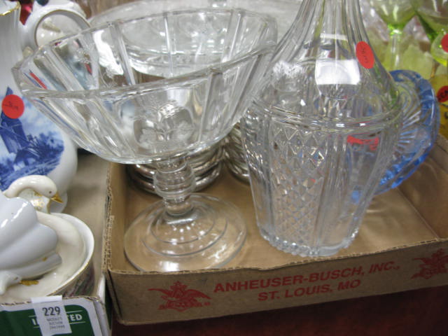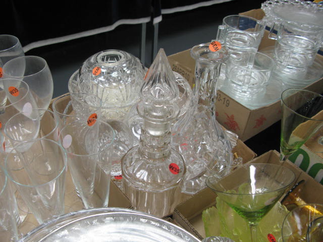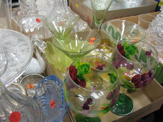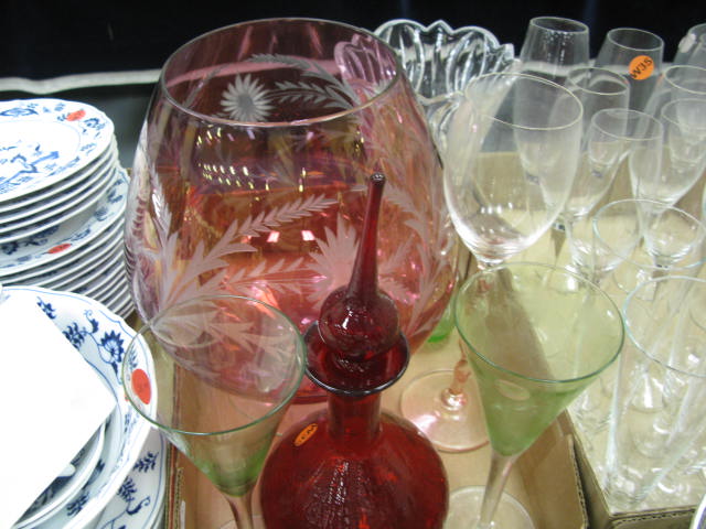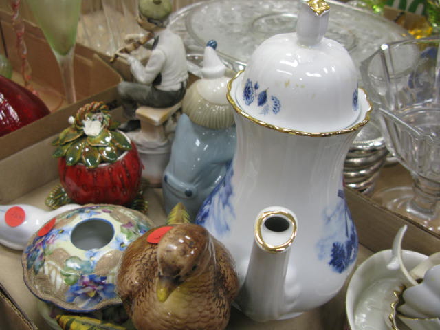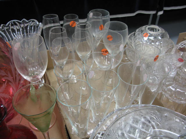 Six boxes of glass and china to include stemware, three decanters, gold decorated stemware, ruby glass, figures, porcelain birds, etc