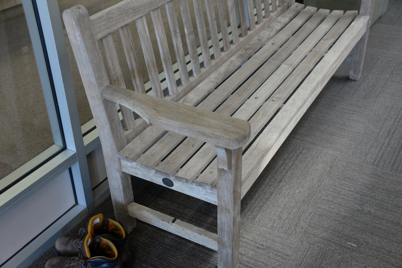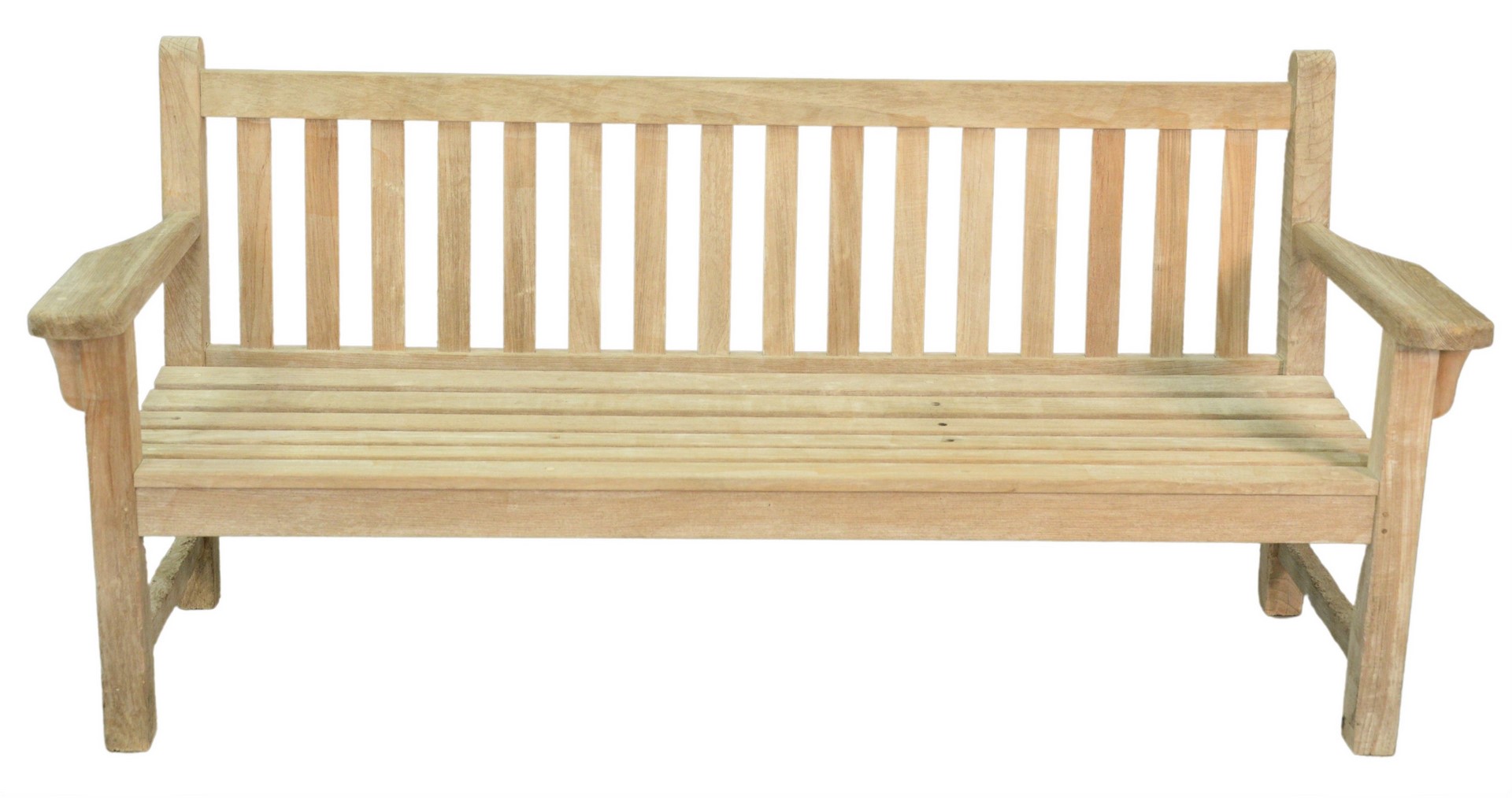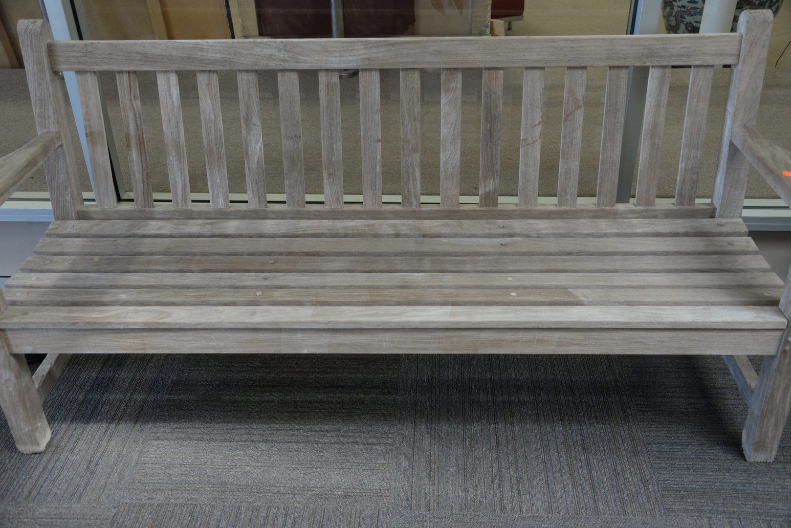 Teak Outdoor Bench, height 35 inches, length 75 inches.