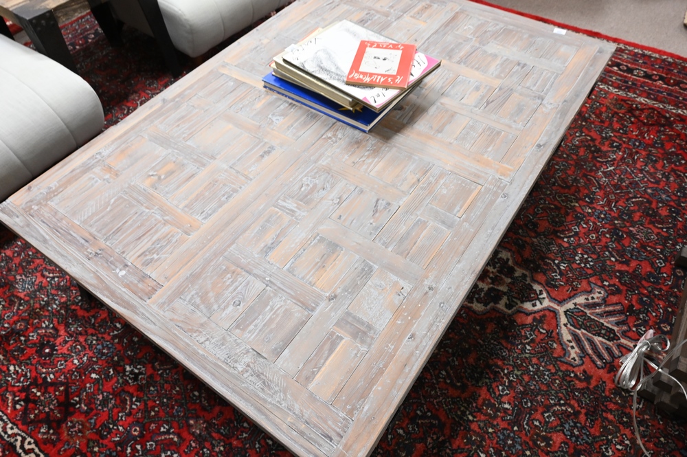 Three Piece Living Room Table Set, to include large barnwood style coffee table with iron base, and a pair of matching side stands with iron legs, coffee table height 16 1/2 inches, top 43″ x 63″.