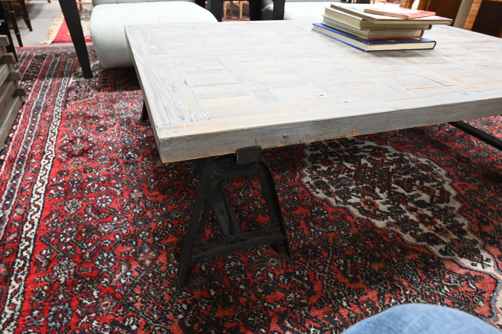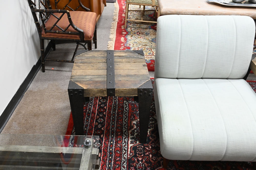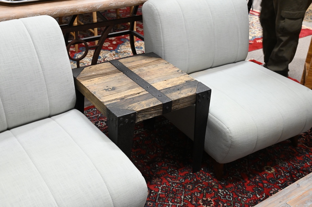 Lot 229: Three Piece Living Room Table Set, to include large barnwood style coffee table with iron base, and a pair of matching side stands with iron legs, coffee table height 16 1/2 inches, top 43″ x 63″.