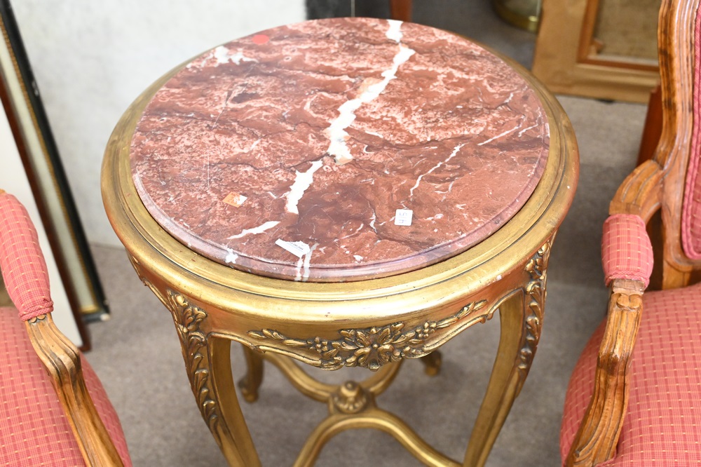 Three Piece Lot, to include Louis XV style fauteuil with custom upholstery and round gilt marble top table, height 29 inches, diamet…