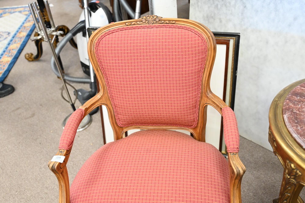 Lot 229: Three Piece Lot, to include Louis XV style fauteuil with custom upholstery and round gilt marble top table, height 29 inches, diameter 21 inches.